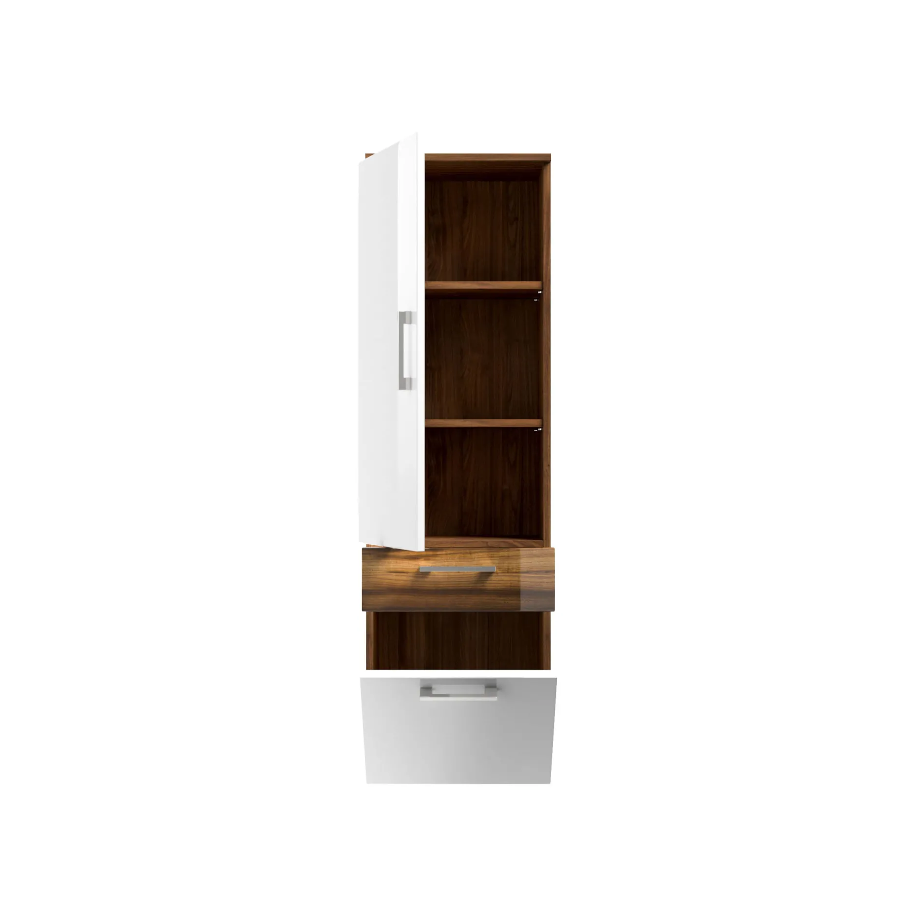 Deze stijlvolle badkamerkast heeft hoogglans spaanplaat-fronten gecombineerd met metalen hangrepen. Geruisloze sluiting van deuren, kleppen en lade dankzij het soft-close systeem. Gemakkelijk te plaatsen naast het bad meubel voor extra opbergruimte. Achter de deur bevinden zich 2 verstelbare legplanken. Door zijn melamine afwerking is deze kast beter schoon te houden en langer beschermd tegen stof en vuil. Gemakkelijk te monteren door middel van bijgeleverde montagehandleiding. Bekijk ook de andere elementen uit deze serie!