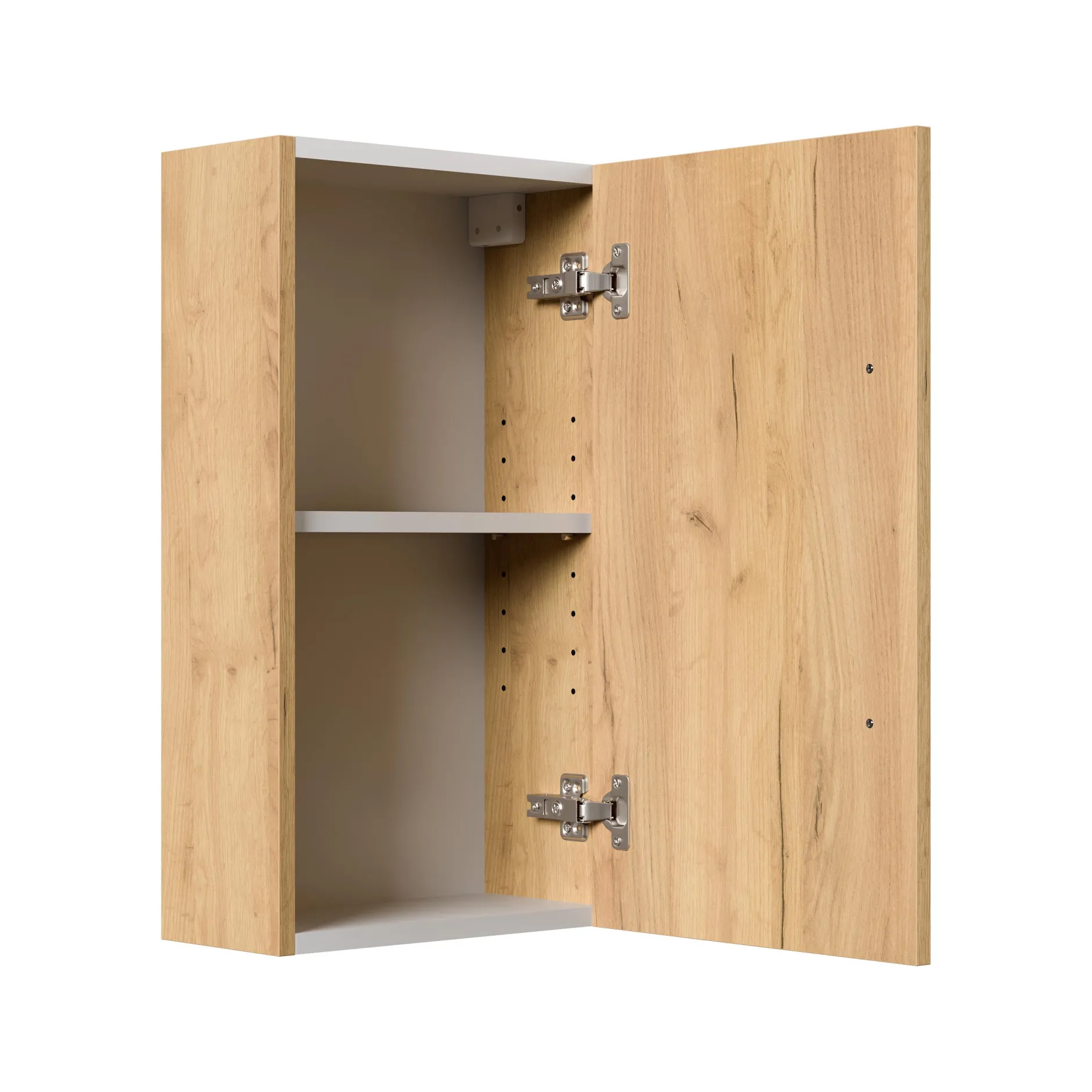 De Badkamerkast Houston Eiken 62 cm brengt een warme en natuurlijke sfeer in je badkamer. Ontworpen in Duitsland en vervaardigd uit hoogwaardig spaanplaat, is deze kast afgewerkt in een realistische eiken Gold-look voor een authentieke houtuitstraling. Met soft-close deuren en laden biedt deze kast praktische opbergruimte. De afmetingen zijn 35 cm breed, 62 cm hoog en 16,6 cm diep, en het gewicht bedraagt 8 kg.