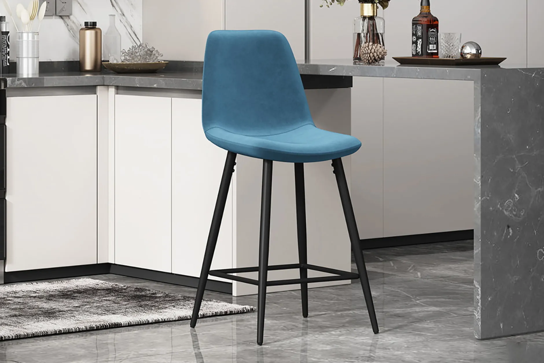 Deze praktische en betaalbare barkruk heeft metalen poten en een velours bekleding. Deze barkruk heeft een zithoogte van 64 cm en een zitdiepte van 38 cm en is verkrijgbaar in verschillende kleuren.