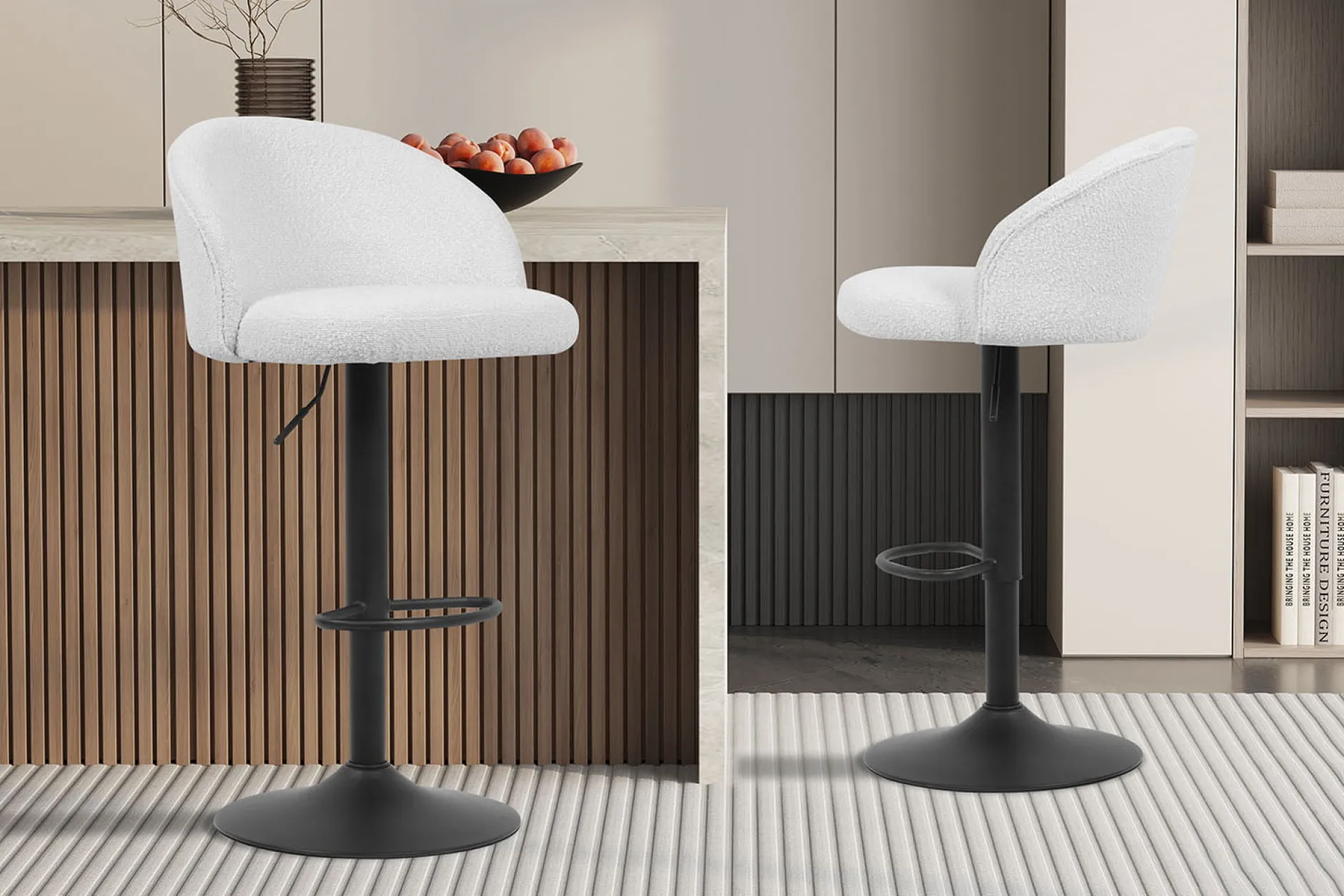 Deze set van twee witte Babet barkrukken voegt stijl en comfort toe aan je keuken of bar. Met hun moderne Bouclé bekleding en in hoogte verstelbare ontwerp, zijn ze perfect voor elke gelegenheid. De minimale zithoogte is 63 cm en de maximale zithoogte is 84 cm, waardoor je ze kunt aanpassen aan jouw keukeneiland of bartafel. De zitdiepte is royaal, met 46 cm ruimte om comfortabel te zitten.
