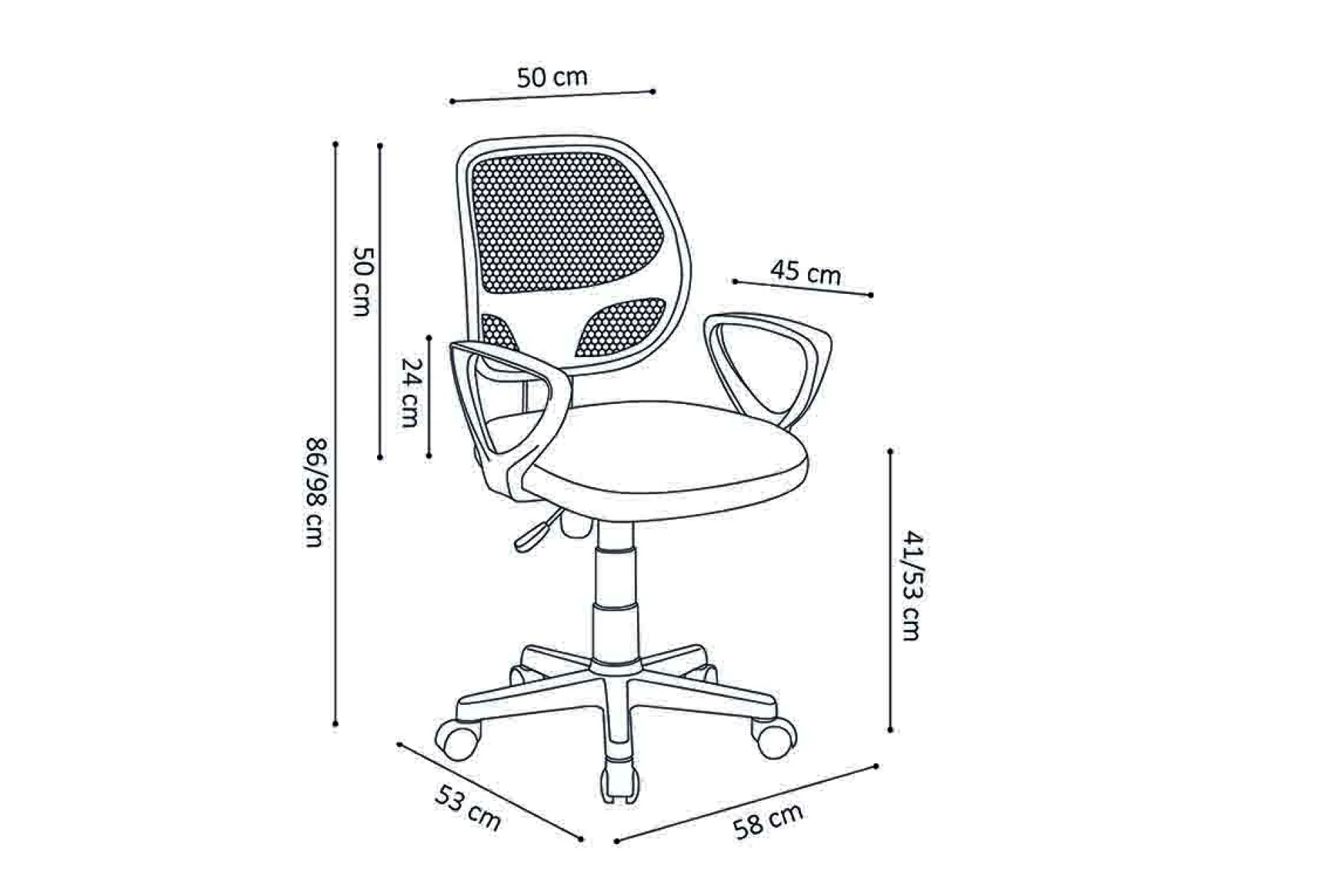 Leuke (kinder-) bureaustoel in meerdere kleuren. De zithoogte van de bureaustoel is in hoogte verstelbaar van 41 cm tot 53 cm en het zitvlak heeft een polyester bekleding.