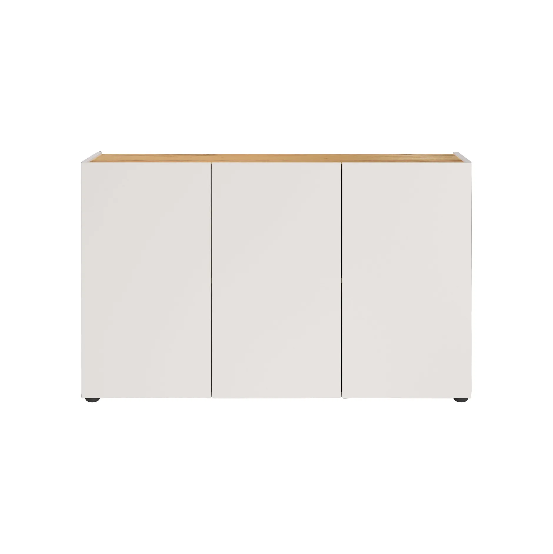 Het dressoir Orlando Kasjmier 120 cm combineert een eigentijds ontwerp met praktische opbergruimte. Het meubel heeft drie deuren met daarachter verstelbare planken, belastbaar tot 10 kg per plank. De handgreeploze deuren sluiten zacht dankzij de geïntegreerde demping. De kasjmier en Navarra eiken afwerking zorgen voor een warme, moderne uitstraling.