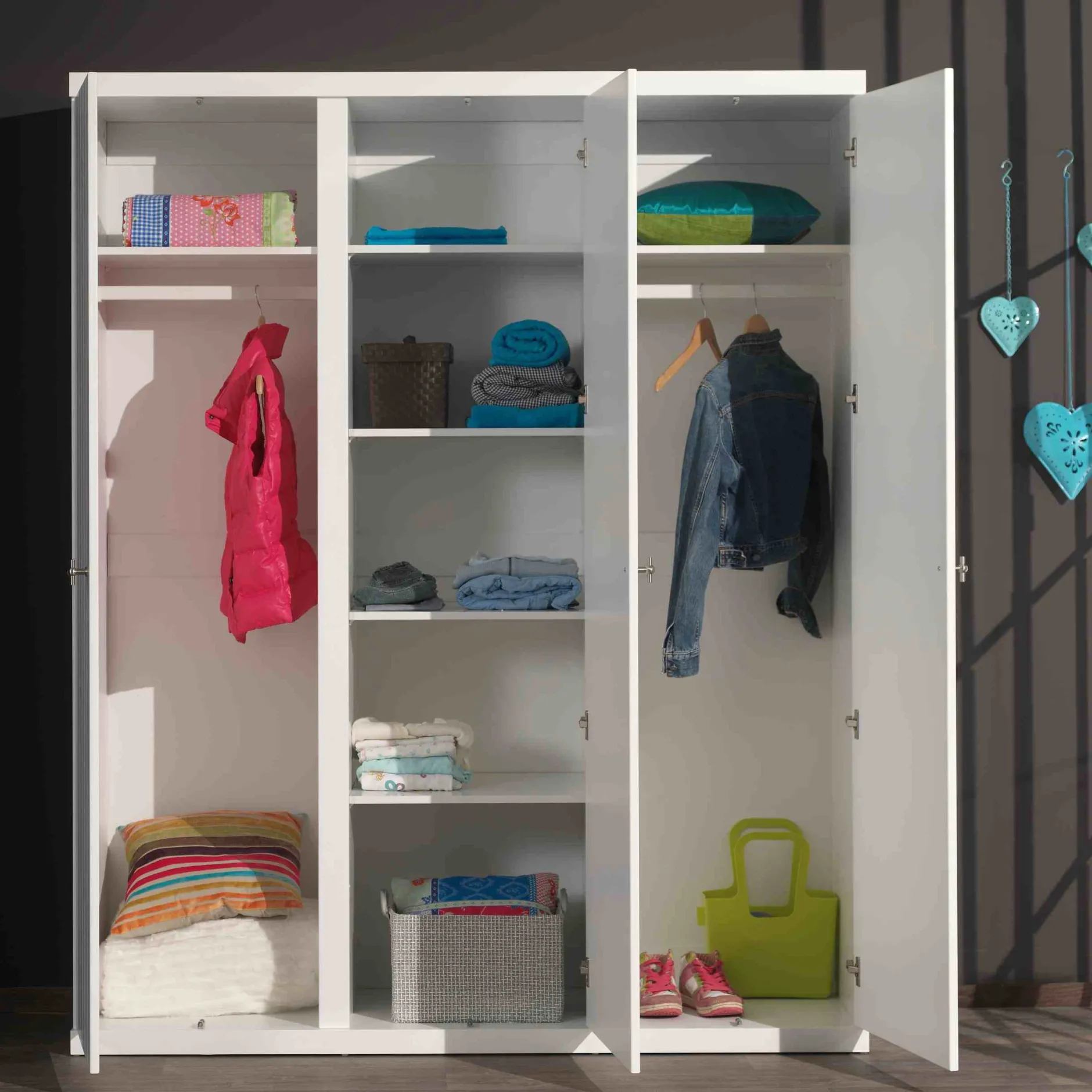 Deze 3-deurs-kledingkast heeft achter de 2 linkerdeuren links boven een legpank, waaronder een kledingroede, achter de rechter deur bevinden zich 4 legplanken. Achter de rechterdeur bevindt zich boven een legplank en daaronder een kledingroede. De deuren en zijkanten van de kast zijn vervaardigd uit hoogwaardig MDF met verticale infrezingen, wat de kast een aparte look geeft.