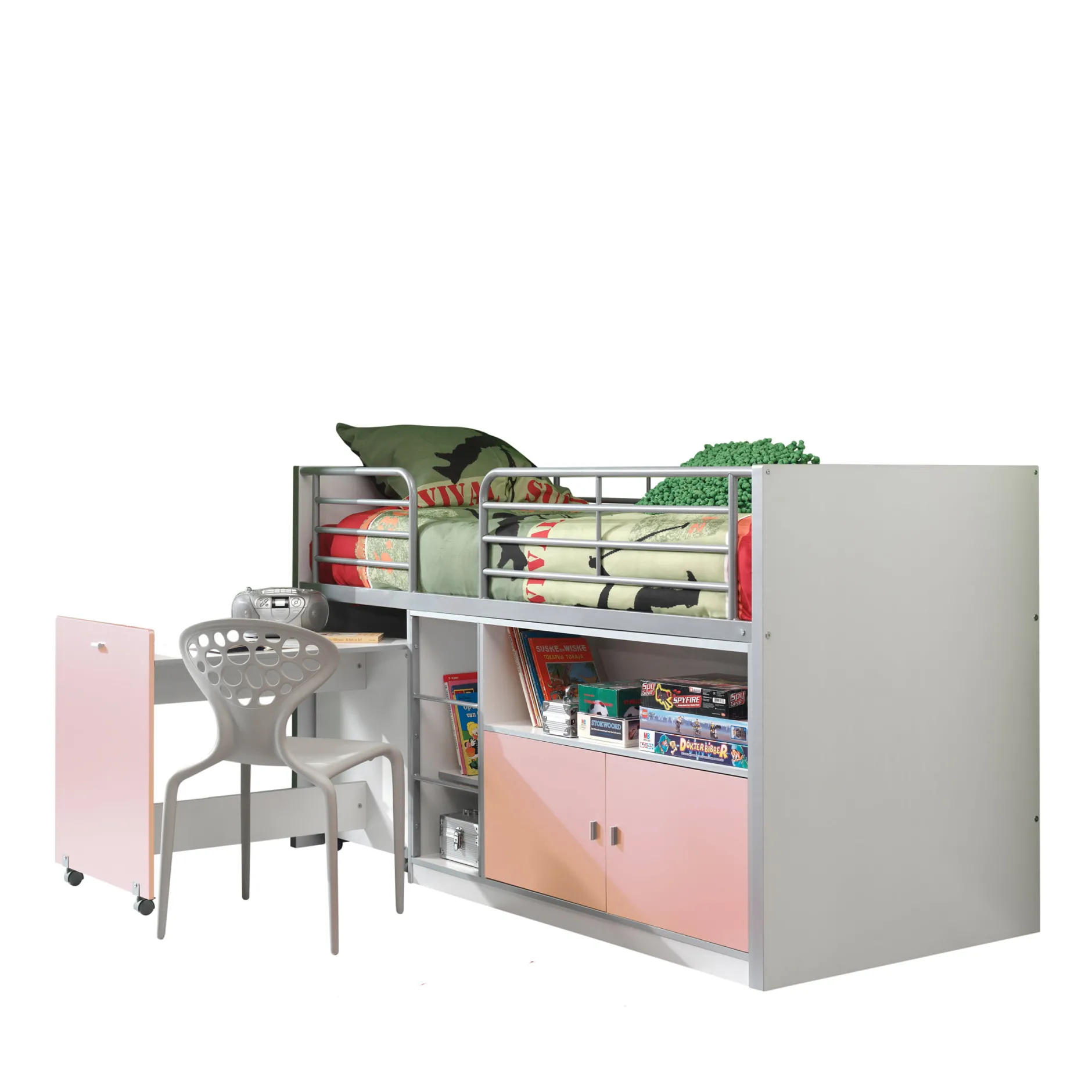 Deze strak gevormde halfhoogslaper met roze gelakte voorfronten heeft links een handig uitschuifbaar volwaardig bureau, middenin 3 open vakken en rechts 2 roze gelakte deuren met daarboven nog een breed open vak. De 2 metalen uitvalhekken zorgen voor een prima bescherming. Het bed is inclusief een houten lattenbodem, maar een matras van 90×200 cm. dien je wel los bij te bestellen. In de collectie van huisenthuis.nl heb je hierin een prima assortiment.