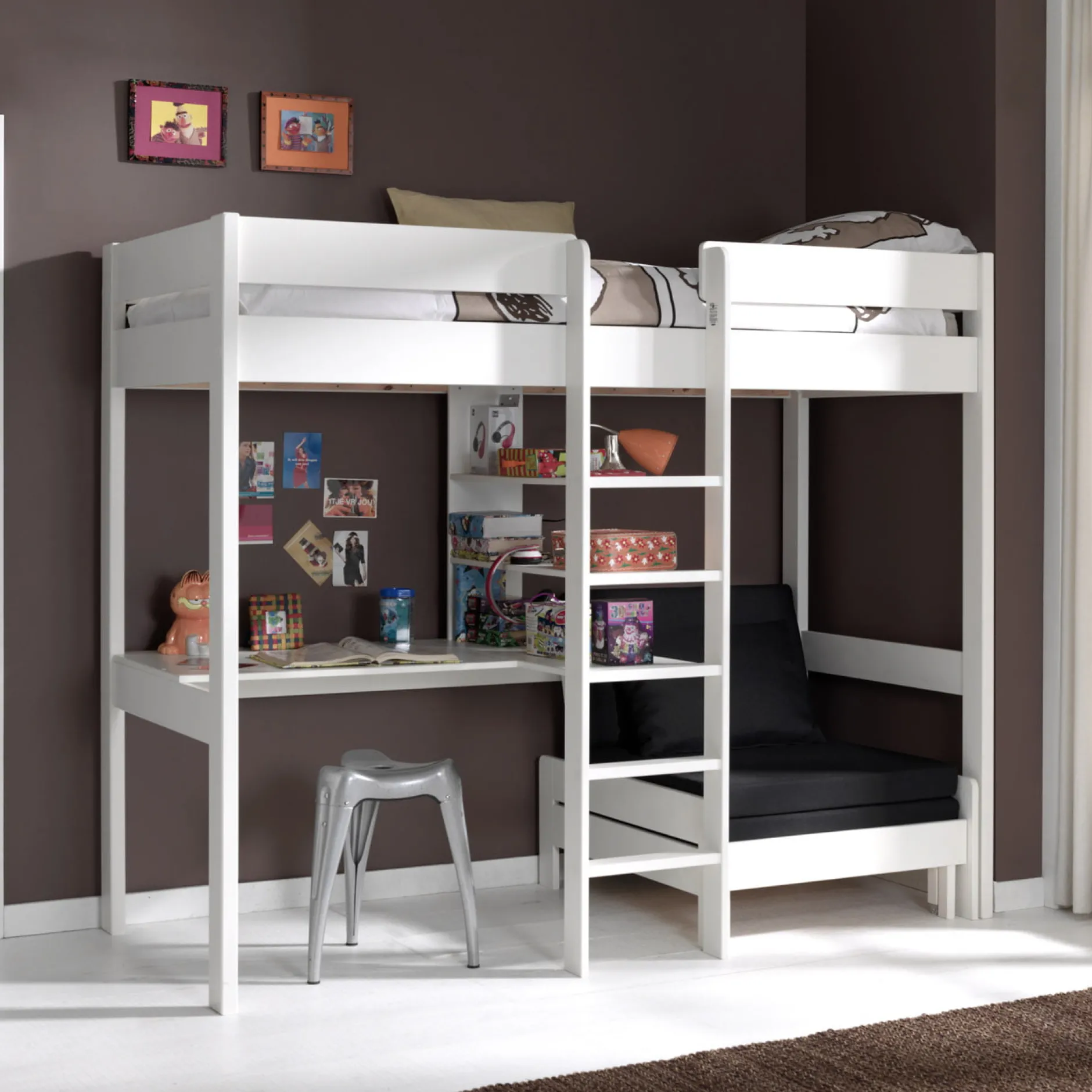 Deze multifunctionele hoogslaper is een aanwinst voor elke kinderkamer. De hoogslaper is vervaardigd uit Scandinavisch grenen en is wit gelakt. Links van de trap is een bureaublad met aan de rechterzijde 2 planken om al je spullen op kwijt te kunnen. Rechts van de trap is een zetelbed, deze kan gebruikt worden om op te zitten of uitgeschoven worden om te gebruiken als logeerbed. Het is ook mogelijk dit om te wisselen. De lattenbodems en de matras van het zetelbed zijn inbegrepen. In het bed past een matras van 90×200 cm.
