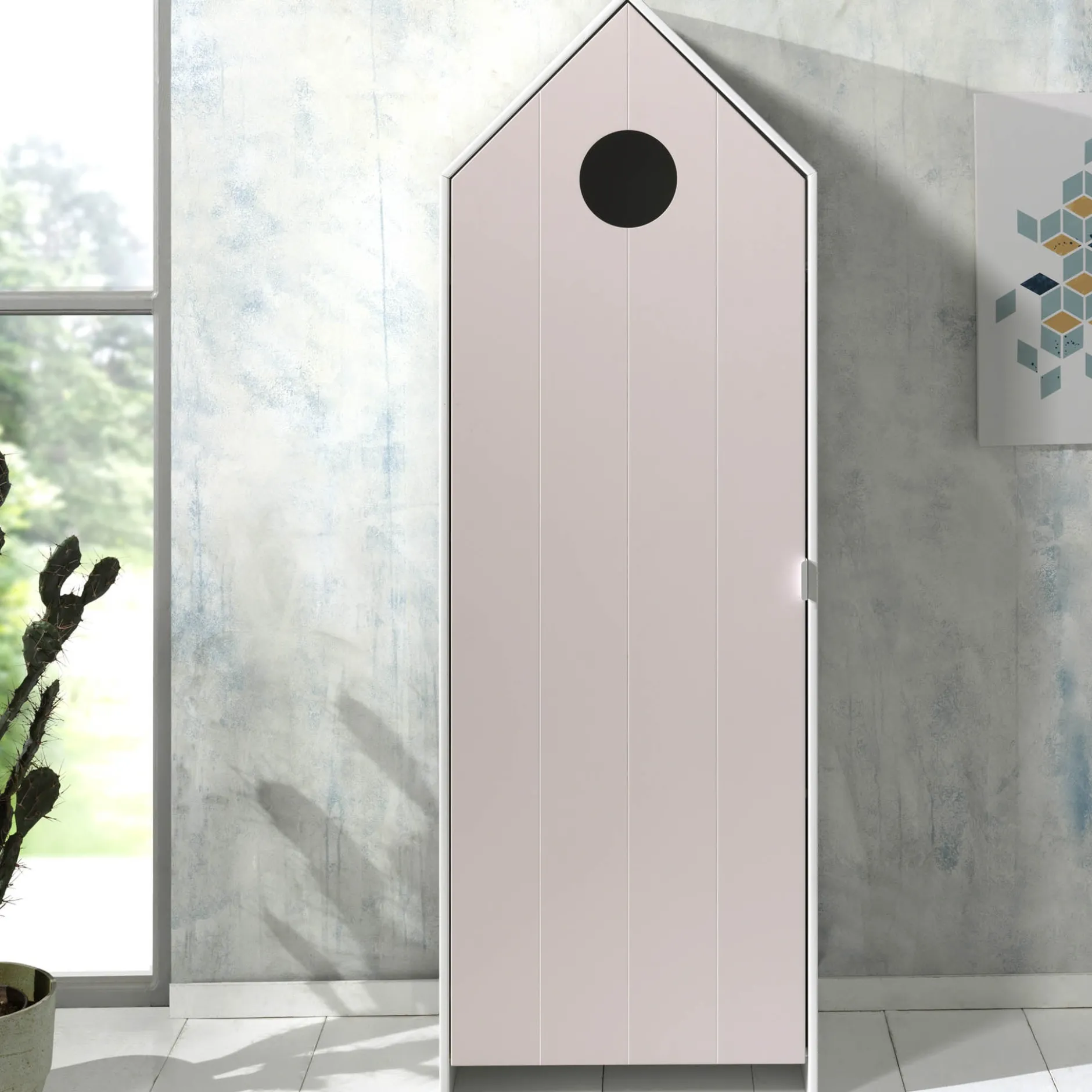 Deze speelse kledingkast is een aanwinst voor in elke kinderkamer. De kast is vervaardigd uit MDF en afgewerkt in een witte lak, de deur is afgewerkt met een roze lak. Achter de deur bevinden zich 3 legplanken, naar wens kunnen 1 of 2 legplanken weggelaten worden om de bijgeleverde kledinghanger te gebruiken. Richt je gehele kinderkamer in met alle meubelen uit deze serie!