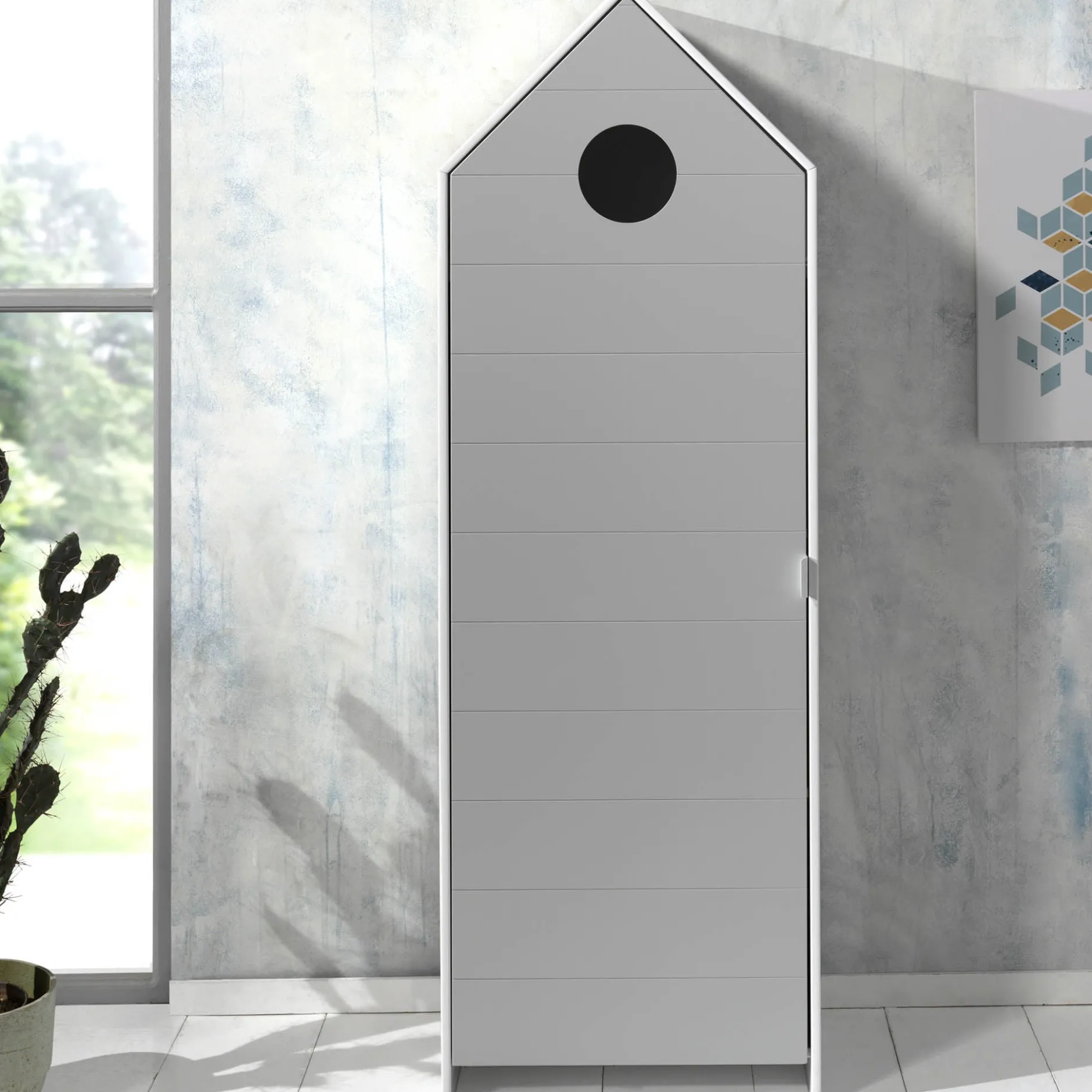 Deze speelse kledingkast is een aanwinst voor in elke kinderkamer. De kast is vervaardigd uit MDF en afgewerkt in een witte lak, de deur is afgewerkt met een grijze lak. Achter de deur bevinden zich 3 legplanken, naar wens kunnen 1 of 2 legplanken weggelaten worden om de bijgeleverde kledinghanger te gebruiken. Richt je gehele kinderkamer in met alle meubelen uit deze serie!