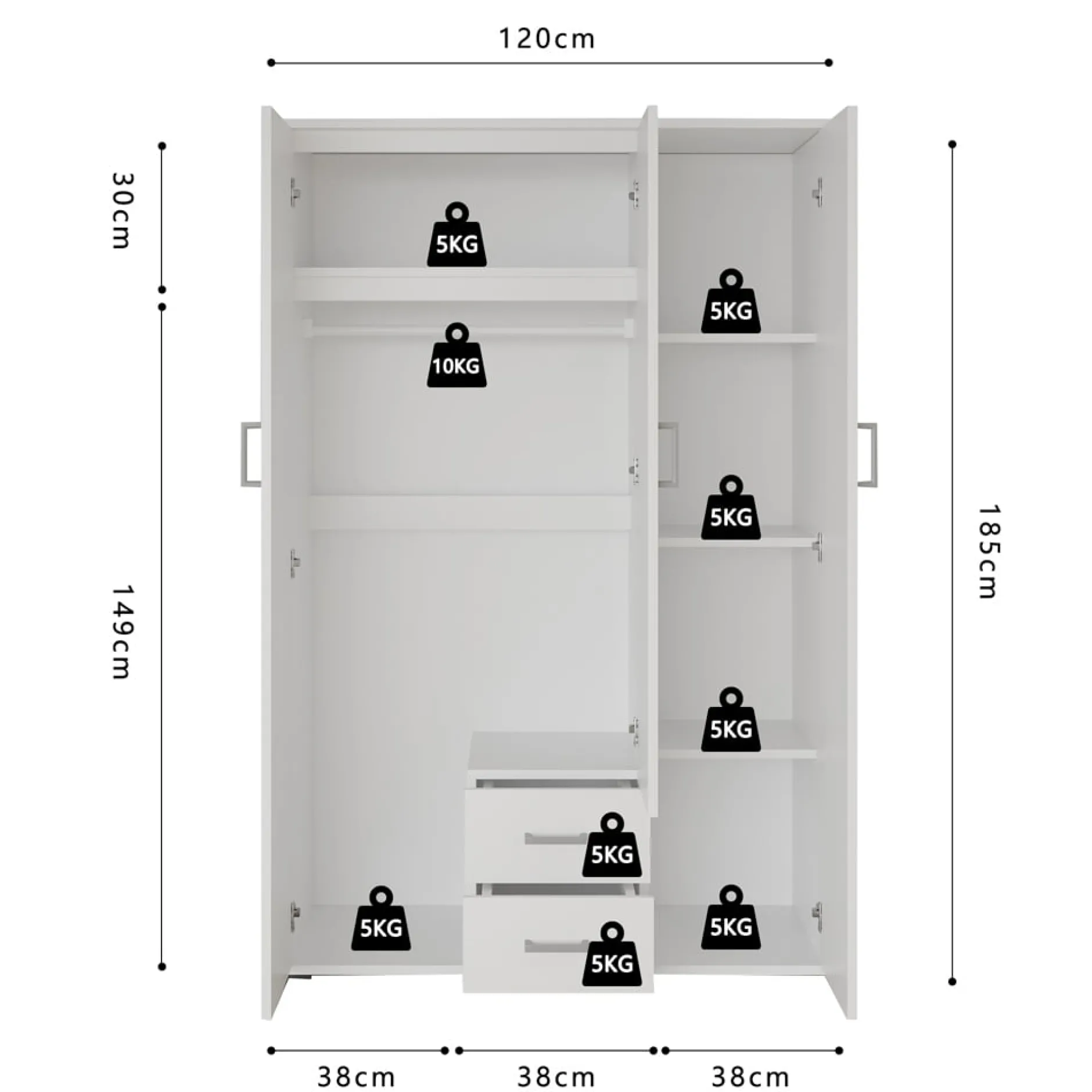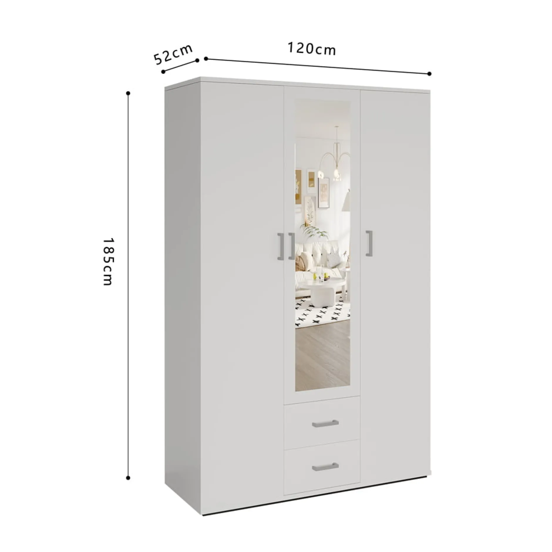 De Kledingkast Jean 3-deurs is de ideale keuze voor wie op zoek is naar stijl en functionaliteit in één. Met een breedte van 120 cm, een hoogte van 185 cm en een diepte van 52 cm biedt deze kast volop ruimte voor het opbergen van al je kleding en accessoires.