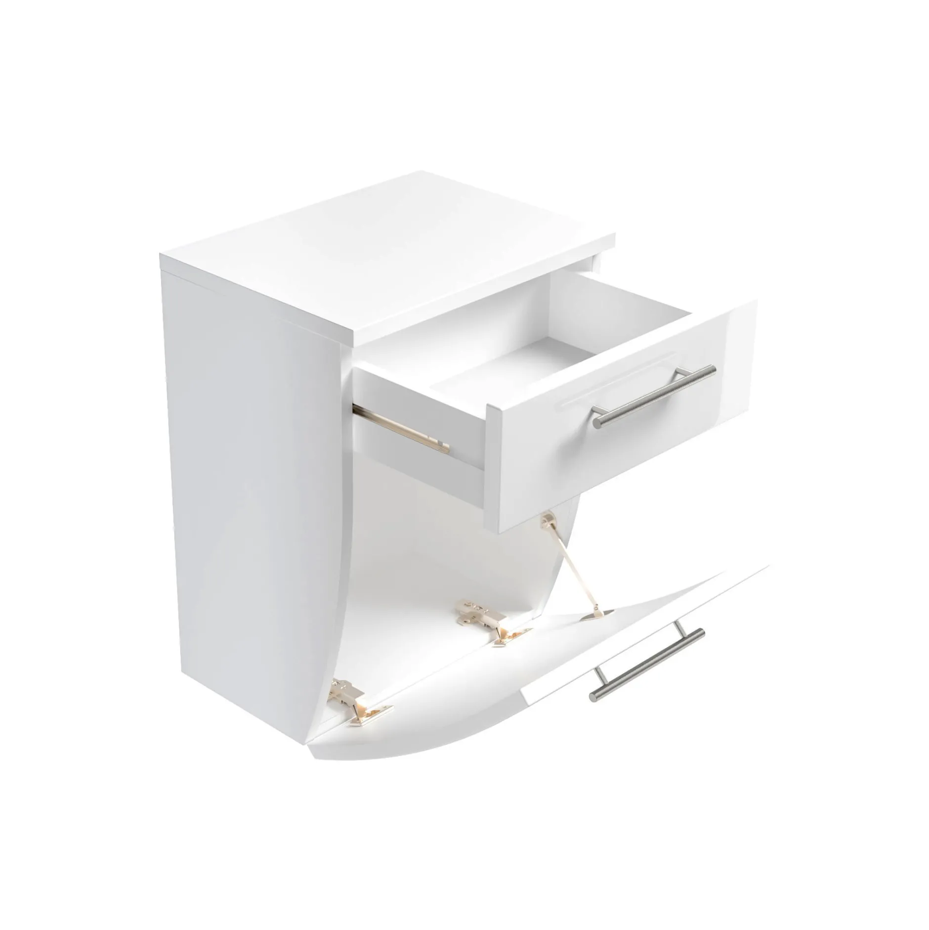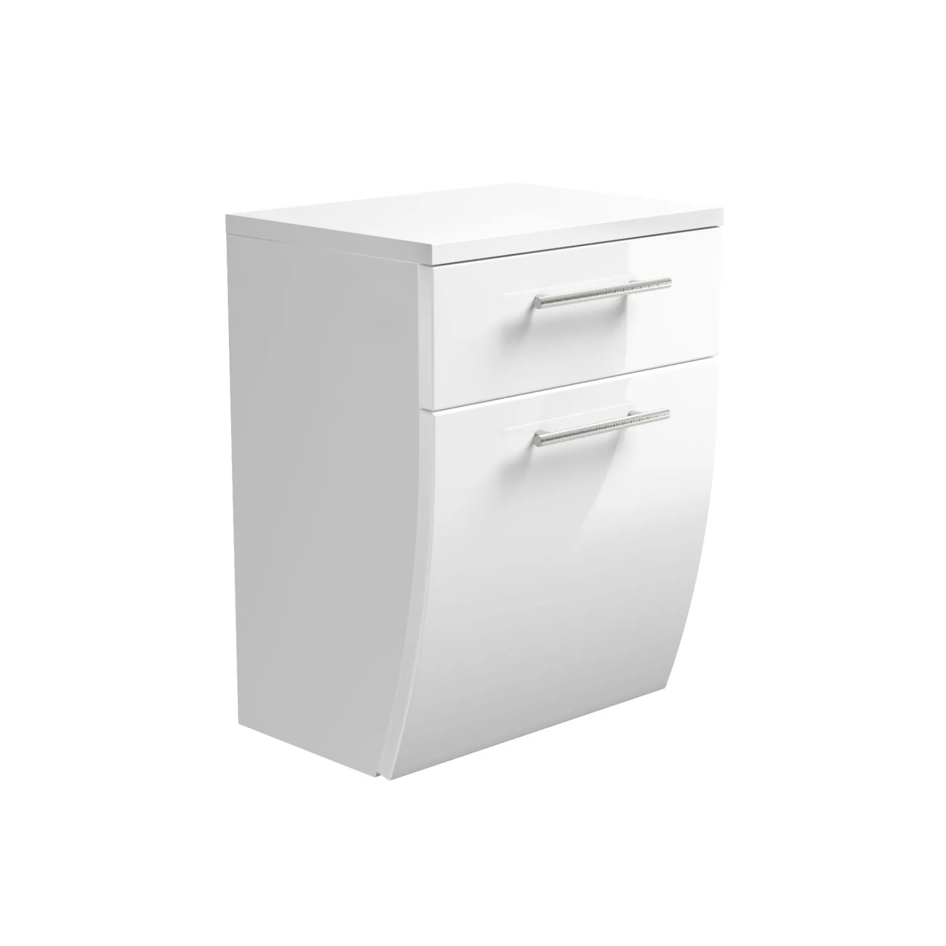 Deze klassieke badkamer kast biedt voldoende opbergruimte voor al je badkamerbenodigdheden. In de lade kun je gemakkelijk je dagelijks spullen kwijt, achter de gebogen klep de schone handdoeken. De hoogglans fronten in combinatie met de metalen handgrepen maken deze kast af. Door zijn melamine afwerking is deze kast gemakkelijk schoon te houden en langer beschermd tegen stof, vuil en krassen. Richt je badkamer in één keer helemaal in met de bijpassende meubelen uit deze serie!