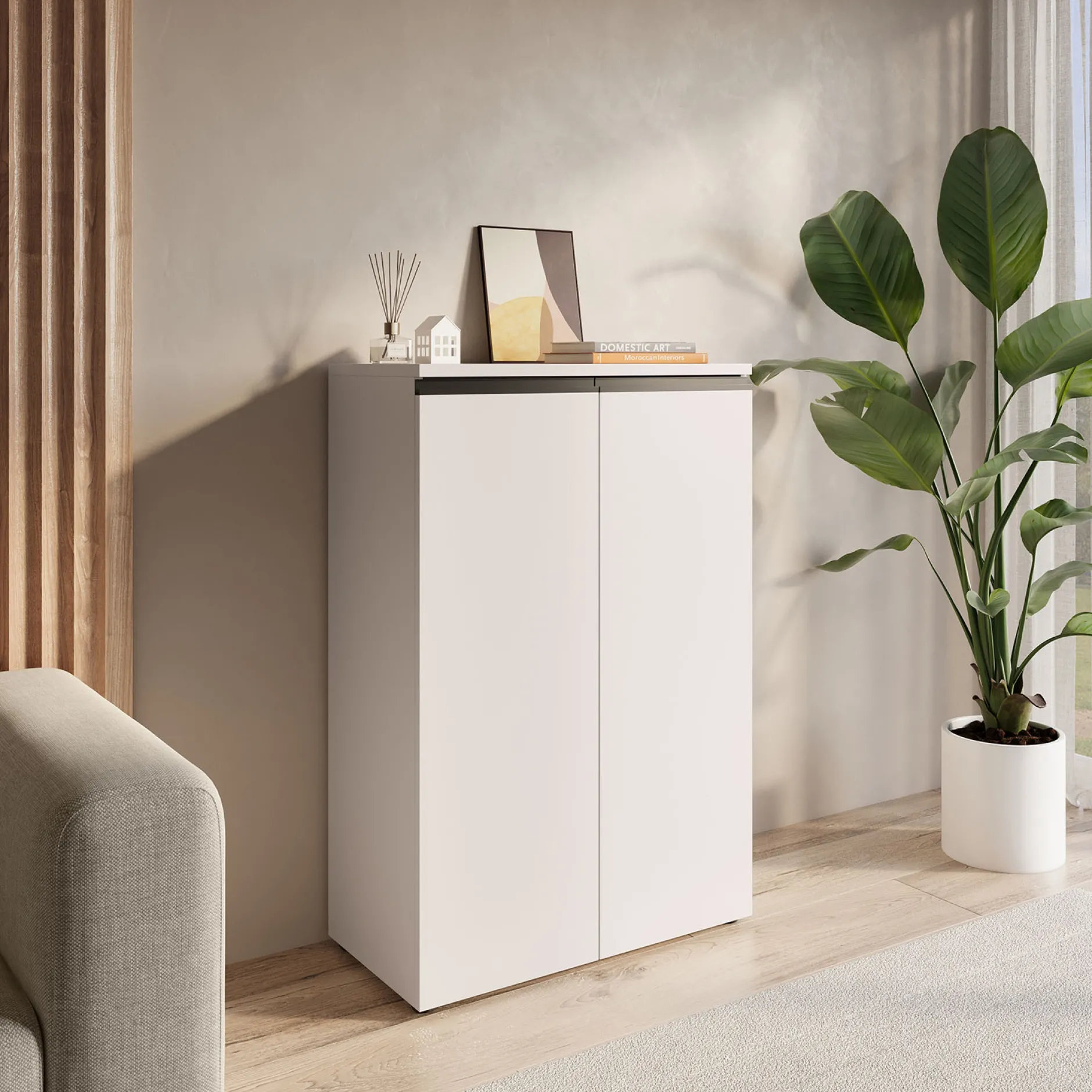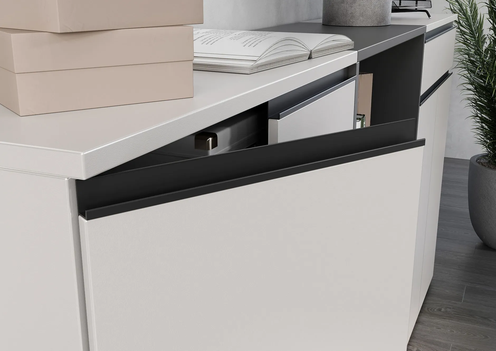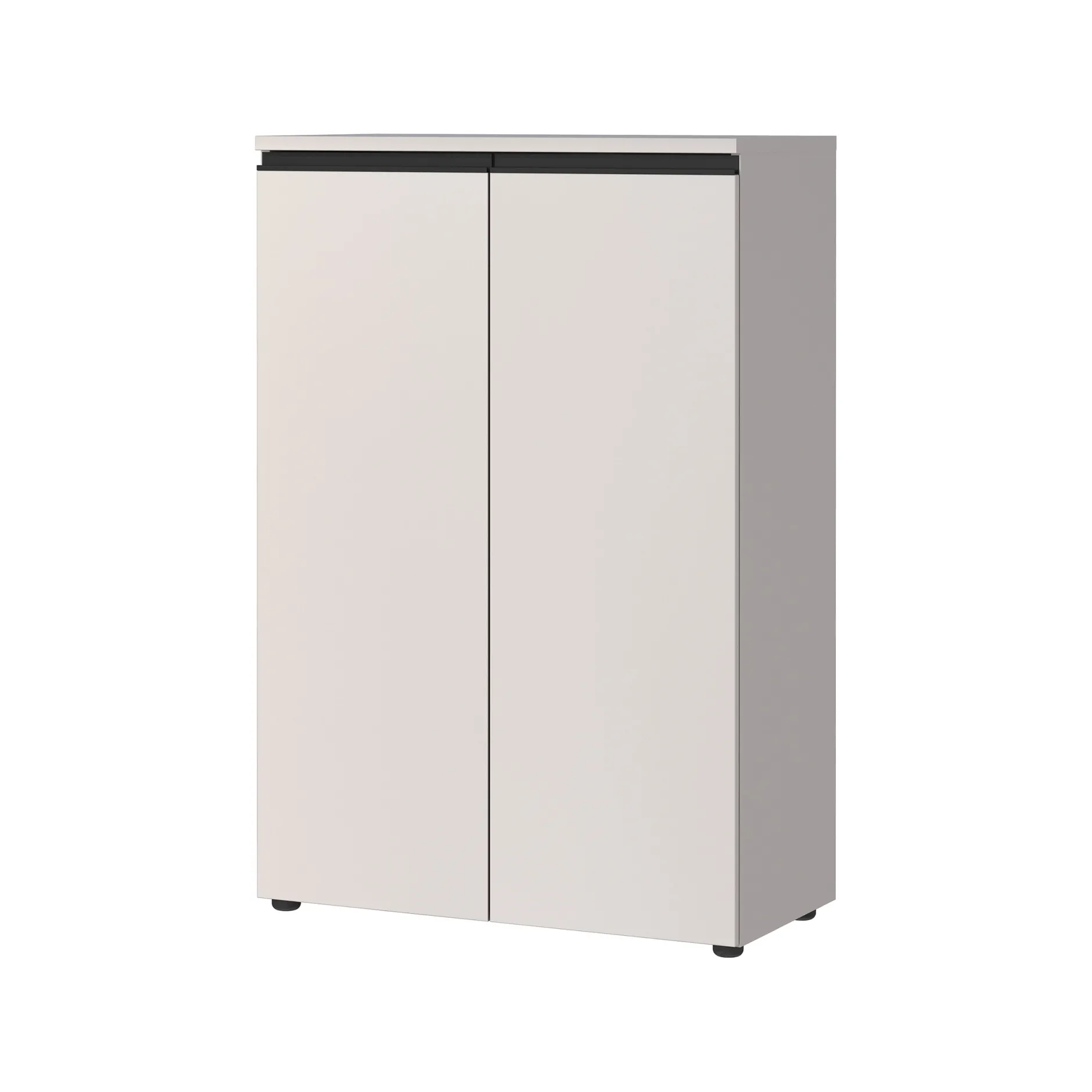 De lage kantoorkast Chicago Kasjmier combineert functionaliteit met een modern design. Achter de twee deuren bevinden zich twee verstelbare legborden die elk tot 10 kg kunnen dragen. Het bovenblad is belastbaar tot 10 kg, terwijl het onderste legbord een maximale belasting van 30 kg heeft. De kast is voorzien van een krasbestendige afwerking en geïntegreerde soft-close deuren.