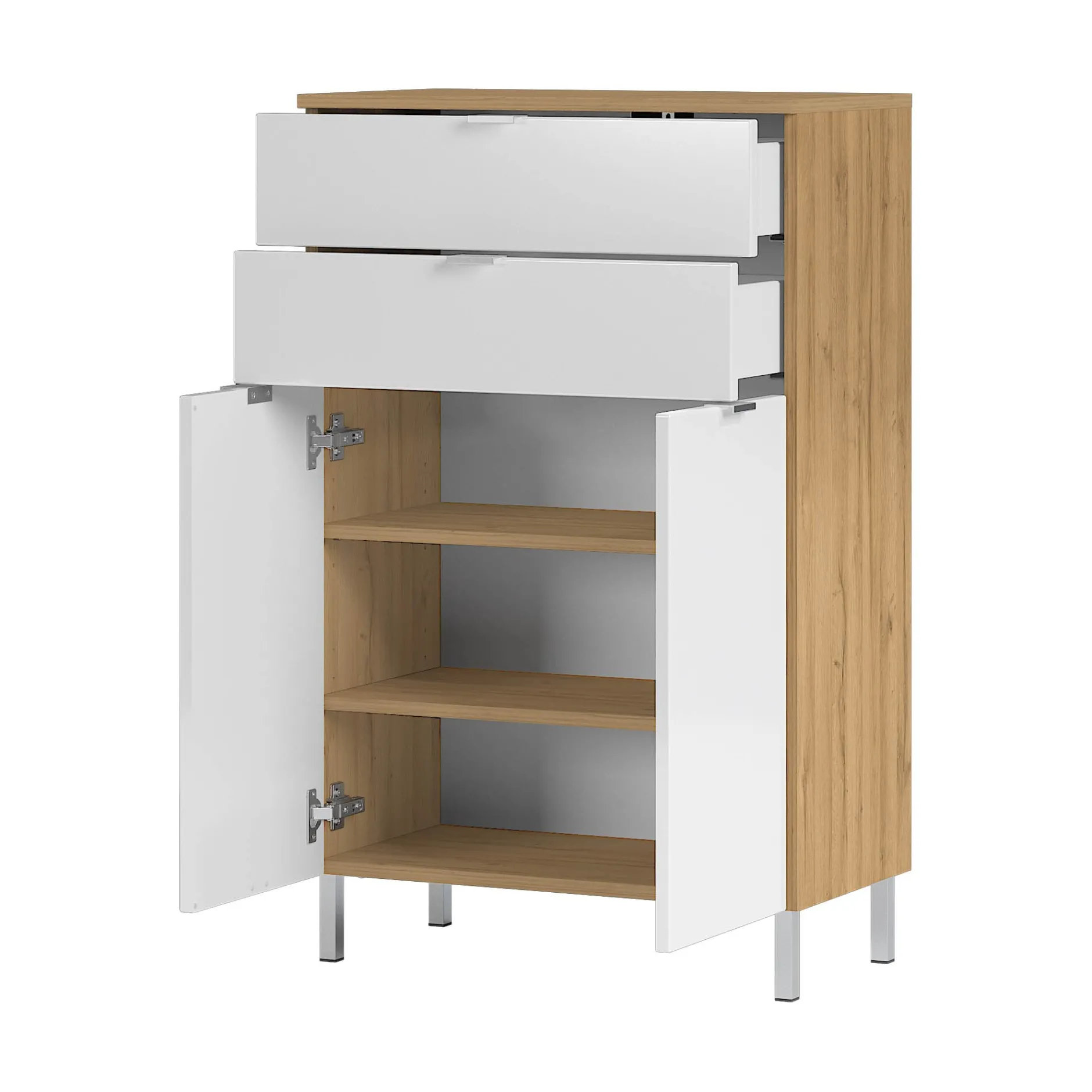 Met deze stijlvolle badkamerkast geef je je badkamer snel een luxe uitstraling. De badkamerkast heeft twee laden en 2 deuren met daar achter twee verstelbare legplanken waardoor er voldoende ruimte is om al je spullen op te bergen. Allen voorzien van soft-close waardoor ze geruisloos sluiten. Het meubel is afgewerkt met een degelijke melamine waardoor deze goed schoon te maken is. Maak je badkamer compleet met de andere meubelen uit deze serie.