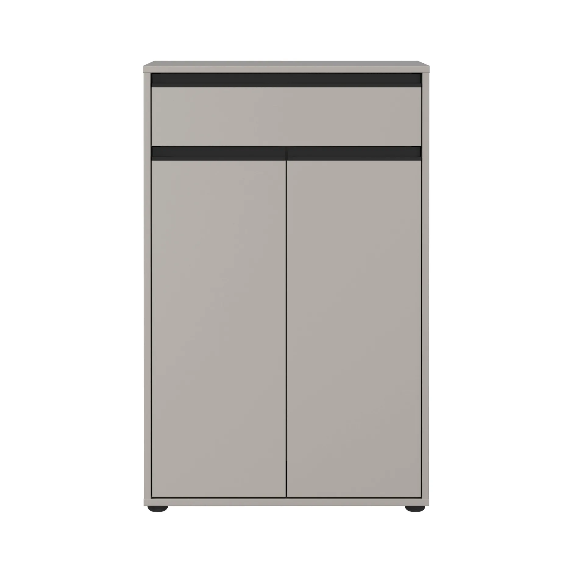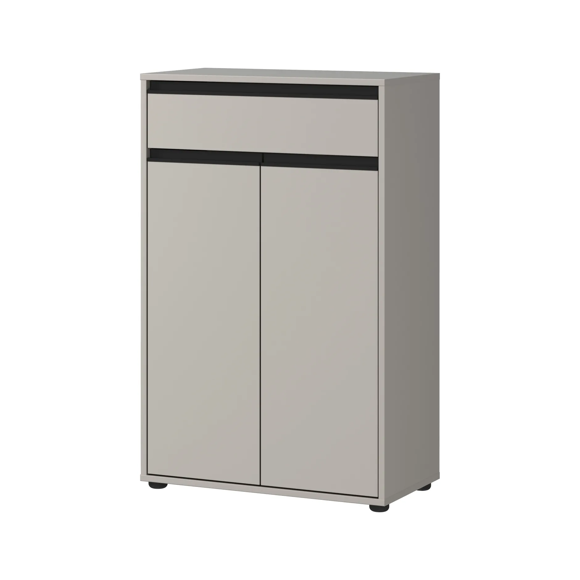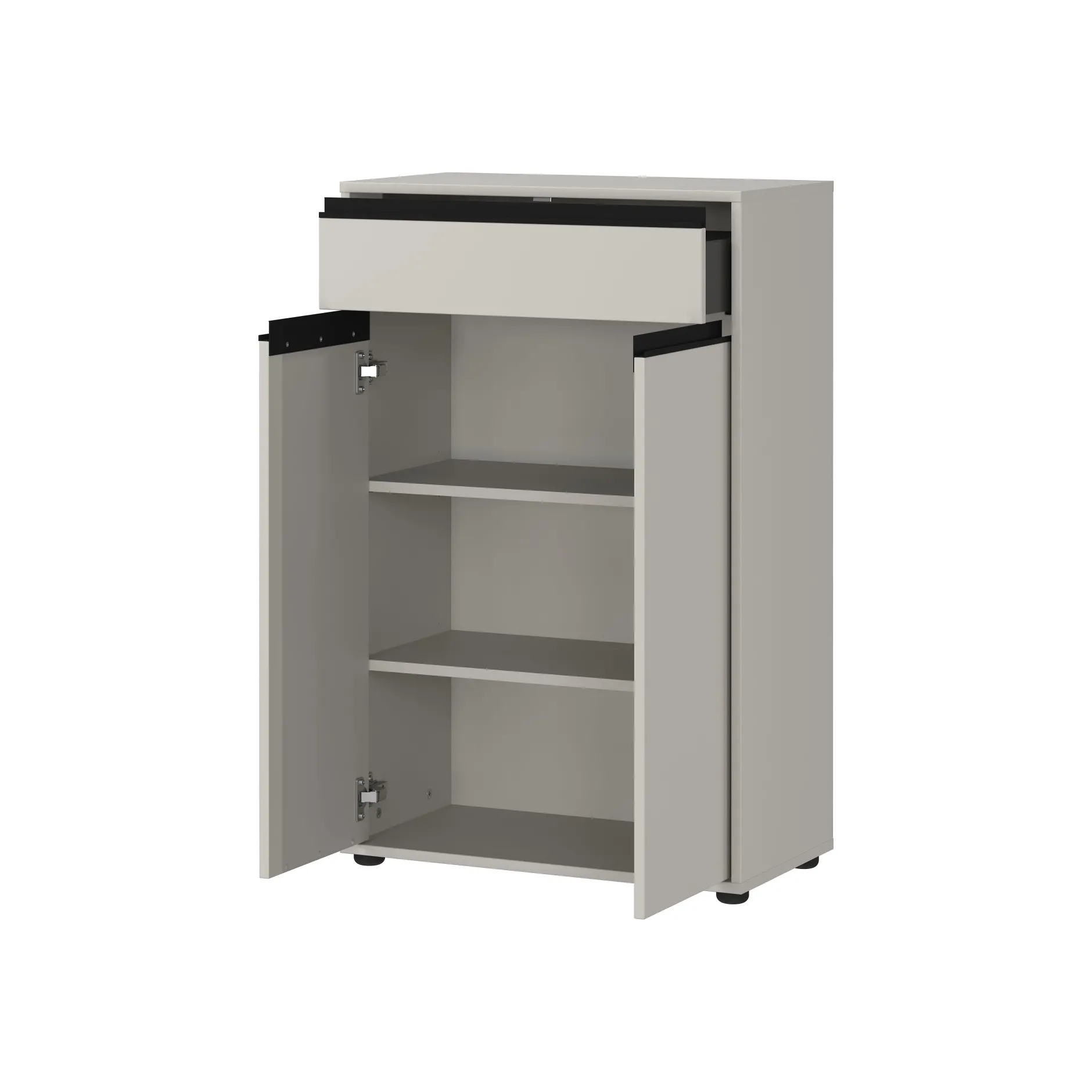 De opbergkast Pula Lichtgrijs 63 cm is een veelzijdig meubelstuk met een lade, twee deuren en twee verstelbare planken. De lade kan tot 10 kg dragen, terwijl de planken elk belastbaar zijn tot 10 kg. De bovenste plank is geschikt voor een gewicht tot 5 kg, terwijl de onderste plank tot 10 kg kan dragen. De kast heeft drie zwarte metalen handgrepen en vier stevige kunststof meubelglijders. Dankzij de krasbestendige melamine coating en de stootvaste ABS-randen blijft het meubel er langdurig netjes uitzien. De deuren en lade sluiten zachtjes en geruisloos dankzij de geïntegreerde demping.