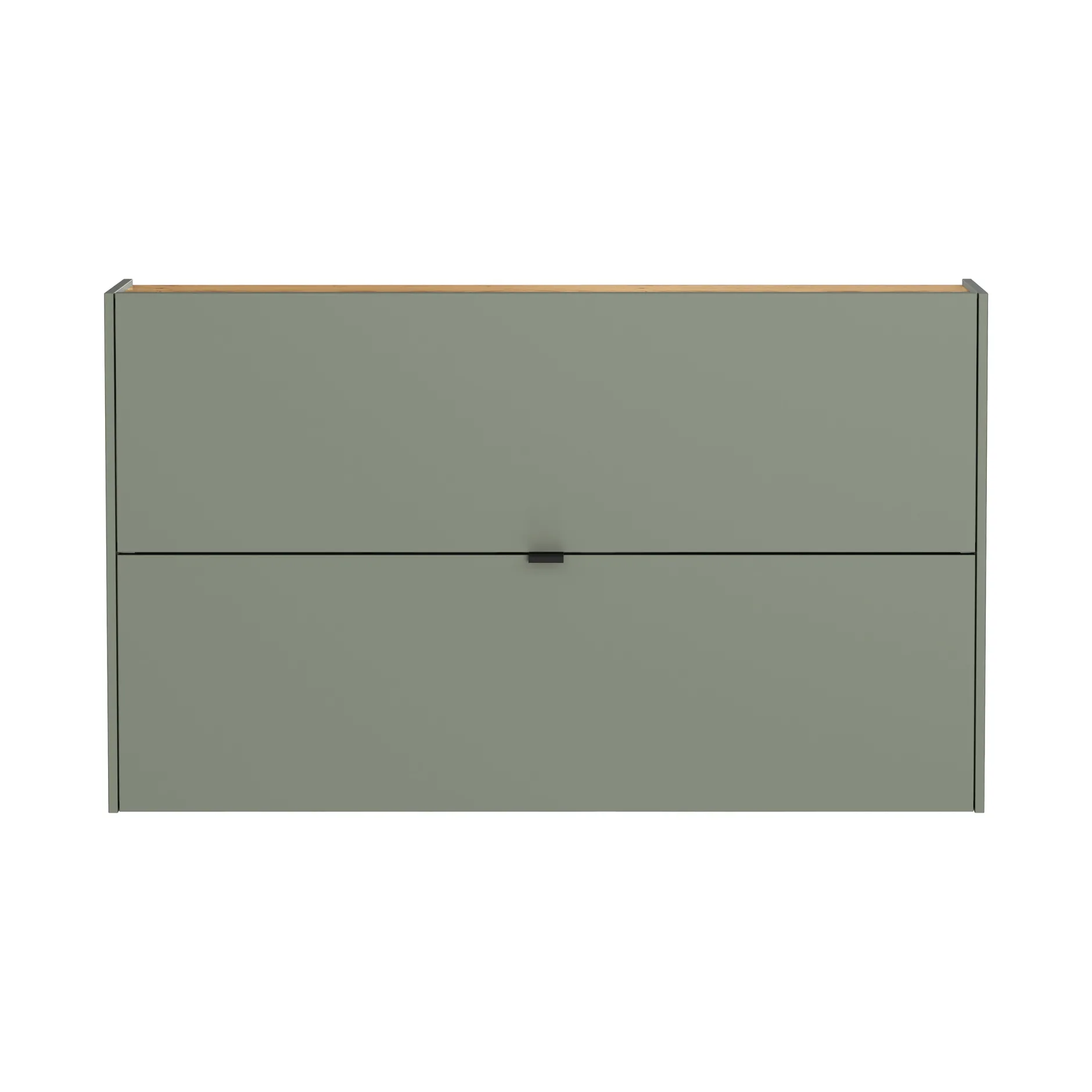 Het bovenste plankje is uitgevoerd in Navarra-eikenhoutreproductie en kan tot 10 kg dragen, terwijl de rest van de kast in de kleur taupe groen is. De handgrepen zijn gemaakt van poedergecoat metaal in de kleur zwart.