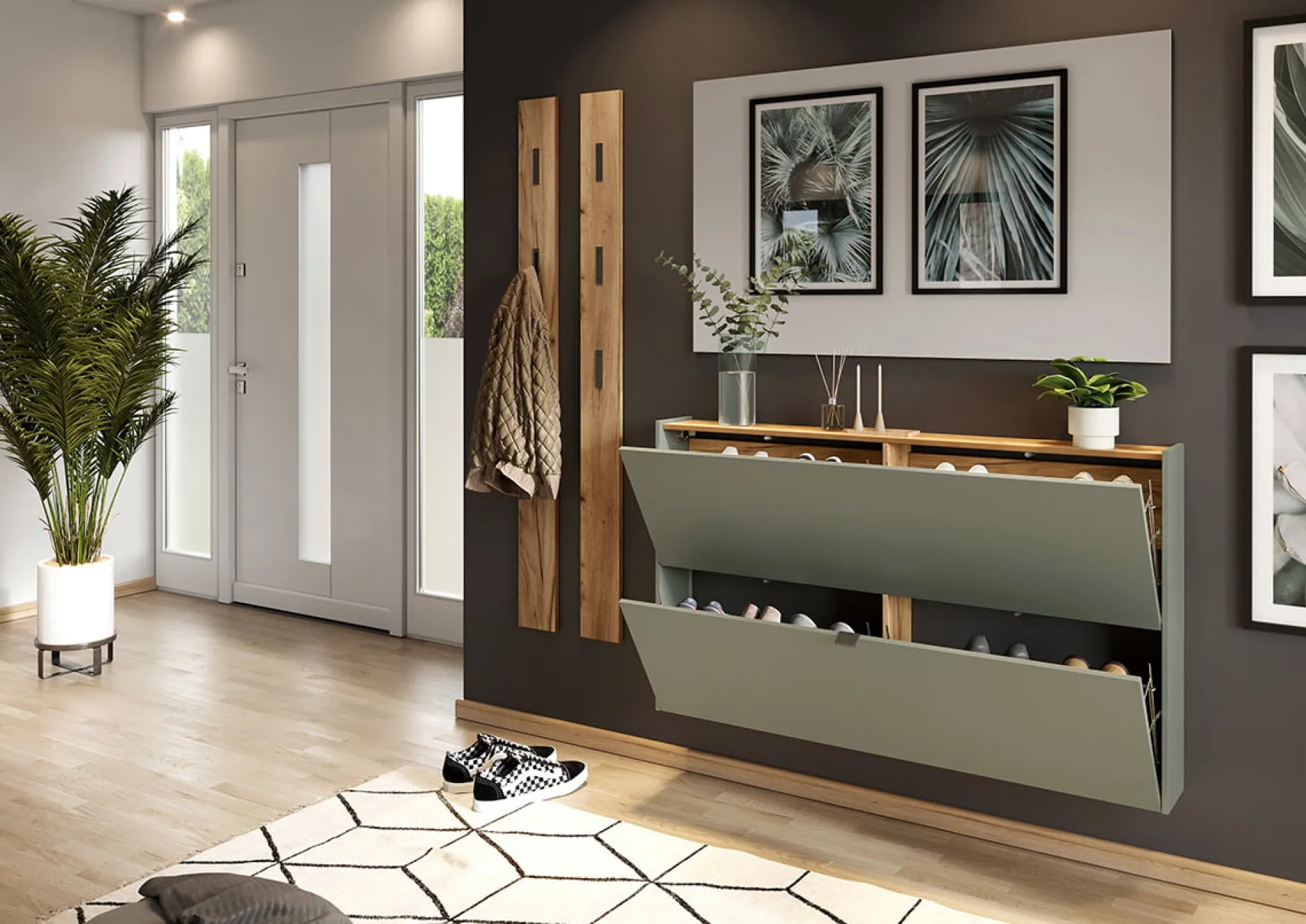 De Schoenenkast Eleonore Groen van 140 cm biedt een slimme en ruimtebesparende oplossing voor het opbergen van schoenen. Met zijn twee kleppen, elk belastbaar tot 10 kg, en vier metalen schoenenmanden biedt deze kast plaats aan maximaal 12 paar schoenen.
