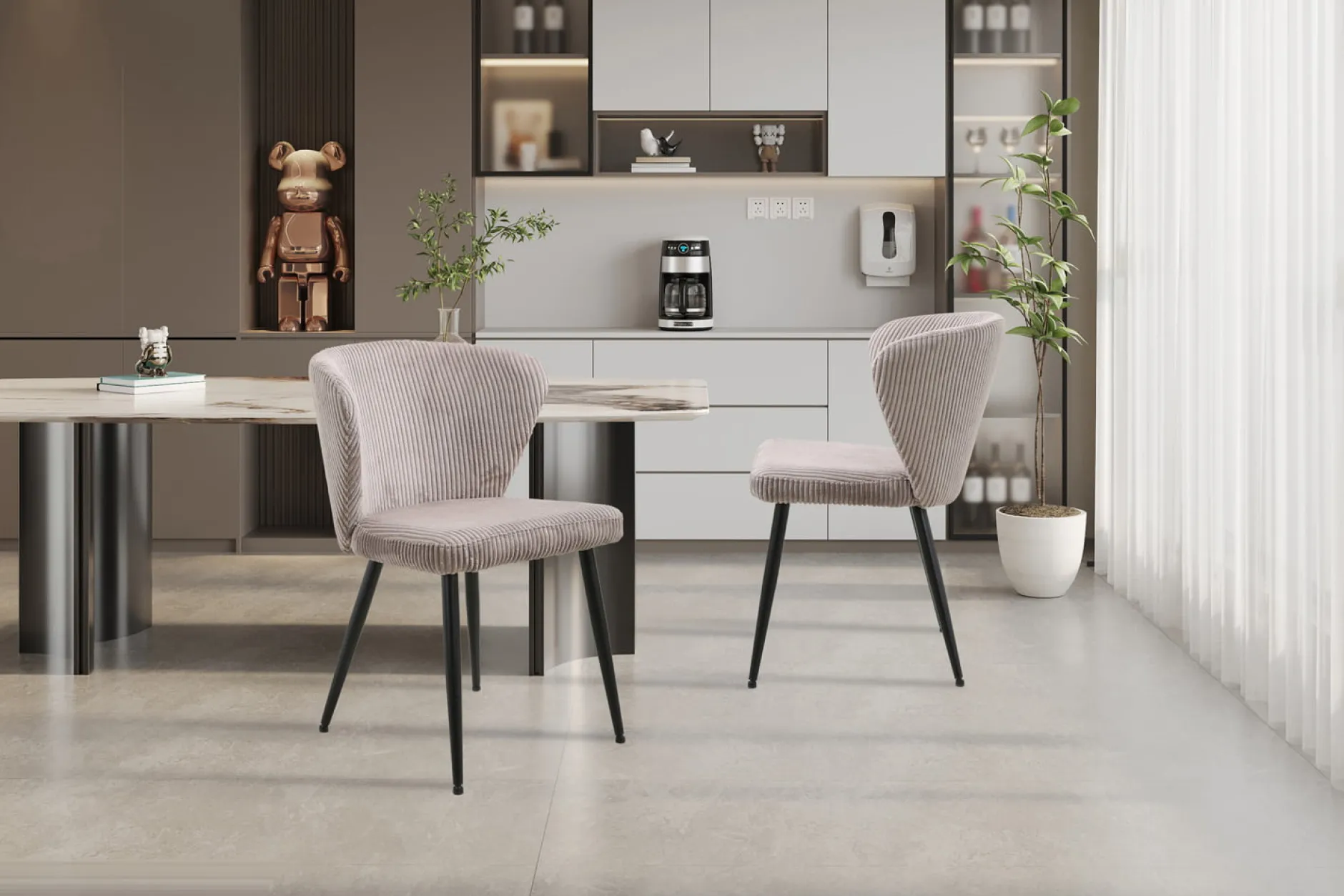 Maak kennis met de Stoel Marthe, een stijlvolle set van 2 stoelen die perfect passen in elk interieur. Met een breedte van 54 cm, een hoogte van 79 cm en een diepte van 55 cm, bieden deze stoelen een ideale zitervaring. Het stevige metalen onderstel in combinatie met de ribstof zitting zorgt voor zowel comfort als een luxe uitstraling.