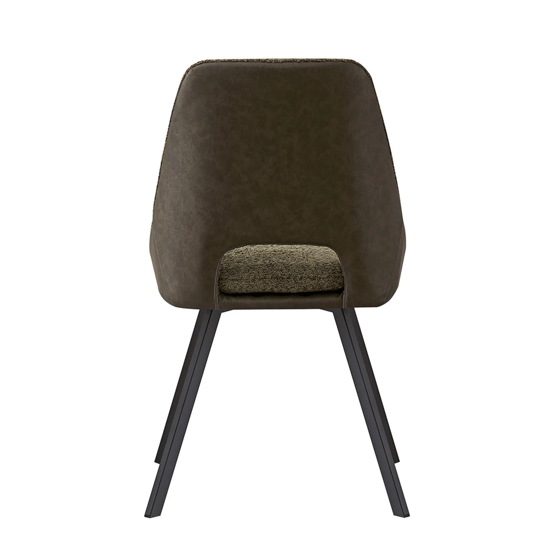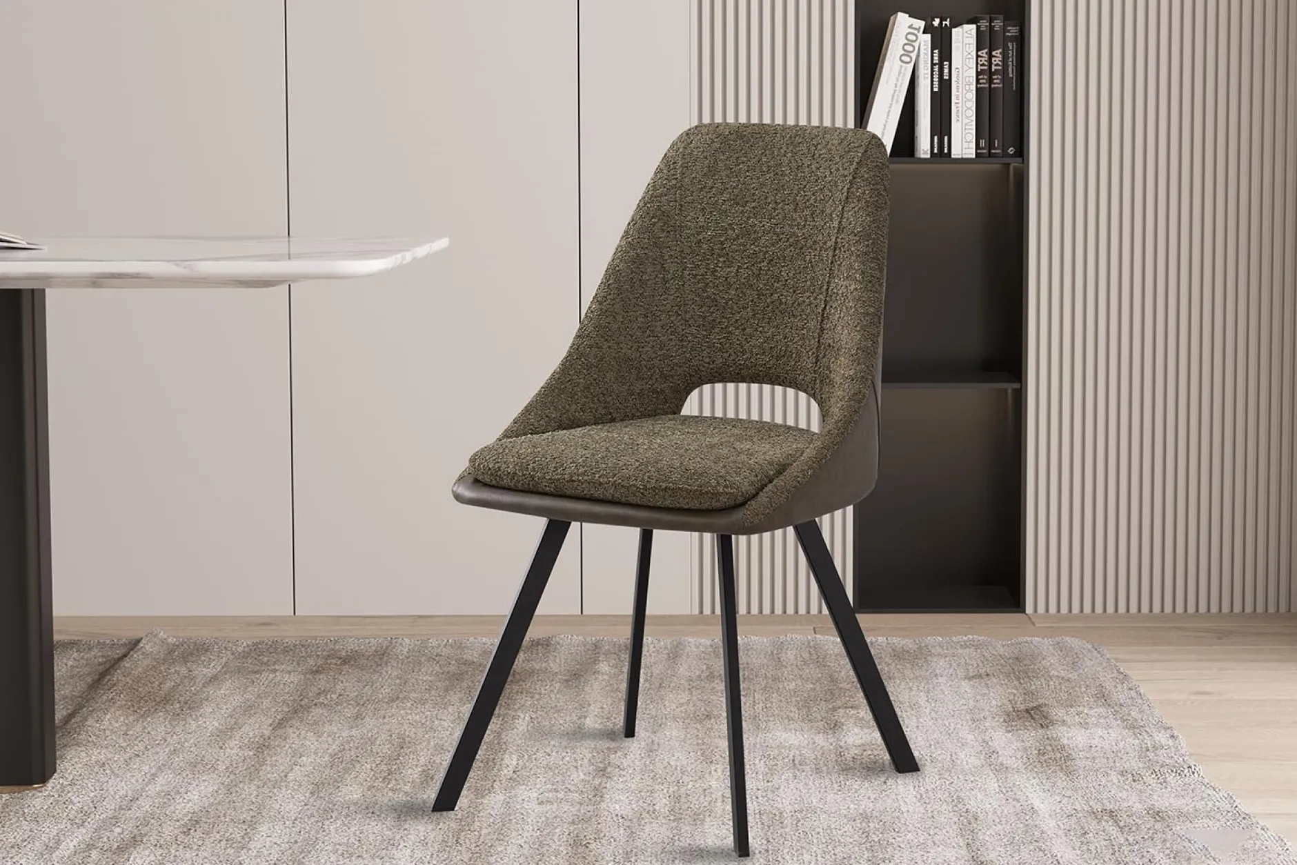 Deze trendy eetkamerstoel heeft metalen rechthoekige zwarte poten en staat stevig op de grond. De stoel heeft een goed zitcomfort, het zitvlakte is voorzien van een mooie Bouclé stoffering, de rugleuning is uitgevoerd in kunstleder. Bouclé is een stof dat bestaat uit geweven patronen, draden en lussen van verschillende stoffen, hierdoor ontstaat een grovere structuur welke zacht aanvoelt. Verkrijgbaar in verschillende moderne kleuren waardoor deze gemakkelijk in je interieur plaats neemt. De stoel heeft een zithoogte van 49 centimeter en een zitdiepte van 45 centimeter.
