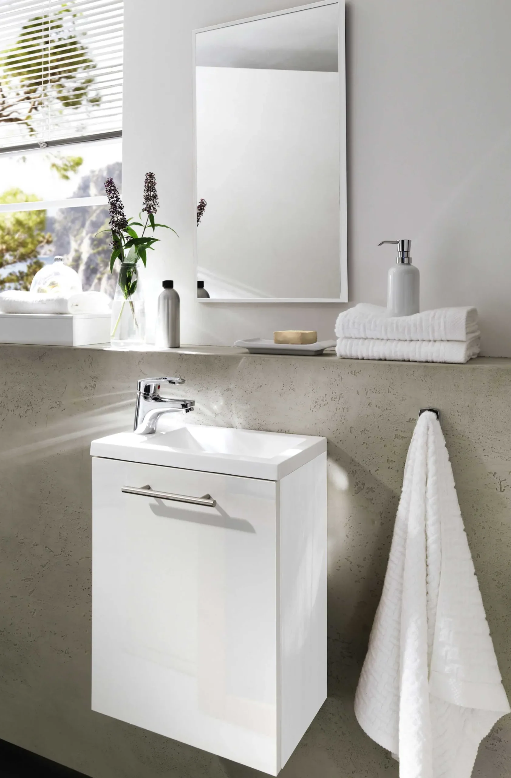 Deze praktische wastafel kun je gemakkelijk in de kleinere ruimte kwijt. Met zijn afmetingen van 40 cm breed, 50,5 cm hoog en 22 cm diep ook goed te plaatsen in een toilet. Het deurtje kan zowel linksom- als rechtsom gemonteerd worden. Het meubel is afgewerkt met hoogglans spaanplaat-fronten en door zijn melamine afwerking is deze kast gemakkelijk schoon te houden en langer beschermd tegen stof, vuil en krassen. De wastafelkast wordt geleverd exclusief kraan, toevoerleidingen naar de kraan, afvoerplug en zwanenhals.