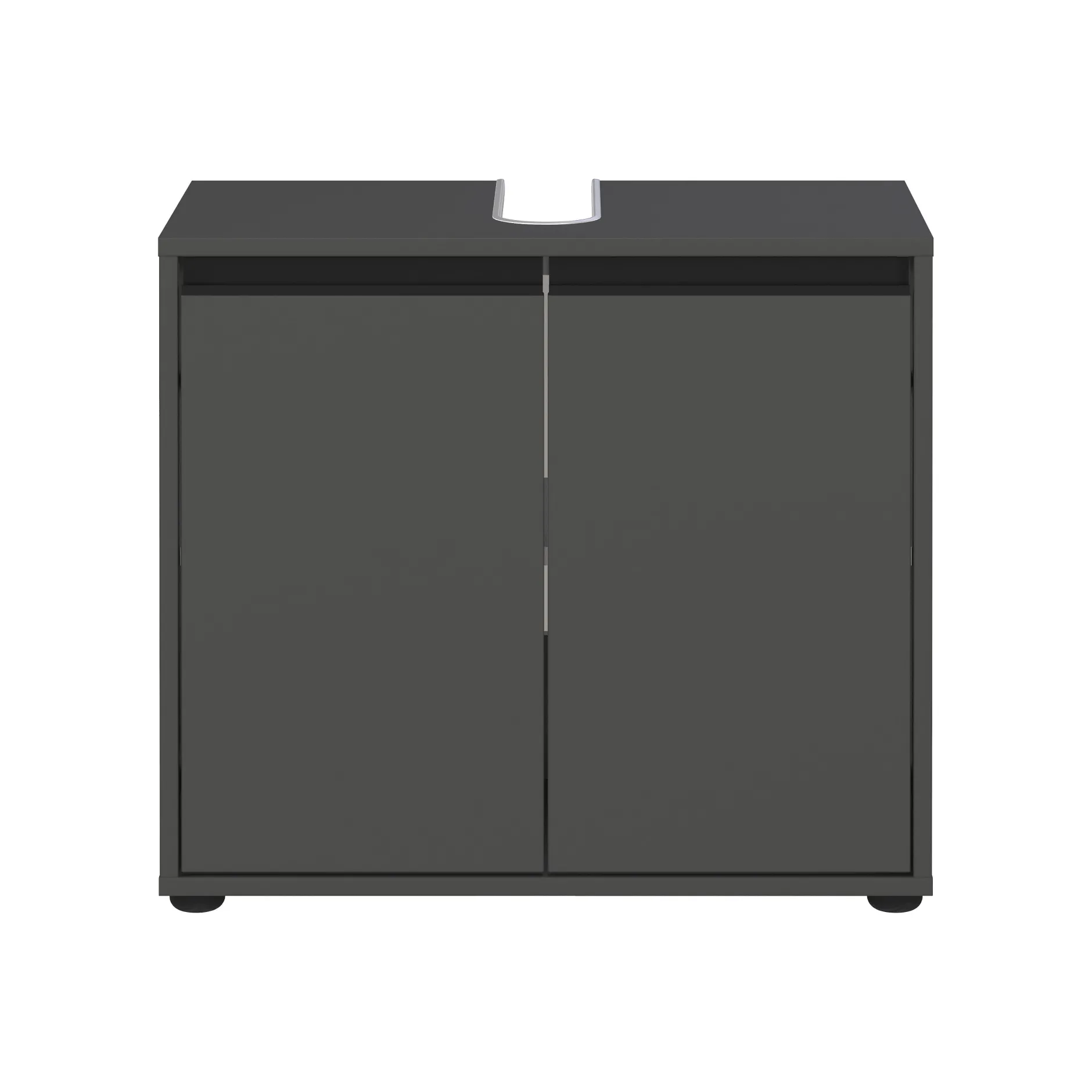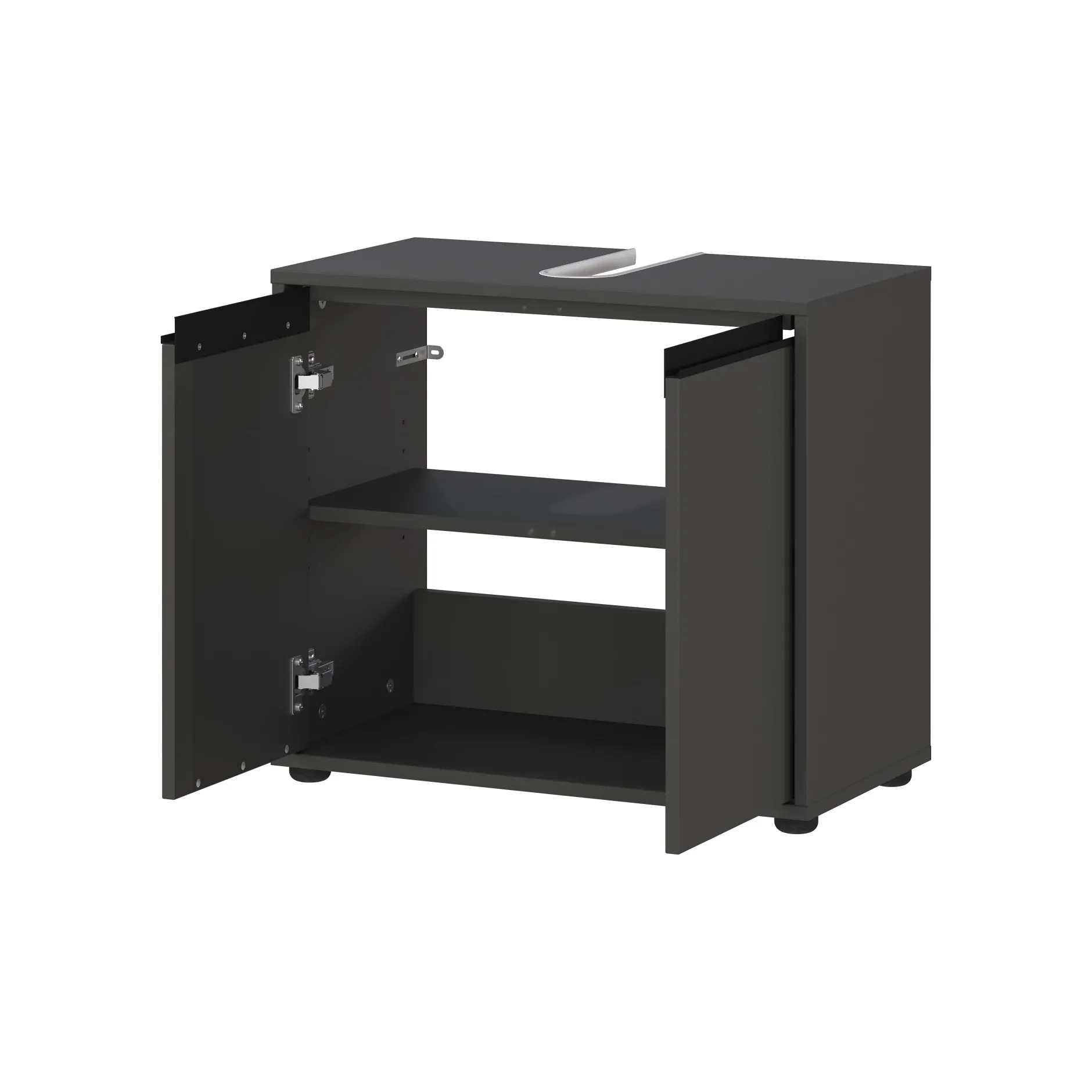 De wastafelkast Pula Grafiet 63 cm combineert een modern design met praktische opbergruimte. Dit meubel heeft twee deuren met daarachter een verstelbare plank, belastbaar tot 10 kg. Het bovenpaneel heeft een uitsparing voor de sifon en kan tot 3 kg dragen, terwijl de onderste plank tot 10 kg belastbaar is. De kast is voorzien van twee zwarte metalen handgrepen en staat op vier stevige kunststof meubelglijders. Dankzij de krasbestendige melamine coating en stootvaste ABS-randen is het meubel bestand tegen dagelijks gebruik. De geïntegreerde demping zorgt voor een geruisloze sluiting van de deuren.
