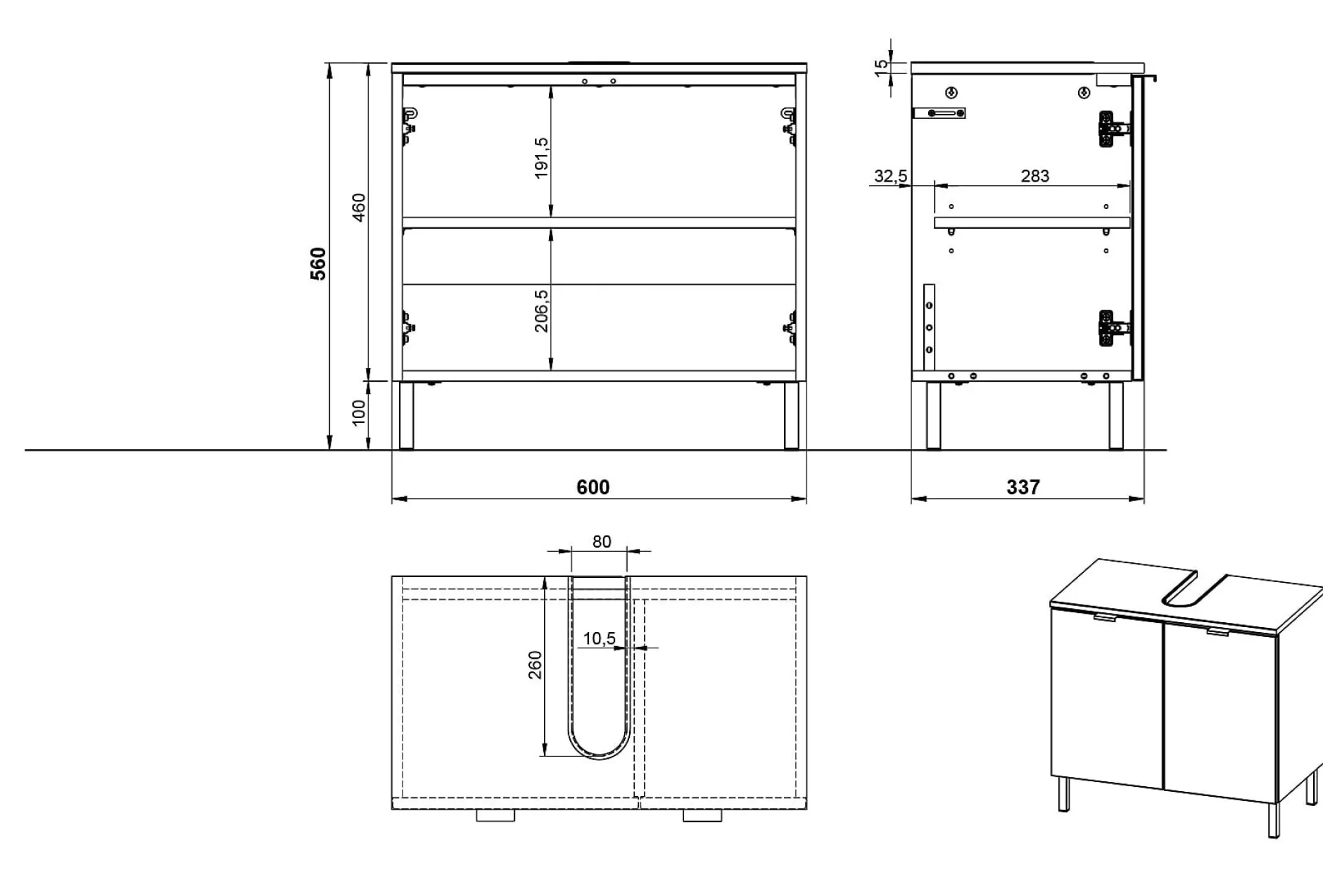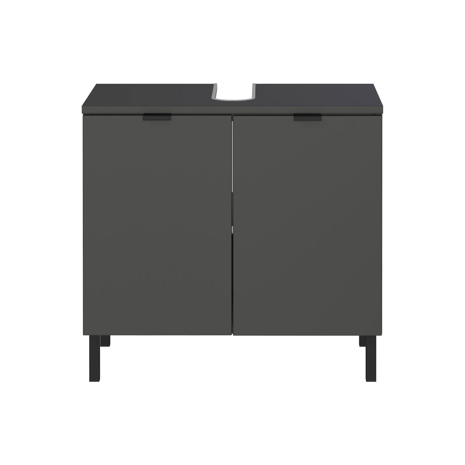 De wastafelkast Zadar Grafiet 60 cm is een stijlvolle en functionele toevoeging aan elke badkamer. Dit meubel is voorzien van twee deuren met een verstelbare plank erachter, belastbaar tot 10 kg. De bovenste plank heeft een uitsparing voor de sifon en kan tot 3 kg dragen, terwijl de onderste plank tot 10 kg belastbaar is. De kast staat op vier stevige, zwarte metalen poten en heeft metalen randgrepen in dezelfde afwerking. Dankzij de krasbestendige melamine coating en stootvaste randen blijft het meubel langdurig mooi, terwijl de geïntegreerde demping zorgt voor een zacht en geruisloos sluitmechanisme.