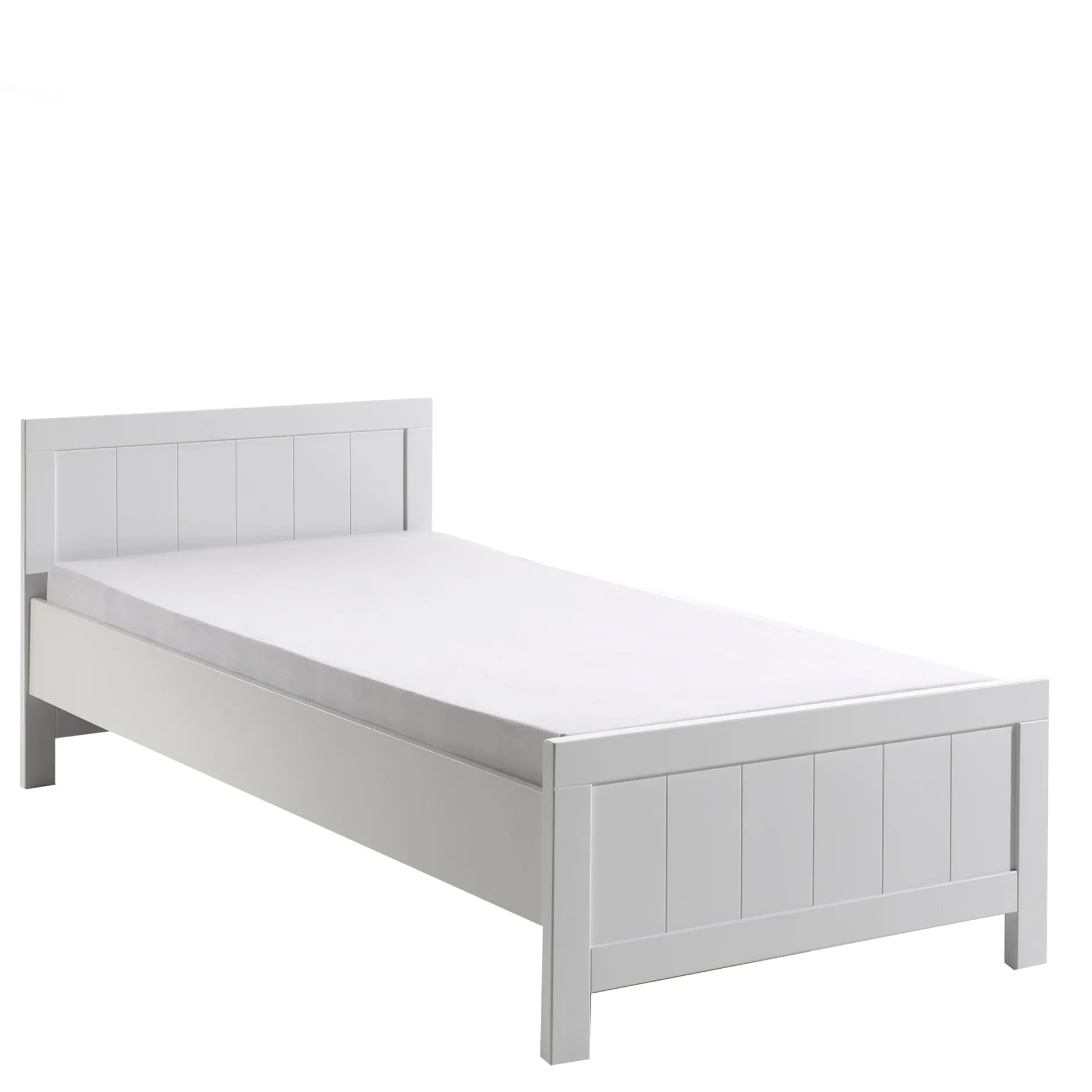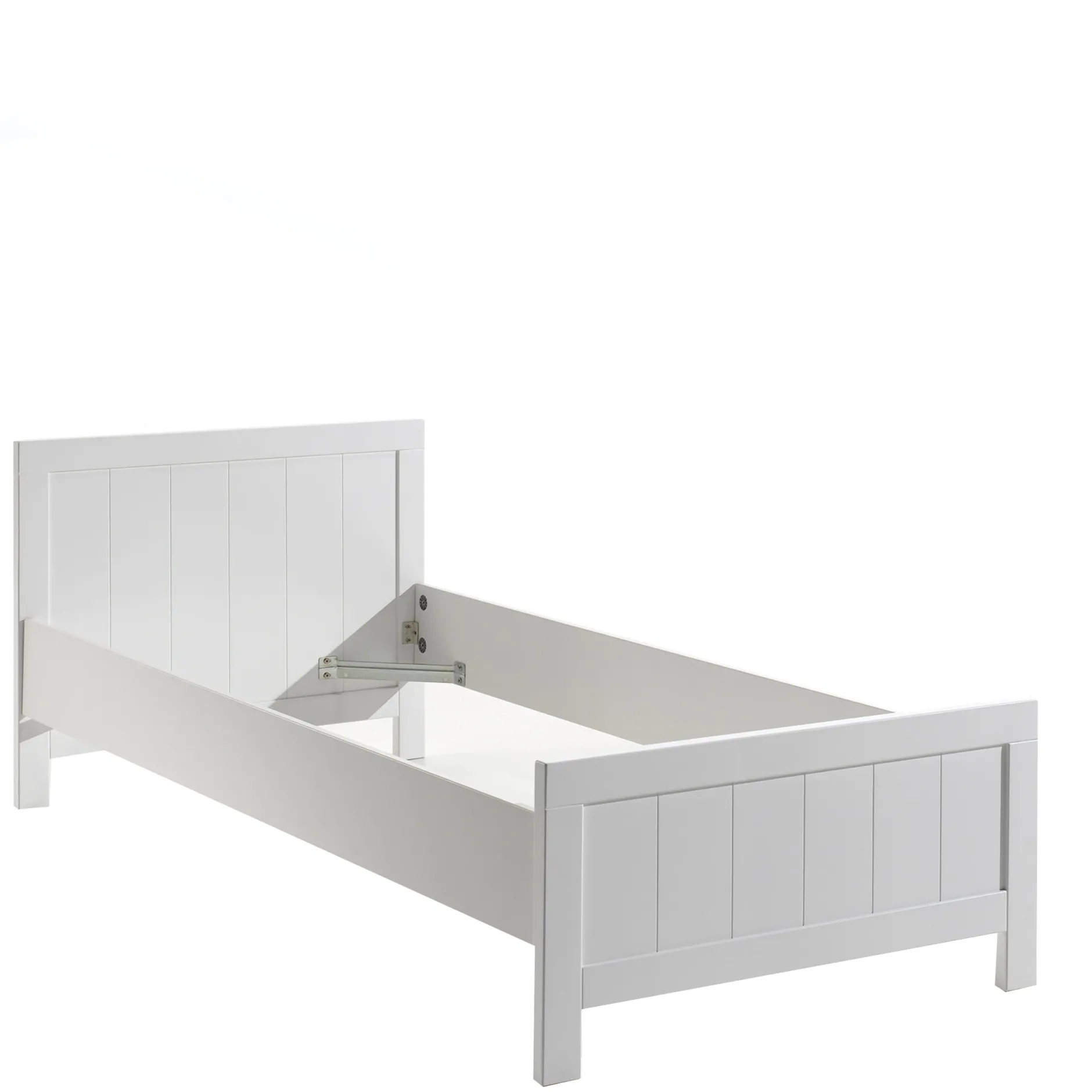 Dit 1-persoonsbed bed met een ligmaat van 90×200 cm. met verticale infrezingen is ook nog uit breiden met een onderschuifbed. Het is vervaardigd uit hoogwaardig MDF met massief grenen in wit gelakt.