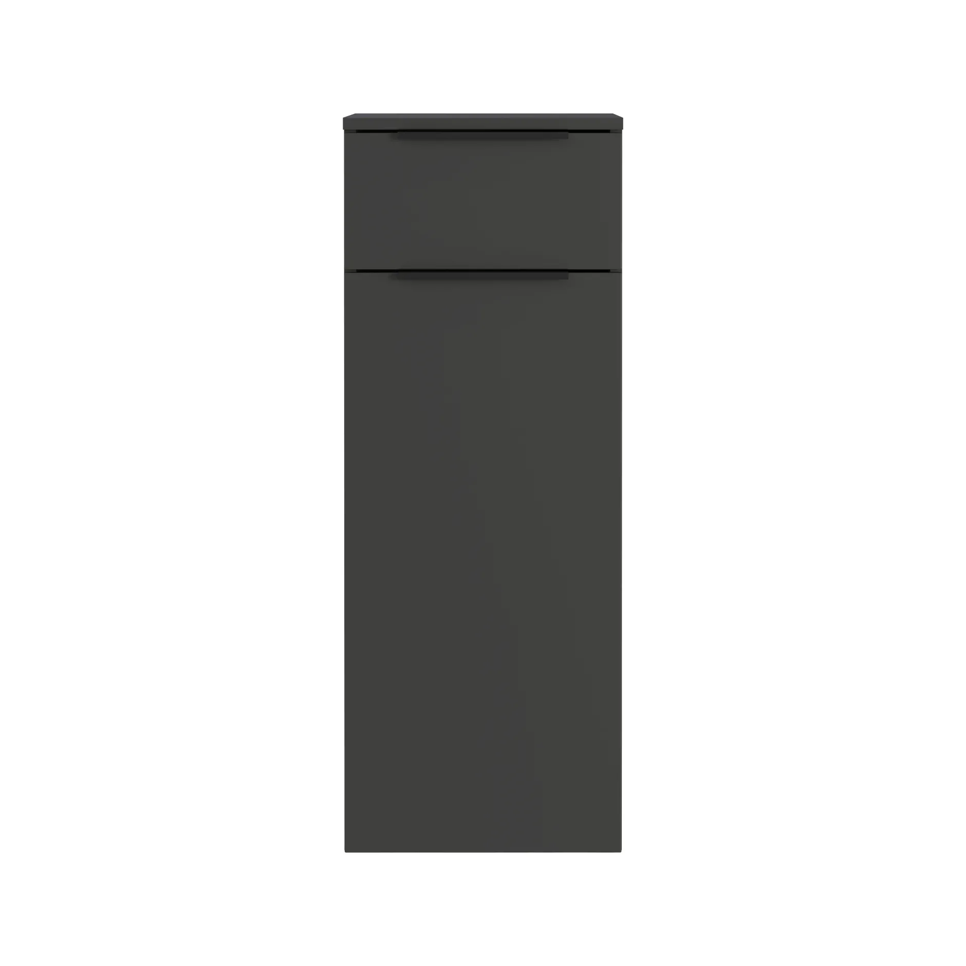 Deze kast met één lade (belastbaar tot 10 kg) en één deur biedt veel opbergruimte. Achter de deur vind je een verstelbare plank (belastbaar tot 10 kg), en aan de onderkant is er nog een plank voor extra opbergruimte (belastbaar tot 10 kg). De kast is uitgevoerd in een grafietkleur en heeft twee handgrepen aan de zijkant gemaakt van zwart gepoedercoat metaal. De kast kan aan de muur worden gemonteerd, en de oppervlaktecoating is krasbestendig en duurzaam. De randen van de kast zijn bestand tegen stoten en impact. Zowel de lade als de deur sluiten langzaam, zacht en geruisloos dankzij een geïntegreerde demper. Bovendien kan de deur aan zowel de rechter- als linkerkant worden gemonteerd. Dit meubelstuk is milieuvriendelijk verpakt en is vervaardigd in Duitsland.
