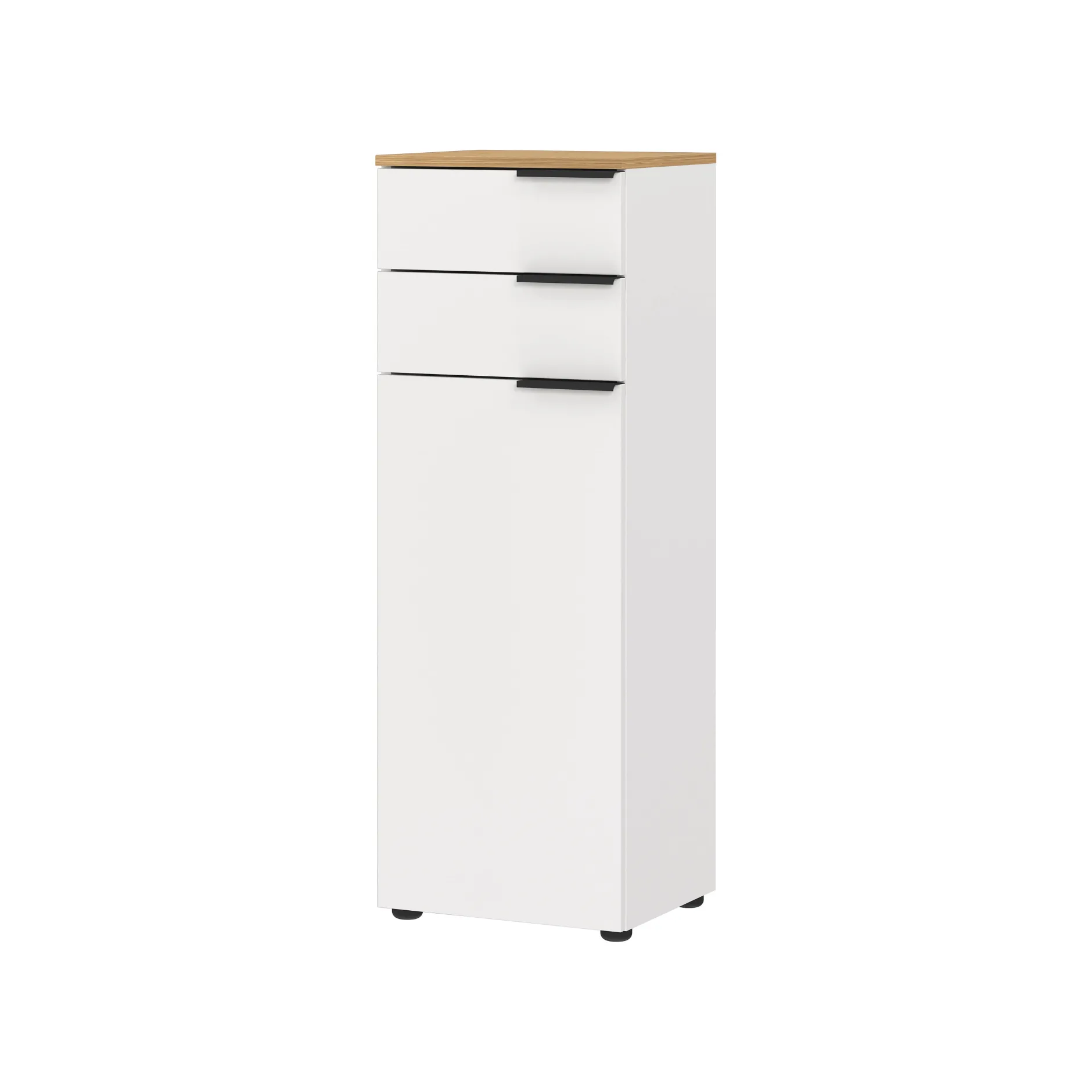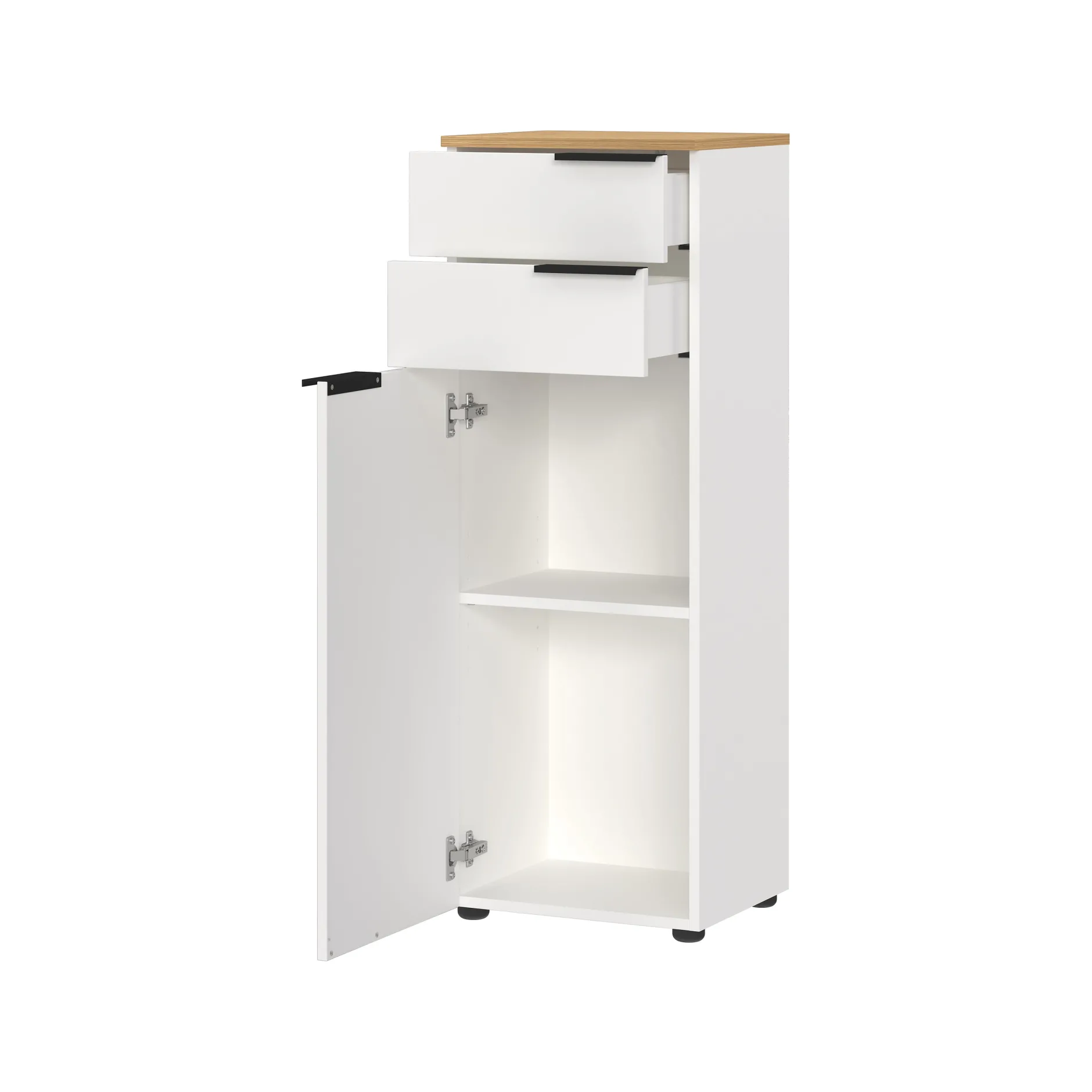 De kast beschikt over twee lades, elk belastbaar tot 10 kg, en een deur. Achter de deur bevindt zich een in hoogte verstelbare plank, eveneens belastbaar tot 10 kg. Zowel de bovenste als onderste plank hebben een draagvermogen van maximaal 10 kg. De bovenste plank is uitgevoerd in Navarra-eiken repro, terwijl de rest van de kast in wit is uitgevoerd.