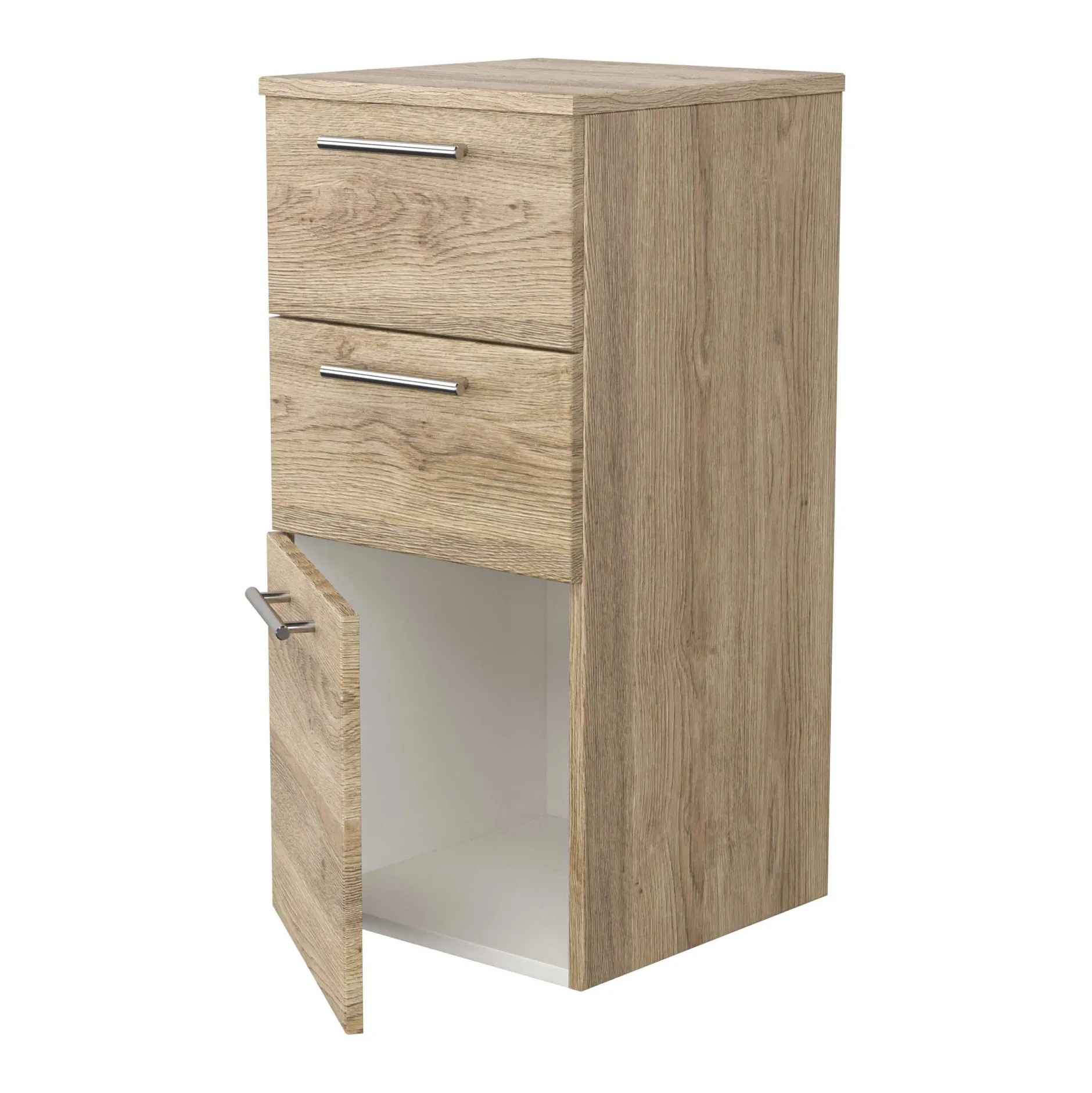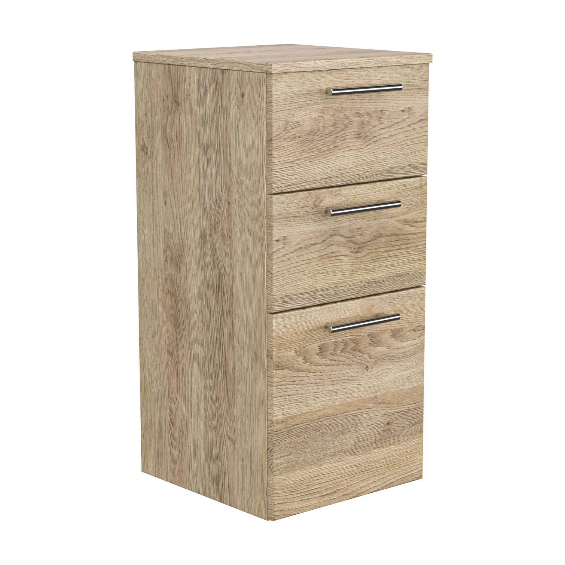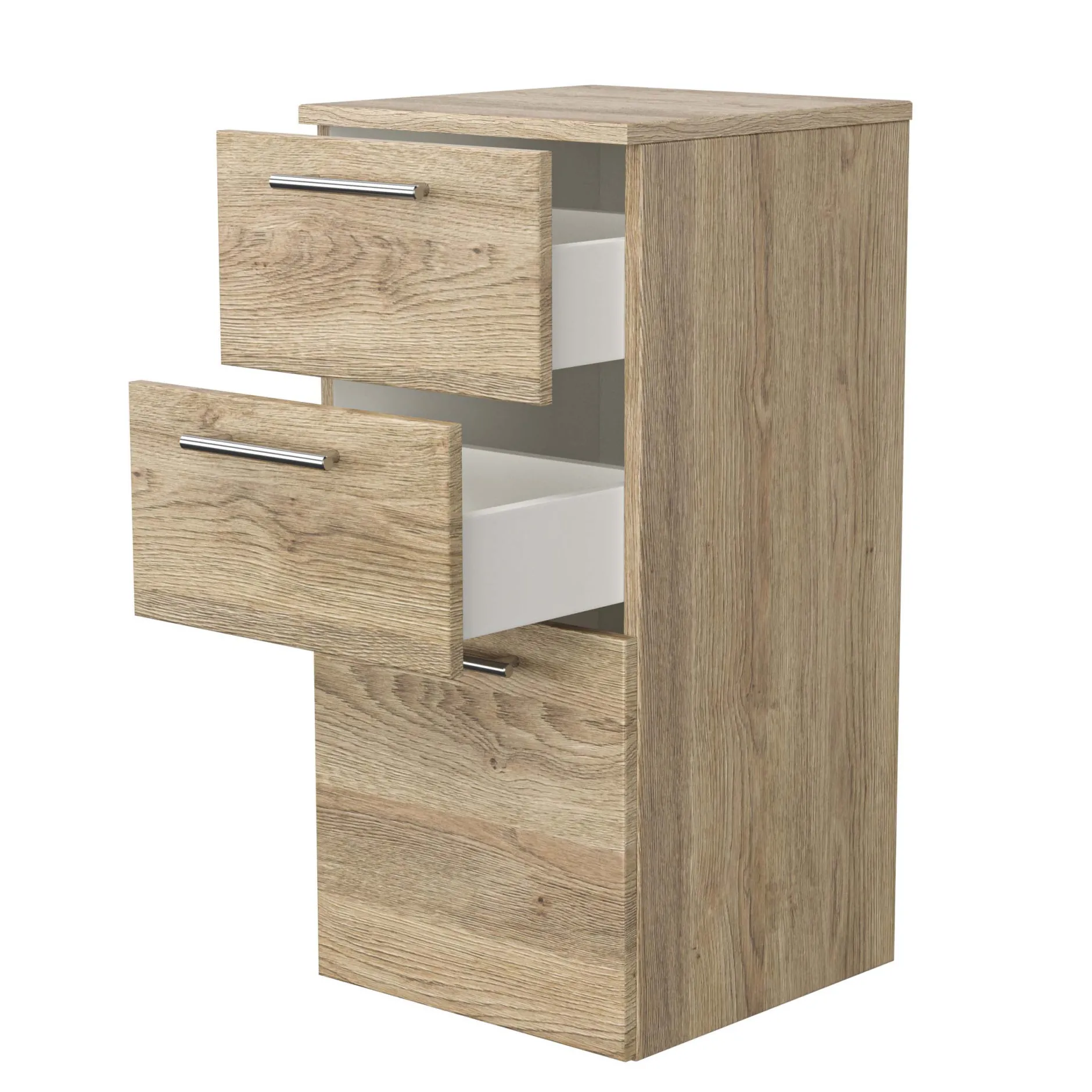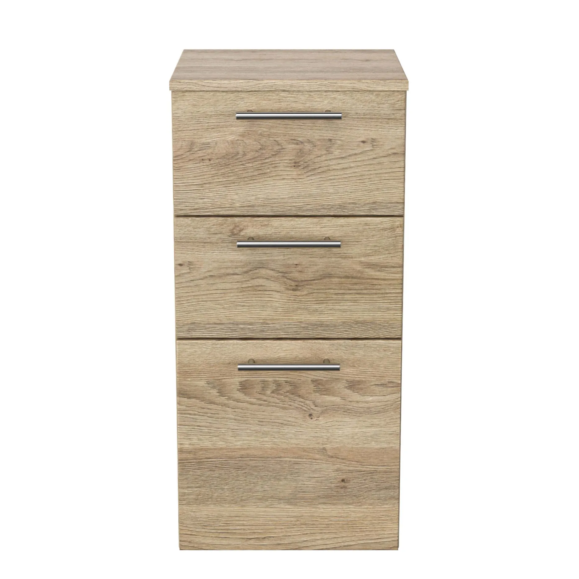Deze handige badkamer ladekast biedt voldoende ruimte om al je spullen op te bergen. De soft-close laden van 2 verschillende afmetingen sluiten geruisloos en zijn voorzien van rvs-handvaten. Door zijn melamine afwerking is deze kast gemakkelijk schoon te houden en langer beschermd tegen stof, vuil en krassen. Deze kasten zijn geproduceerd in Duitsland en zijn van hoogwaardige kwaliteit. Uitermate geschikt voor gebruik in de badkamer. Deze kast is 36,8 cm breed, 75 cm hoog en 35,2 cm diep en is ook verkrijgbaar in het wit, antraciet en beton. De kast is gemaakt van spaanplaat.