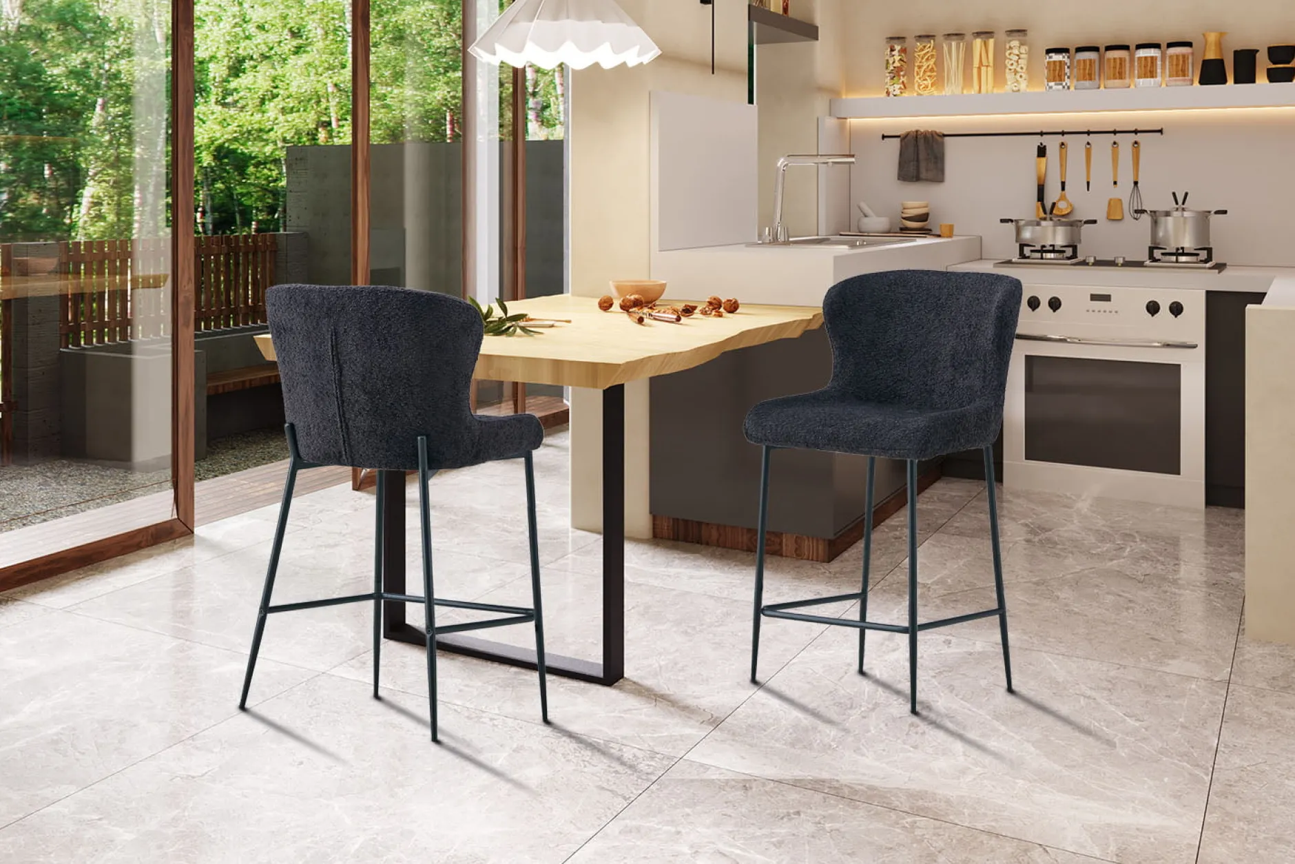 De Jolie barkruk is een stijlvolle toevoeging voor iedere keuken. Met een totale hoogte van 96.5 cm en een zithoogte van 67 cm, is deze kruk perfect voor aanrechtbladen. De zitting van bouclé zorgt voor een comfortabele zitervaring, ondersteund door een stevig metalen onderstel. De diepte van de zitting bedraagt 46 cm, wat zorgt voor voldoende zitruimte.