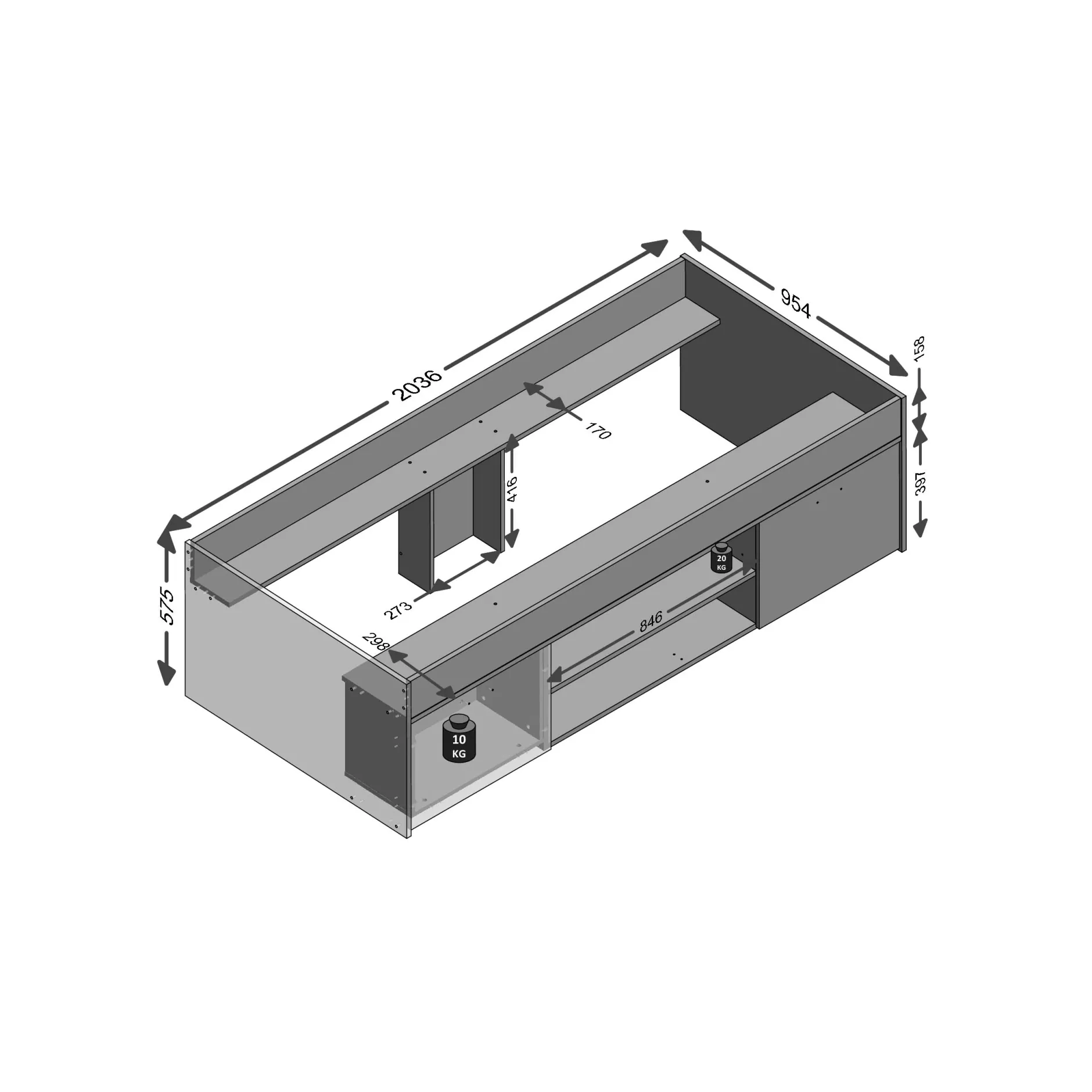 Dit praktische bed is vervaardigd uit een stevige spaanplaat en afgewerkt met een sterke melamine. In de lade aan de linkerkant kun je extra beddengoed opbergen en rechts achter de deur al het speelgoed. Gemakkelijk te monteren met bijgeleverde montagehandleiding.