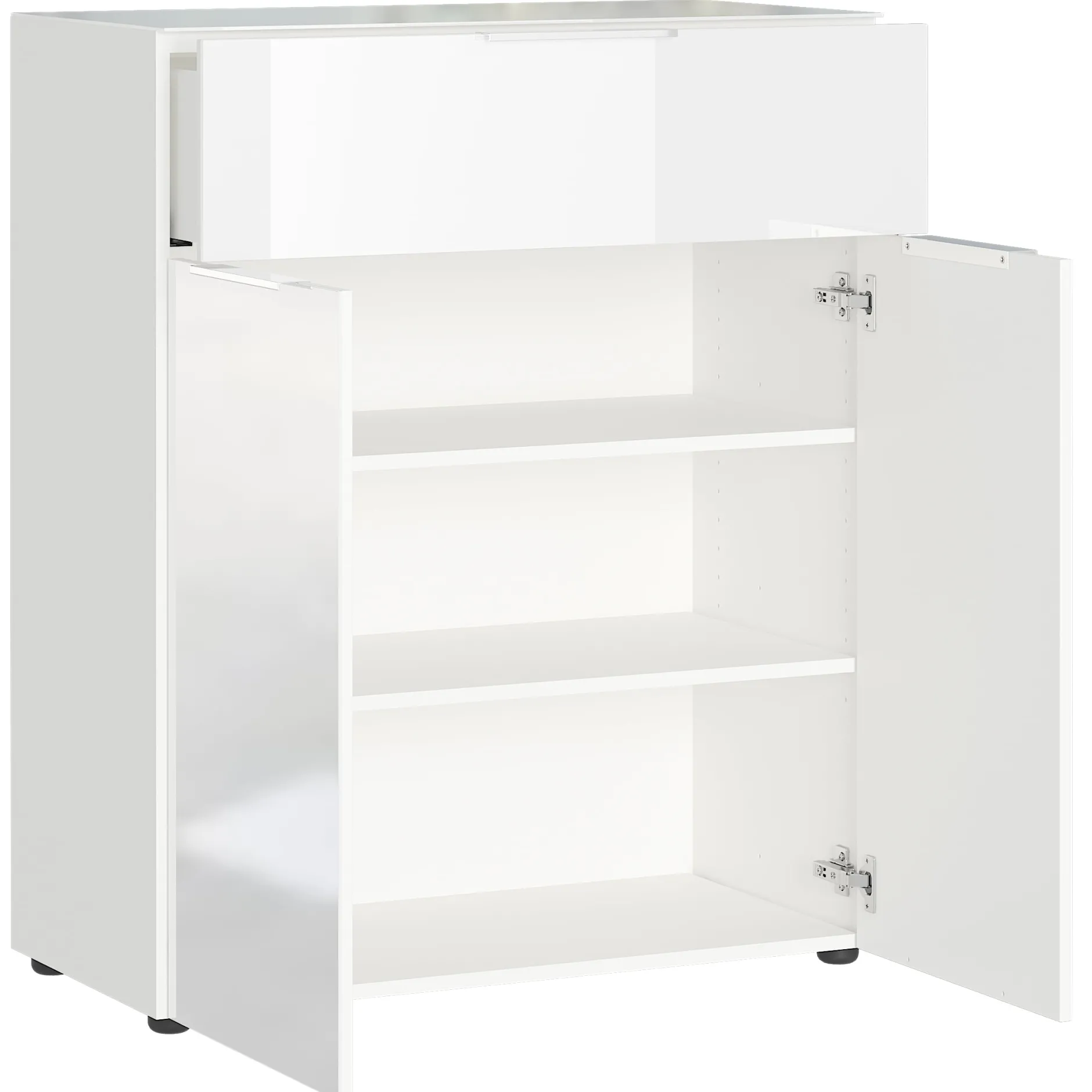 Deze bergkast heeft een combinatie van een deur en een lade. Achter de deuren met softclose-systeem liggen 2 legplanken zodat je 3 opbergvakken hebt.