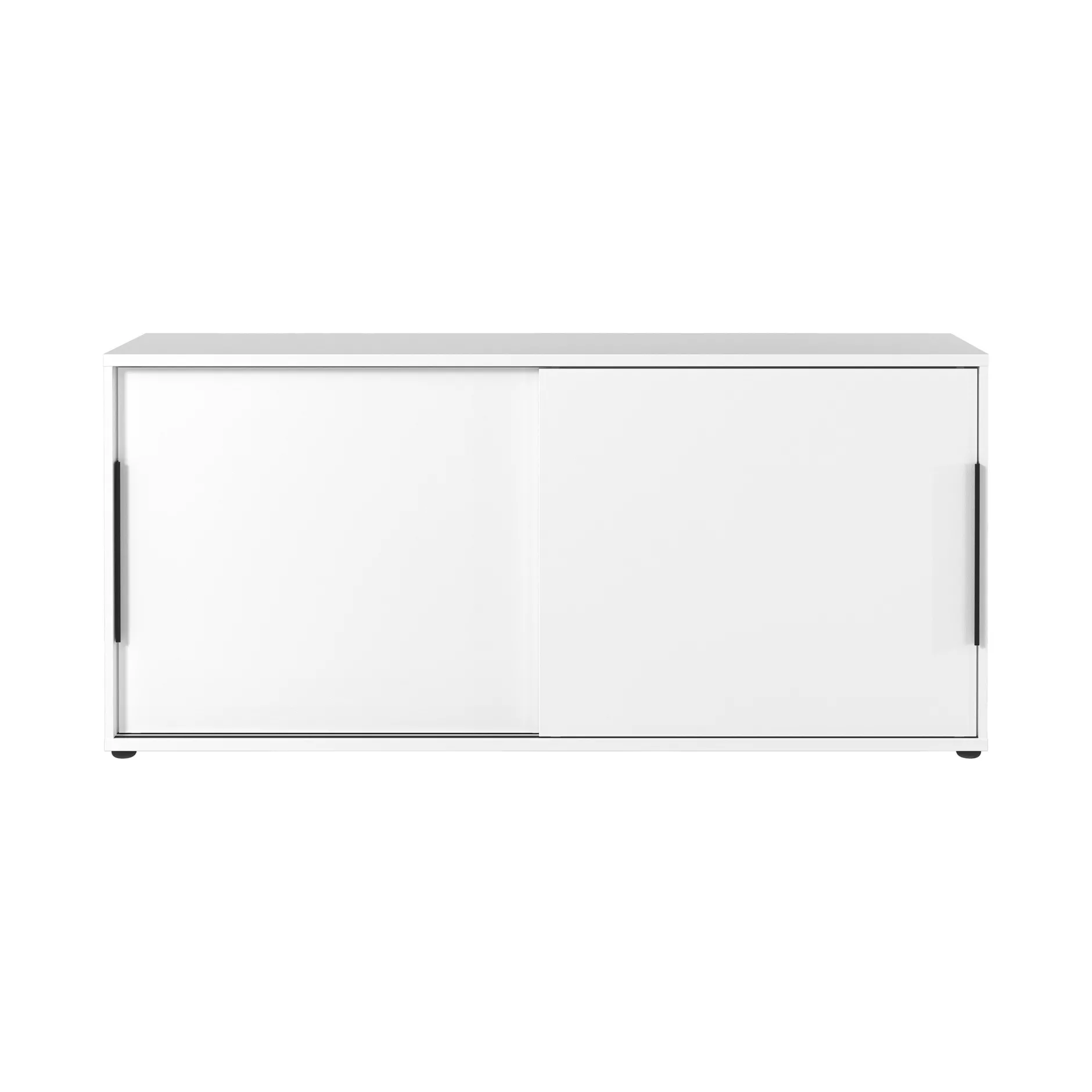 De kast is uitgevoerd in de kleur wit en heeft twee zwarte handgrepen van poeder gecoat metaal. Naast zijn duurzame oppervlaktecoating en schok- en stootbestendige randen, biedt deze kast ook flexibiliteit met zijn schuifdeuren voor gemakkelijke toegang tot de inhoud.