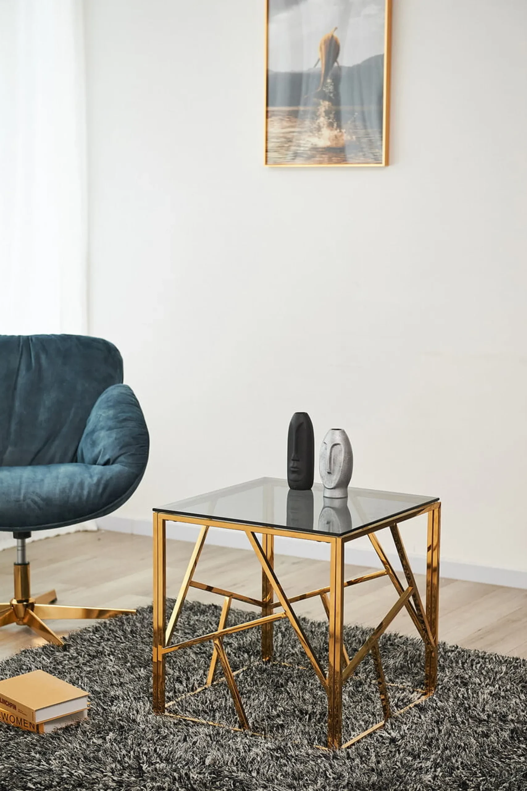 Een luxueuze bijzettafel met een stijlvol design en een gouden roestvrijstalen frame.