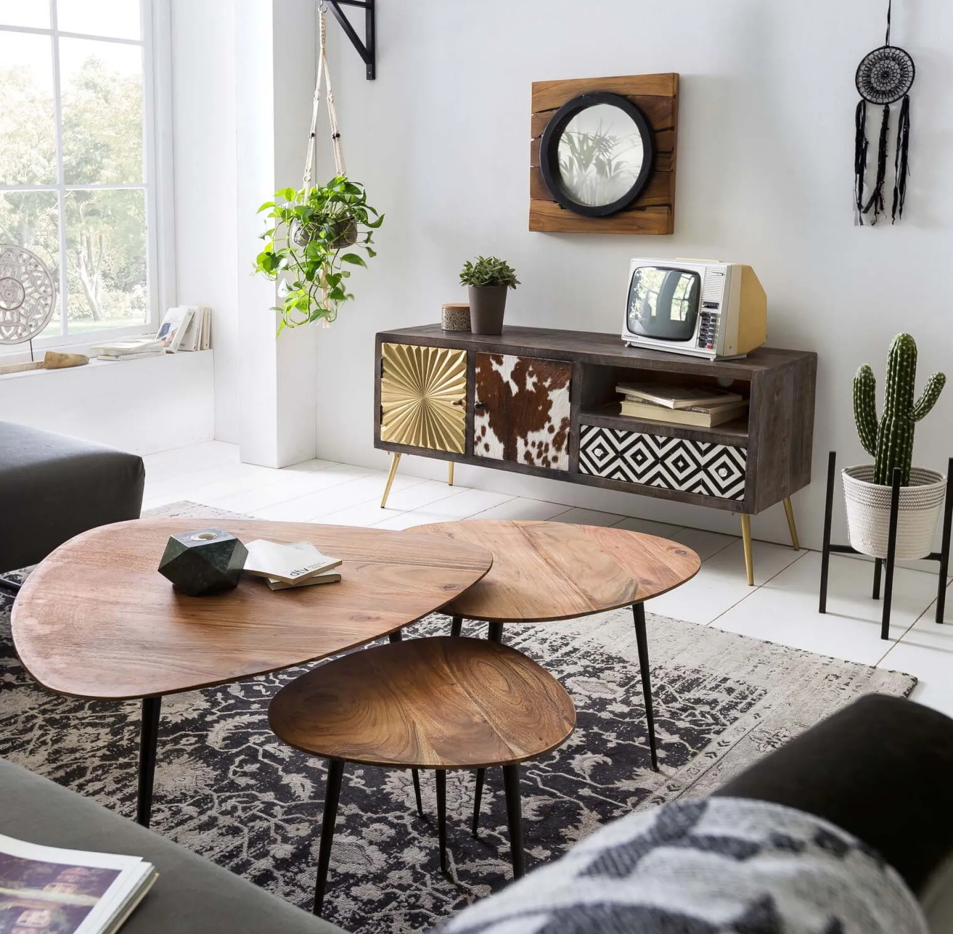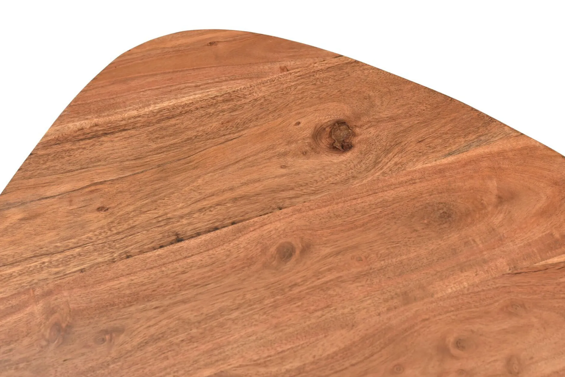 Deze veelzijdige bijzettafel combineert een natuurlijk acaciahouten blad met een stevig metalen onderstel. De drie poten geven een speelse uitstraling, terwijl de afgeronde hoeken zorgen voor een subtiele afwerking. Ideaal naast een fauteuil, als nachtkastje of in combinatie met andere tafels uit de Kasai-serie.