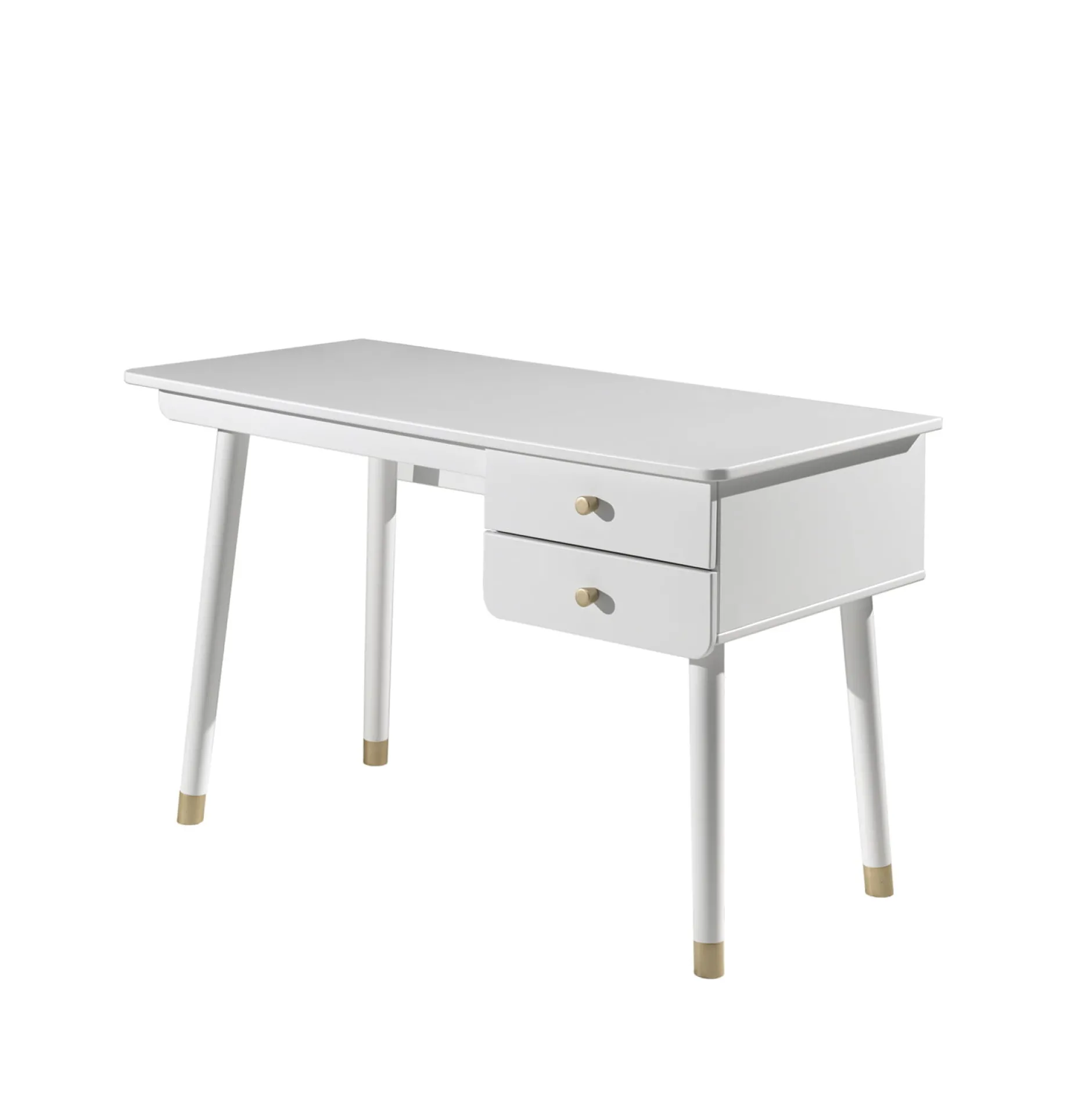 Dit bureau met zijn geometrisch design is geschikt voor elke kinderkamer! Door zijn gouden accenten en witte afwerking heeft dit bureau een moderne look. Aan de rechterkant bevinden zich twee lade om al je spullen in kwijt te kunnen. Het bureau is gemaakt van een combinatie van MDF en massief grenen. Richt je gehele kinderkamer in met deze serie!