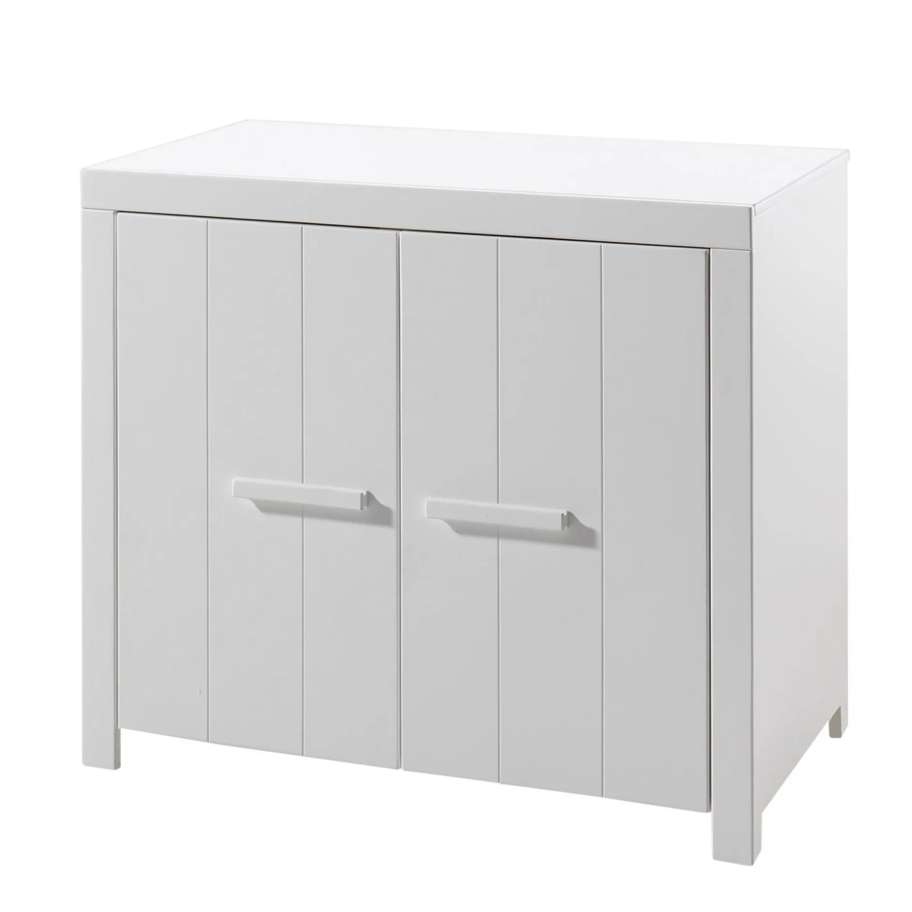 Deze handige commode kan geplaatst worden in elke kamer. De kast is vervaardigd uit een combinatie van MDF en massief grenen. De kast is afgewerkt met een witte lak. Achter de deuren bevindt zich 1 legplank. Leuk te combineren met de rest van de meubelen uit deze serie.