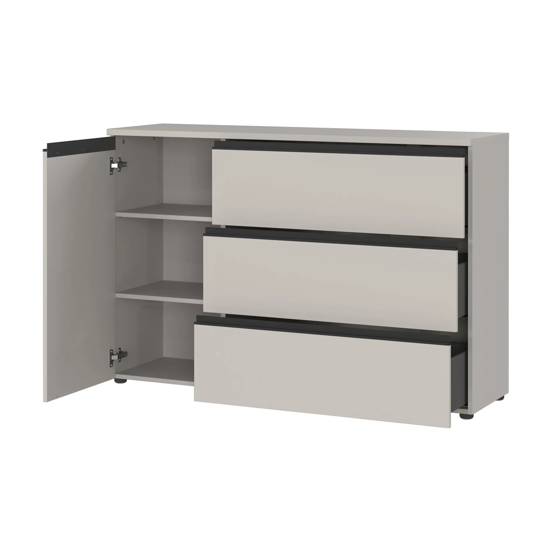Het Dressoir Alec Grijs in 135 cm biedt niet alleen ruime opslagmogelijkheden met zijn 3 laden (elk belastbaar tot 10 kg) en 1 deur, waarachter zich 2 verstelbare planken bevinden (elk belastbaar tot 10 kg), maar ook een stijlvolle toevoeging aan je interieur.