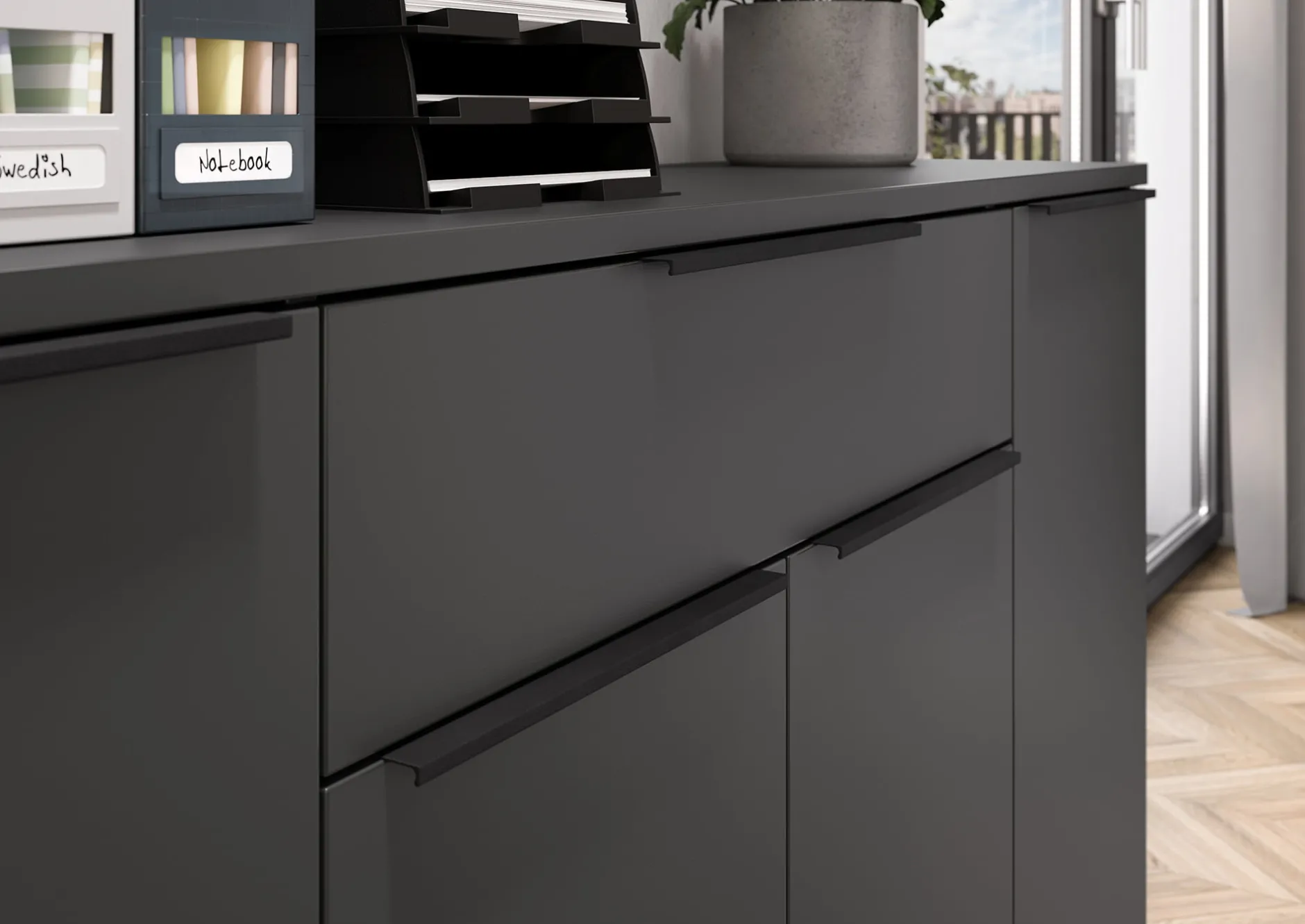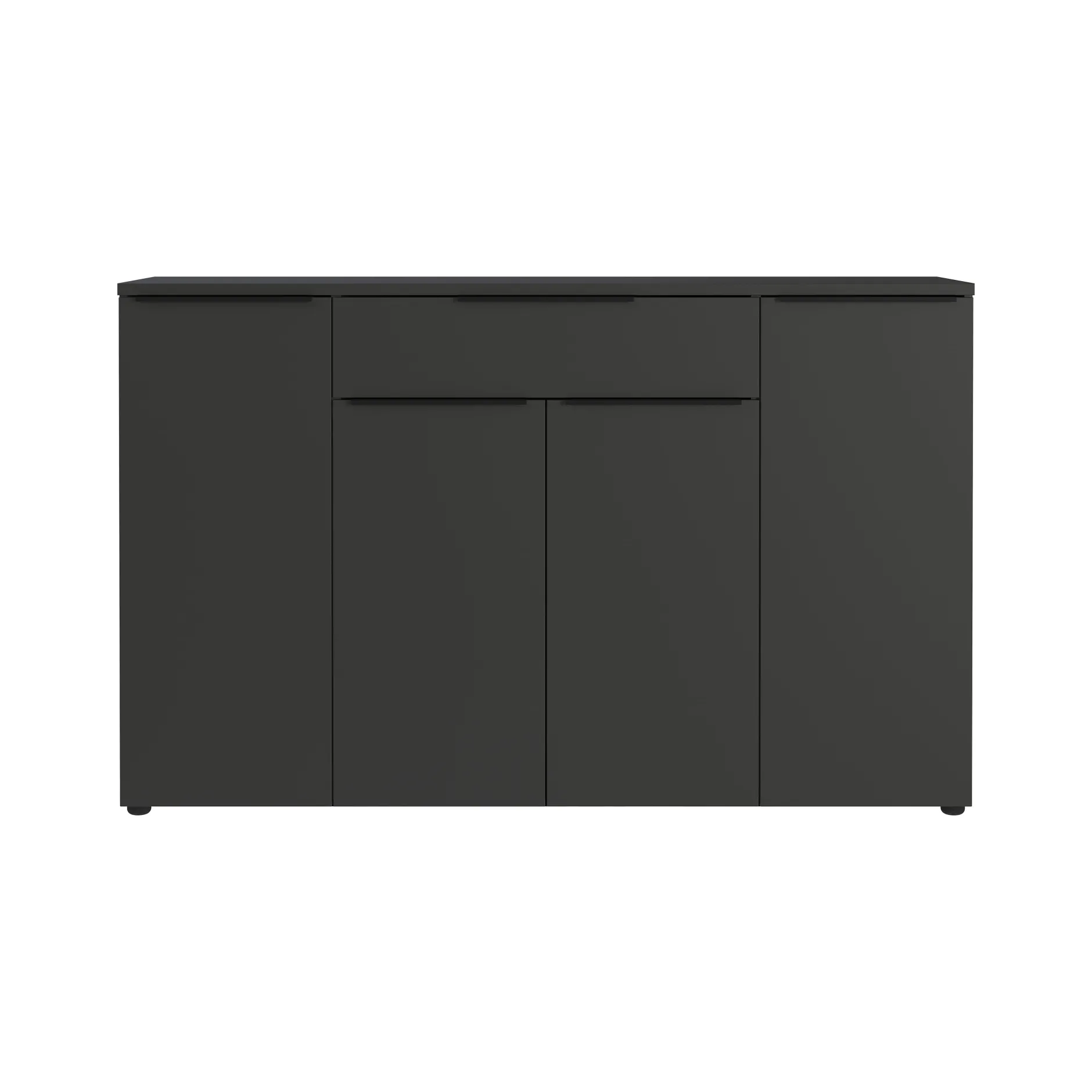 Dit dressoir is uitgevoerd in de kleur grafiet en beschikt over vijf zwarte handgrepen van poeder gecoat metaal. Dankzij de krasbestendige en duurzame oppervlaktecoating en de schok- en stootbestendige randen is dit dressoir niet alleen praktisch, maar ook zeer robuust.