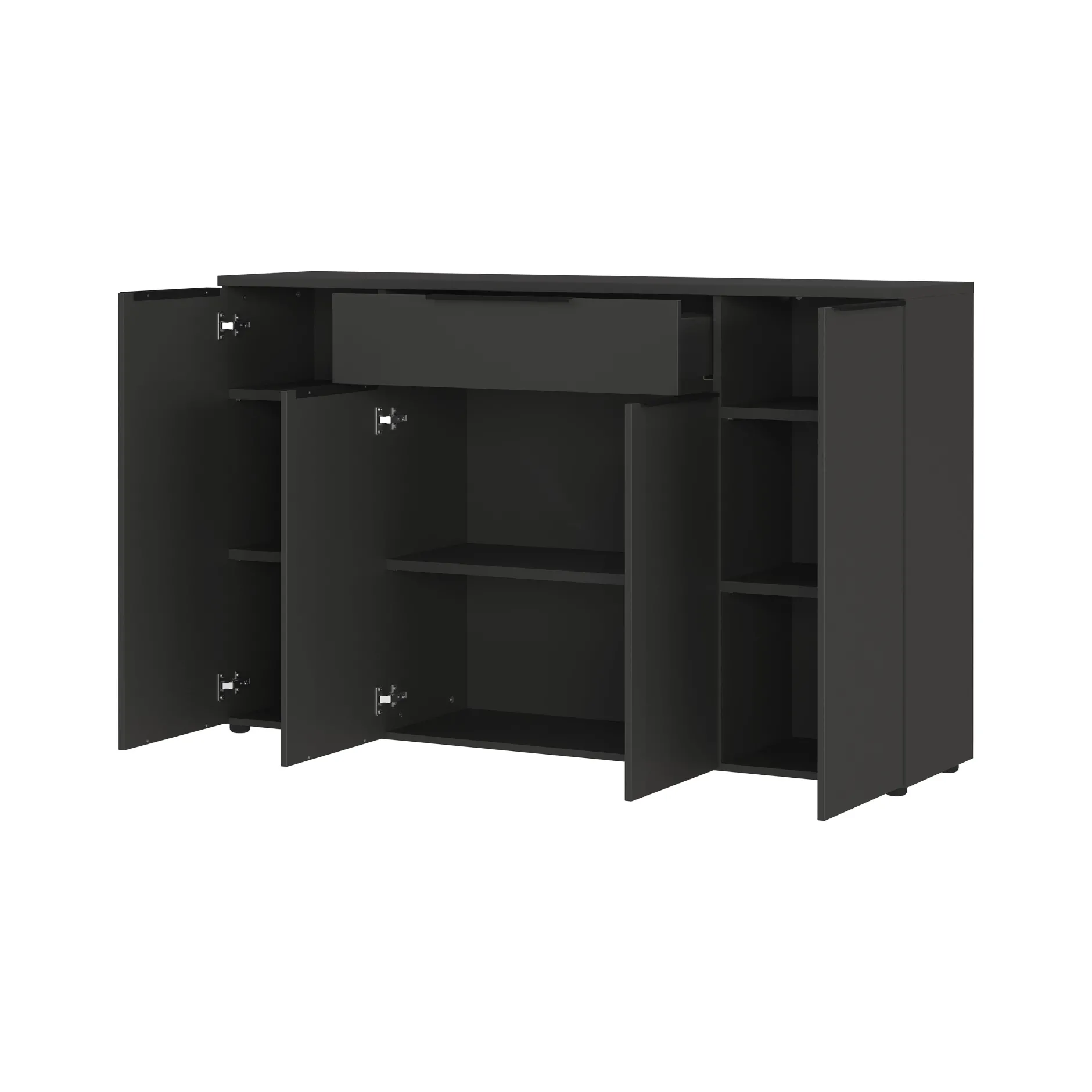 Het Dressoir Galileo Grafiet is een stijlvol en functioneel meubelstuk voor elke ruimte. Met één lade en vier deuren biedt dit dressoir voldoende opbergruimte voor diverse spullen. Achter de deuren bevinden zich in totaal vijf verstelbare planken, die elk tot 10 kg kunnen dragen. De bovenste plank is belastbaar tot 10 kg, terwijl de onderste plank tot 30 kg kan dragen.
