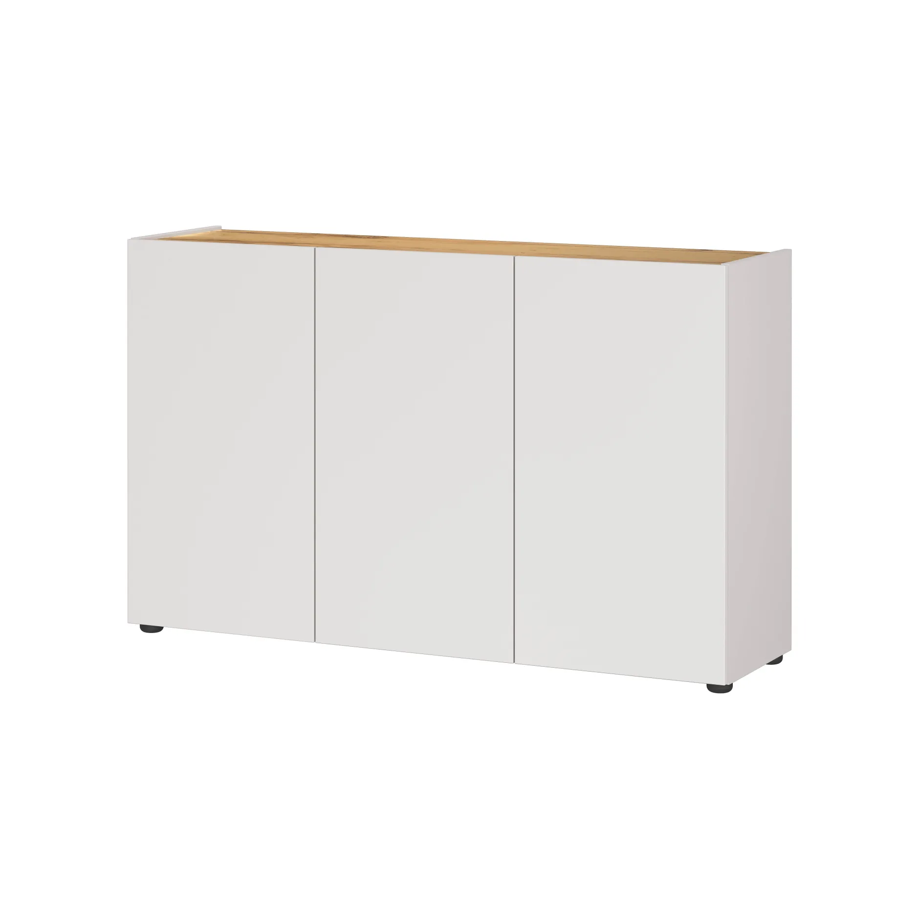 Het dressoir Orlando Kasjmier 120 cm combineert een eigentijds ontwerp met praktische opbergruimte. Het meubel heeft drie deuren met daarachter verstelbare planken, belastbaar tot 10 kg per plank. De handgreeploze deuren sluiten zacht dankzij de geïntegreerde demping. De kasjmier en Navarra eiken afwerking zorgen voor een warme, moderne uitstraling.