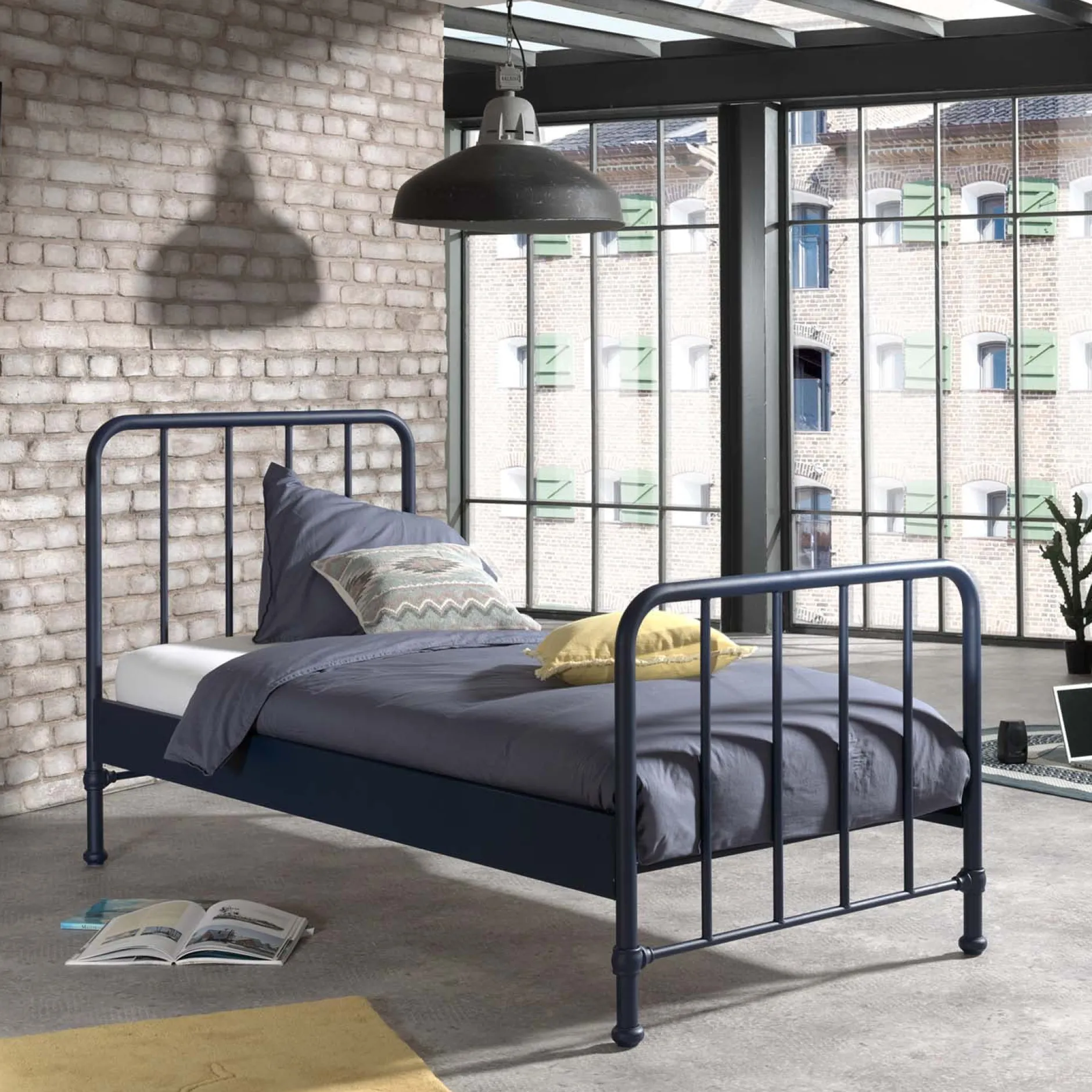 Dit metalen industriële kinderbed is afgewerkt met een mat blauwe poederlak. Geschikt voor elke matras van 90×200 cm. Met dit bed heb je een hedendaagse look die in combinatie met zijn degelijke design nog lang meegaat. Het bed wordt geleverd inclusief lattenbodem en is goed te combineren met de rest van deze serie!