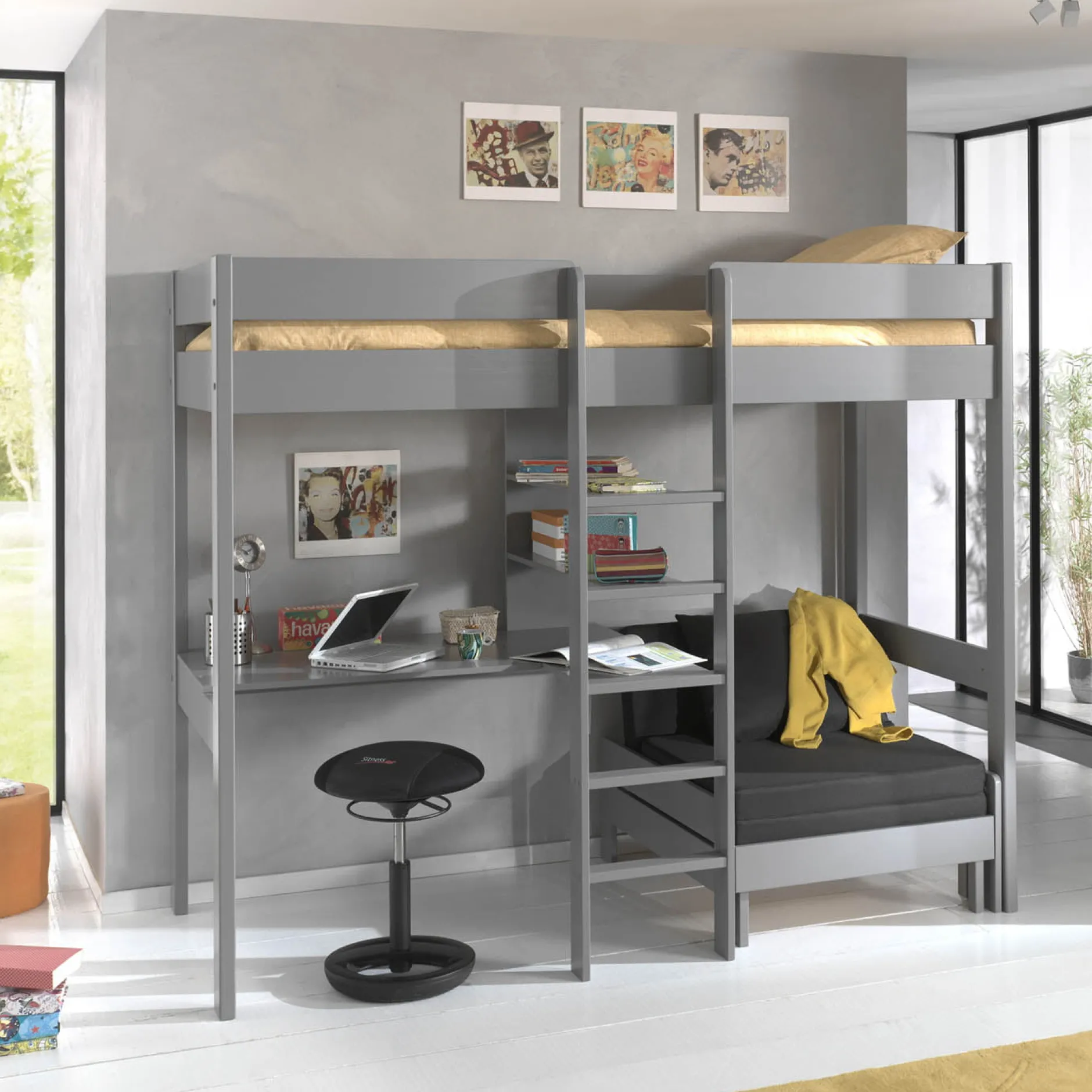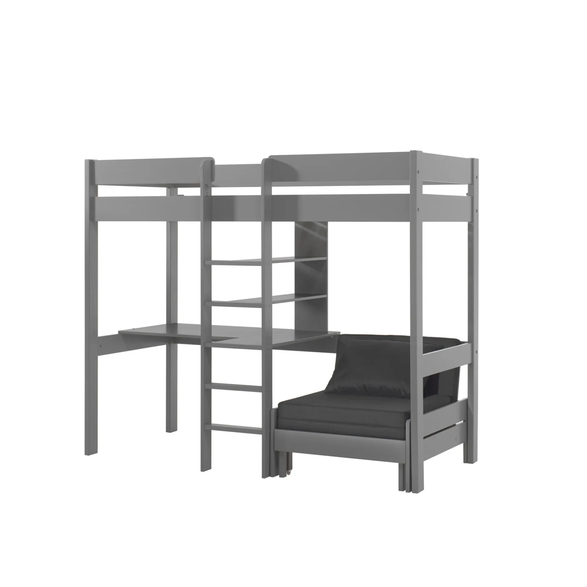 Deze multifunctionele hoogslaper is een aanwinst voor elke kinderkamer. De hoogslaper is vervaardigd uit Scandinavisch grenen en is grijs gelakt. Links van de trap is een bureaublad met aan de rechterzijde 2 planken om al je spullen op kwijt te kunnen. Rechts van de trap is een zetelbed, deze kan gebruikt worden om op te zitten of uitgeschoven worden om te gebruiken als logeerbed. Het is ook mogelijk dit om te wisselen. De lattenbodems en de matras van het zetelbed zijn inbegrepen. In het bed past een matras van 90×200 cm.