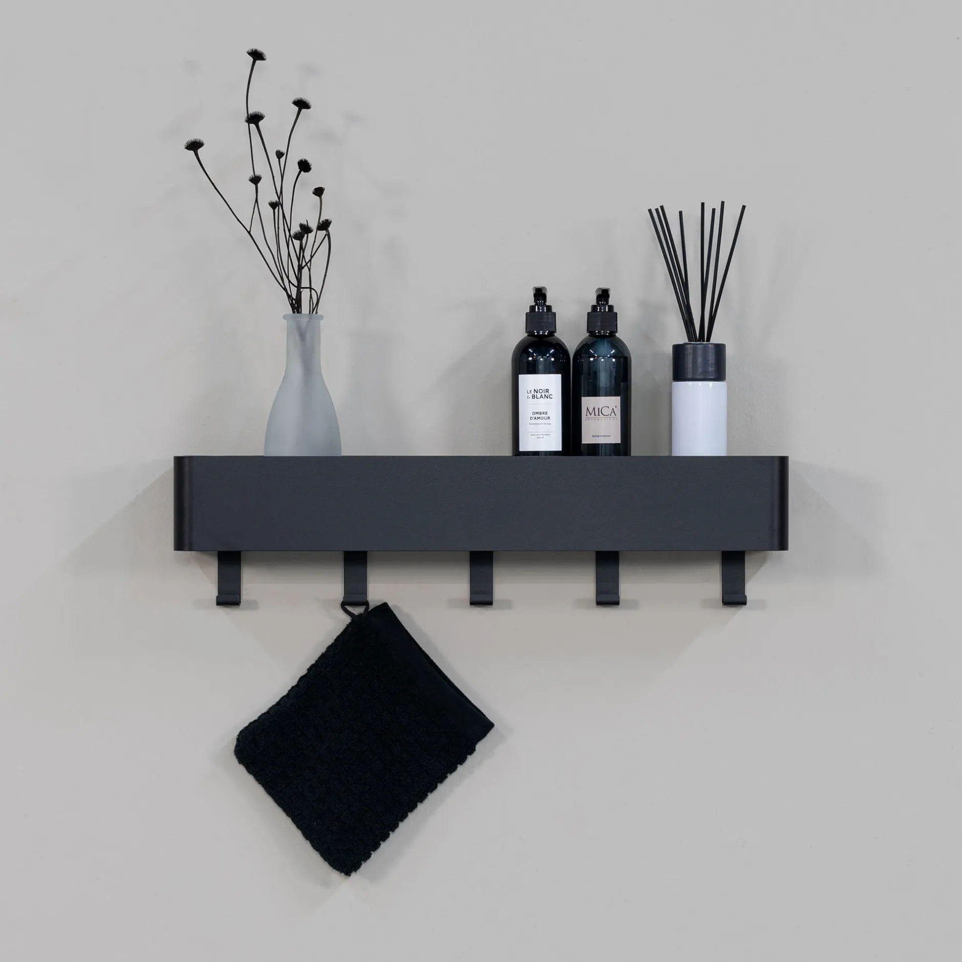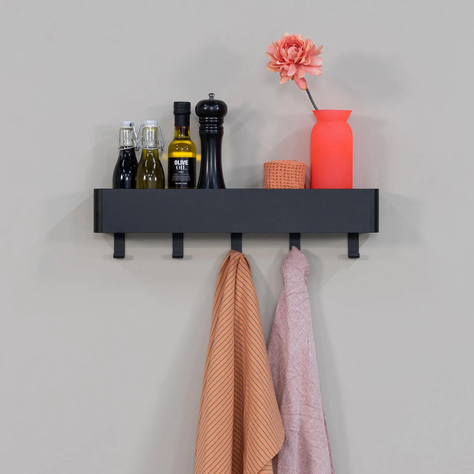 Optimaliseer je ruimte met de Kapstok Alfie Zwart 5-haaks – een buitengewoon veelzijdige wandplank en kapstok in één!