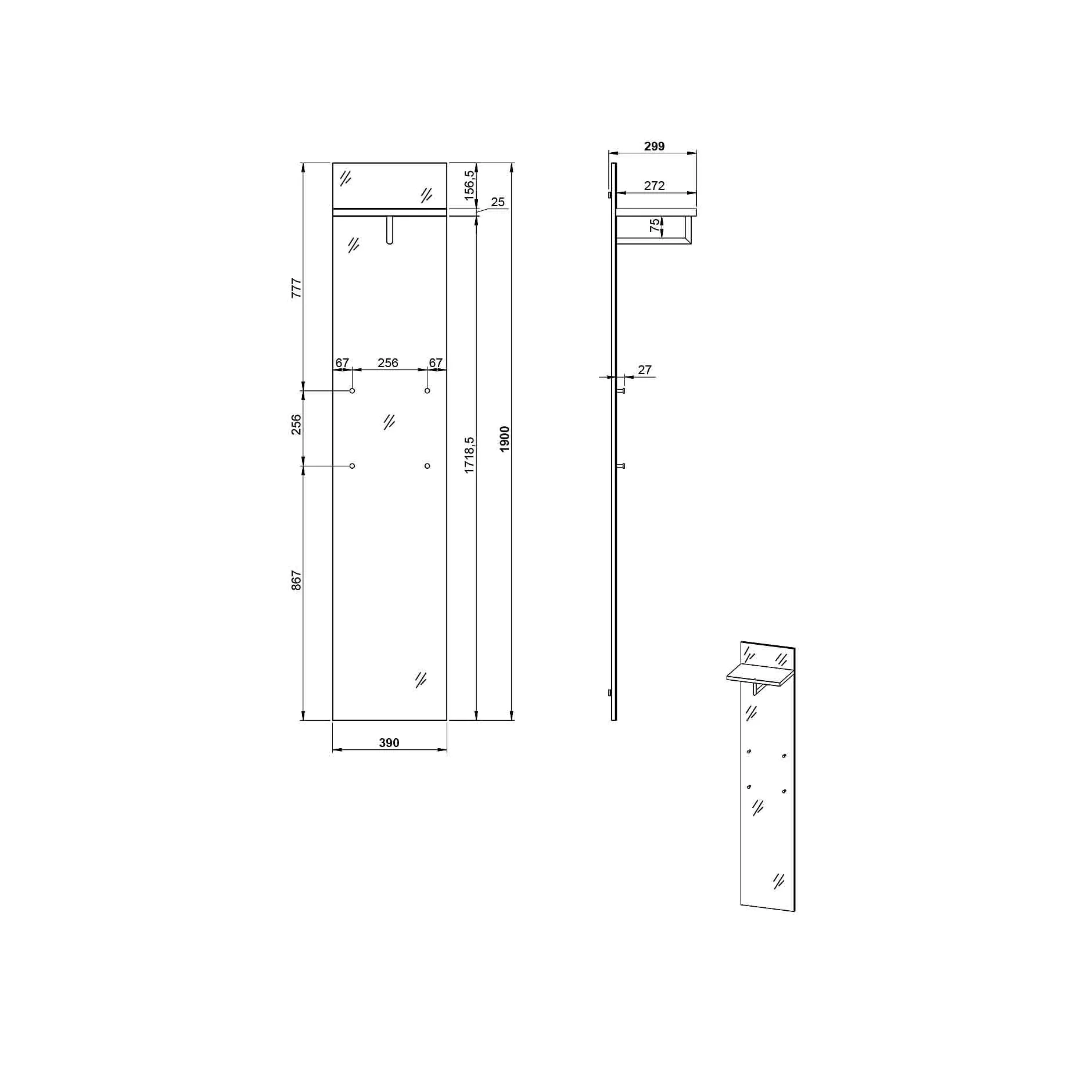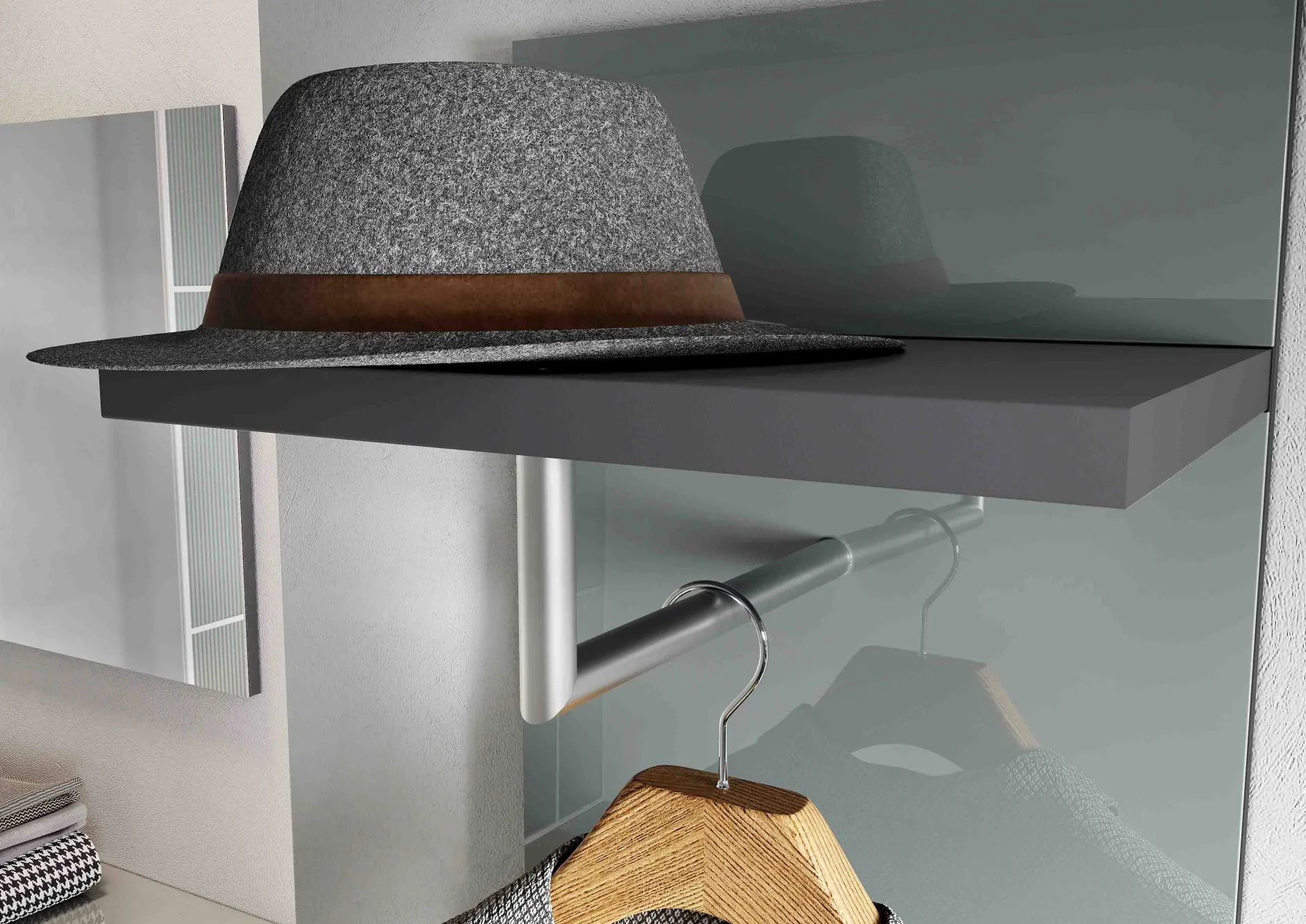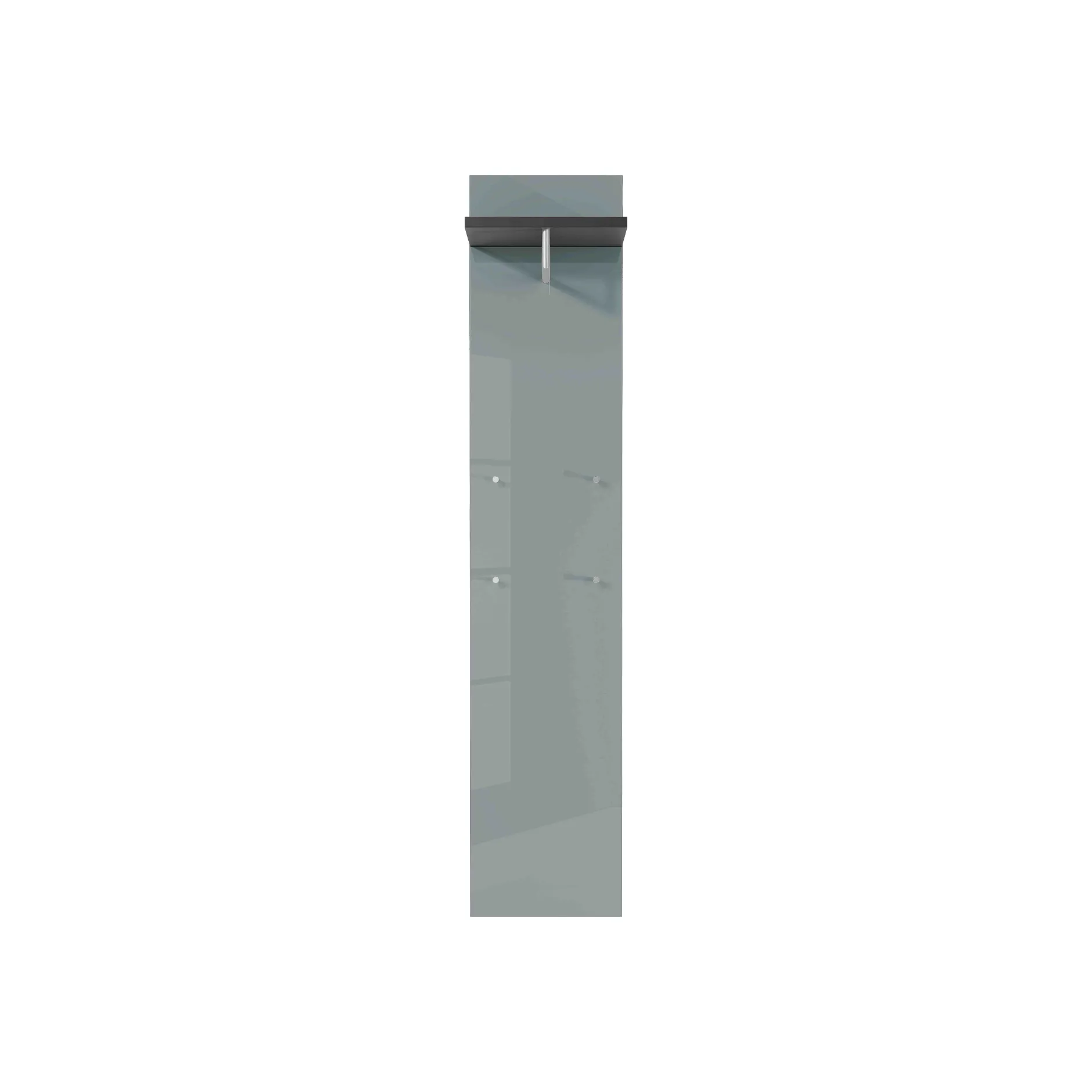 Design kapstokpaneel met 1 opbergplank voor het opbergen van hoeden of petten, onder deze opbergplank bevindt zich de kledingroede om jassen aan een kledinghanger te kunnen hangen. Daarnaast beschikt dit kapstokpaneel nog over 4 chromen metalen haken om allerlei accessoires aan op te hangen. De glazen zilvergrijze glasplaat maakt dit meubel helemaal af.