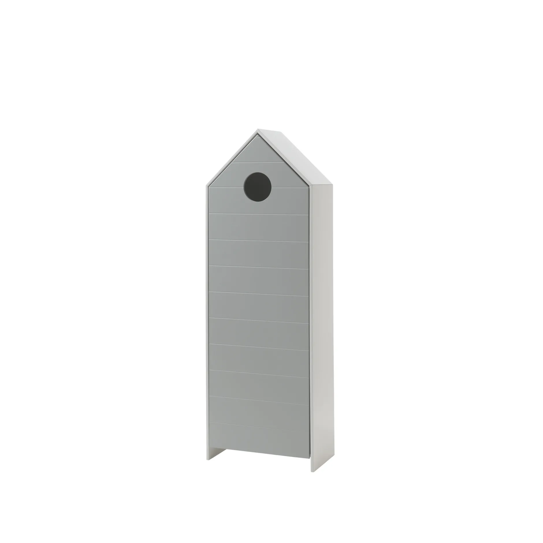Deze speelse kledingkast is een aanwinst voor in elke kinderkamer. De kast is vervaardigd uit MDF en afgewerkt in een witte lak, de deur is afgewerkt met een grijze lak. Achter de deur bevinden zich 3 legplanken, naar wens kunnen 1 of 2 legplanken weggelaten worden om de bijgeleverde kledinghanger te gebruiken. Richt je gehele kinderkamer in met alle meubelen uit deze serie!