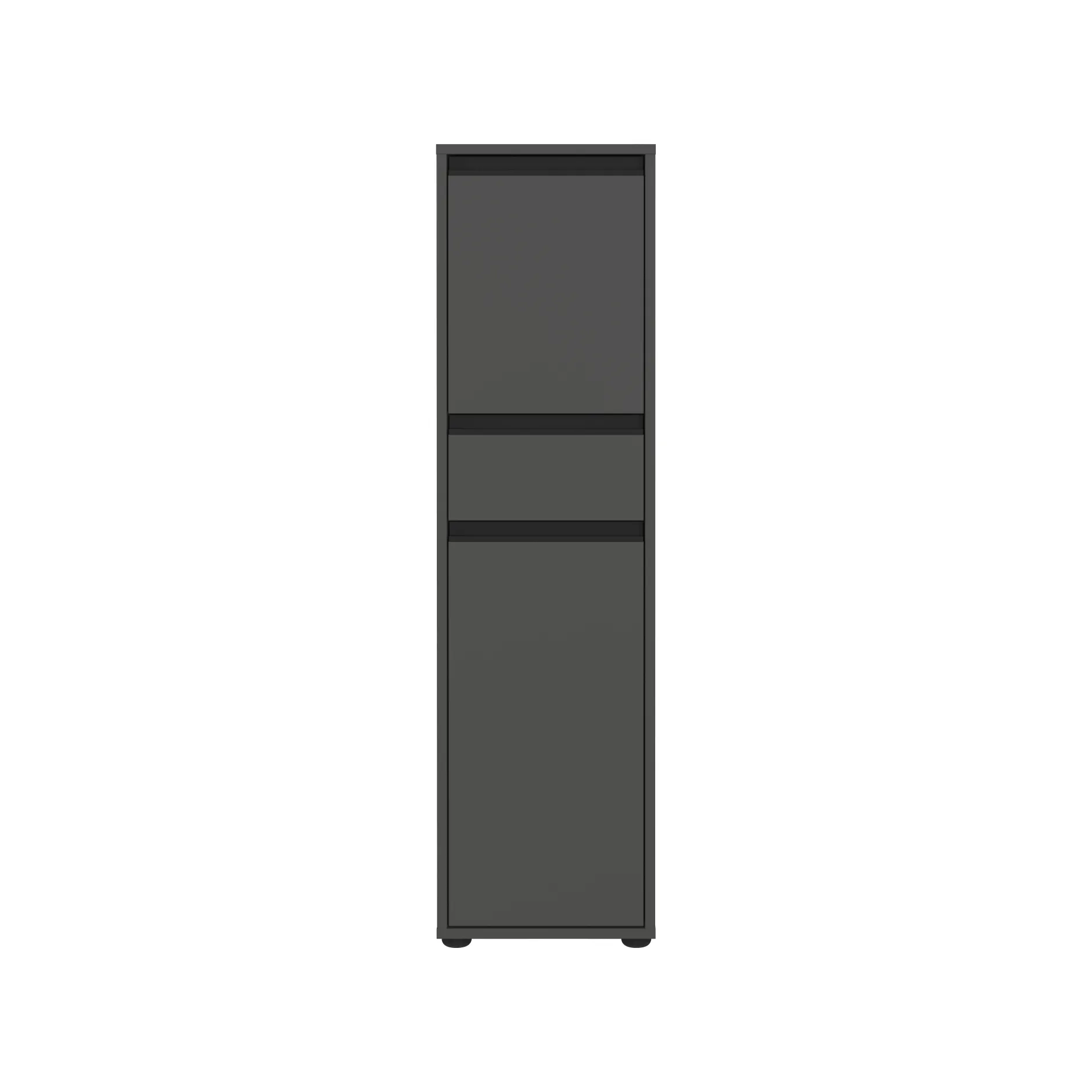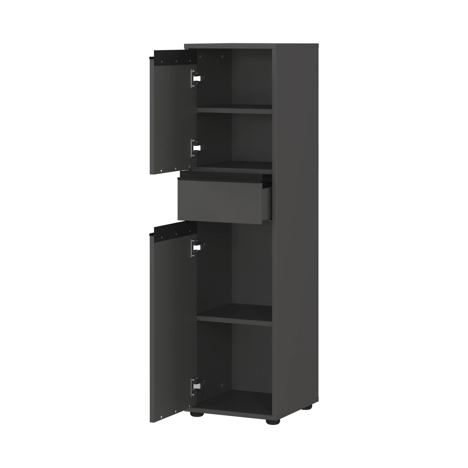 De kolomkast Pula Grafiet 121 cm biedt maximale opbergruimte in een slank ontwerp. Dit meubel bevat een lade, twee deuren met verstelbare planken en een boven- en onderplank. Alle planken en de lade zijn belastbaar tot 10 kg. De kast heeft drie zwarte metalen handgrepen en vier stevige kunststof meubelglijders. De krasbestendige melamine coating en de stootvaste ABS-randen maken het meubel zeer duurzaam. De deuren kunnen zowel links als rechts worden gemonteerd, terwijl de geïntegreerde demping zorgt voor een geruisloos sluitmechanisme.