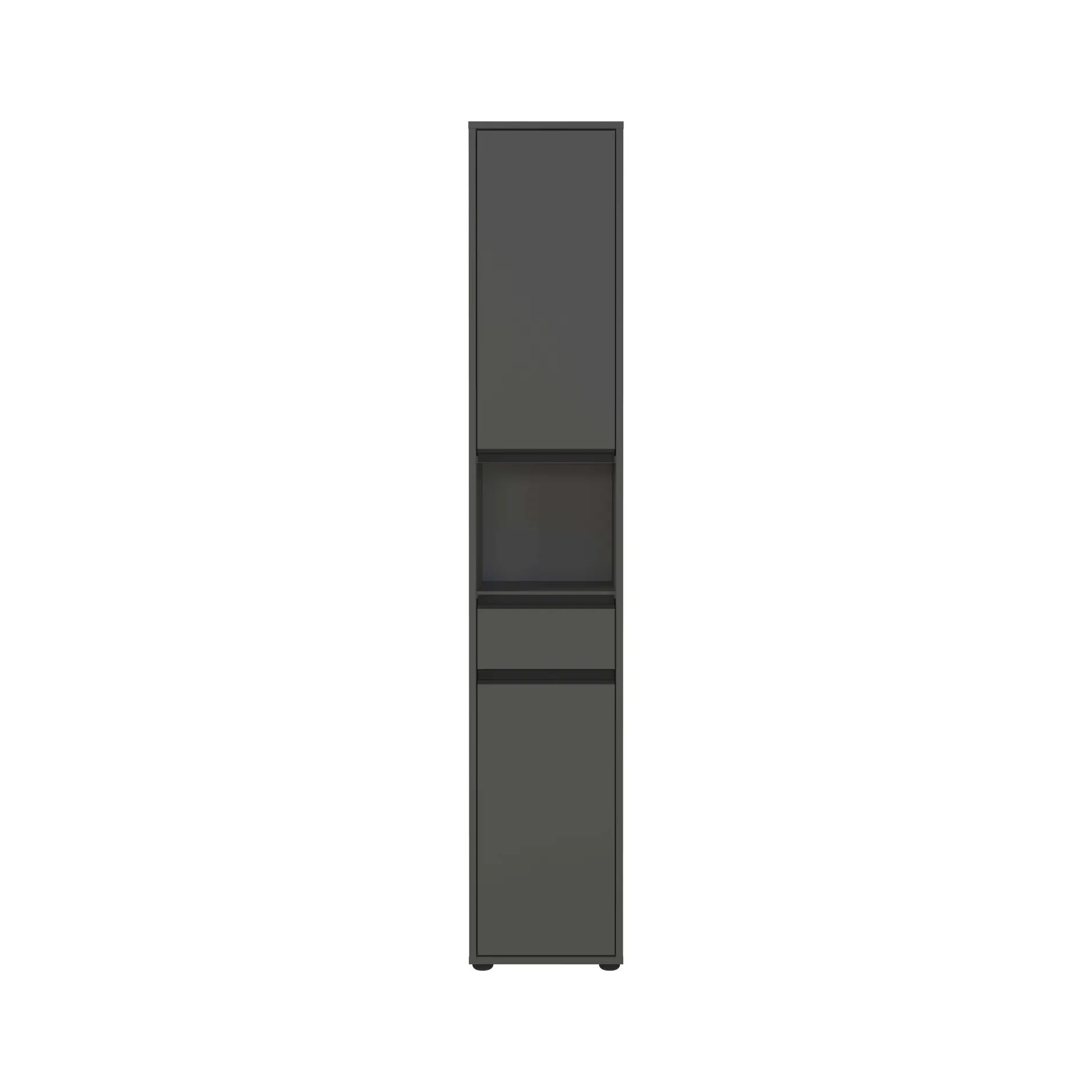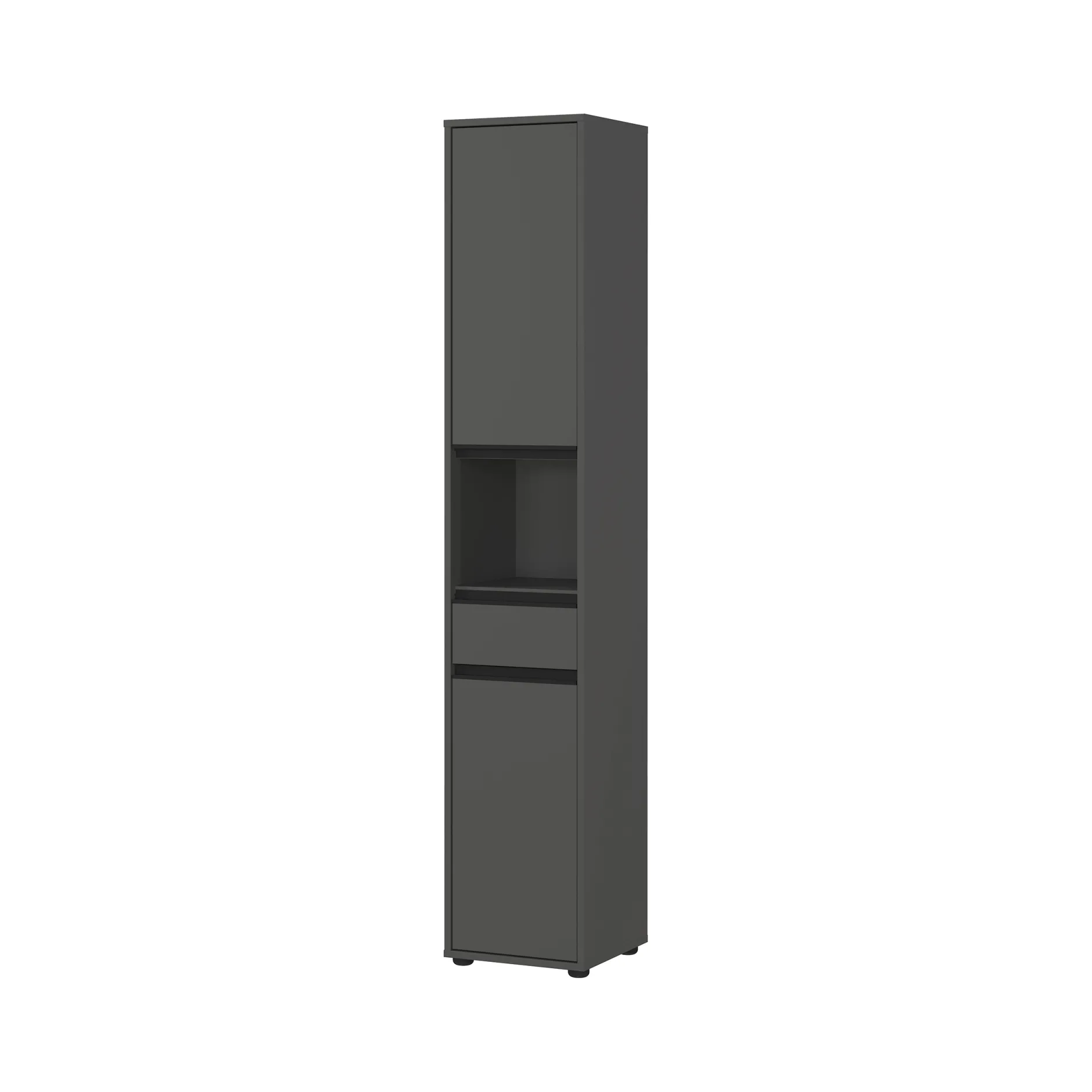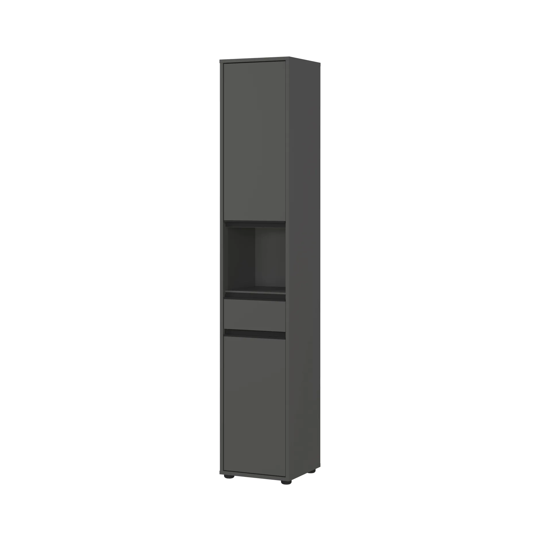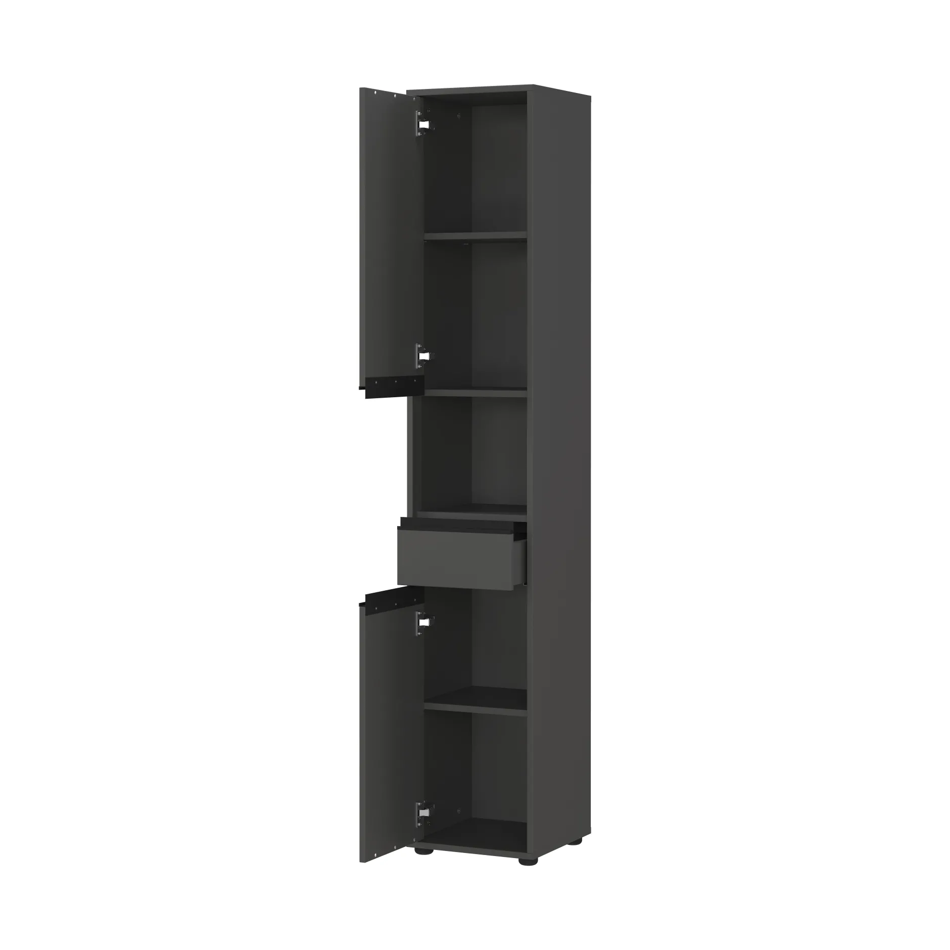 De kolomkast Pula Grafiet 181 cm is een hoge, slanke opbergoplossing met een eigentijdse uitstraling. Dit meubel beschikt over een lade, twee deuren met daarachter verstelbare planken en een open compartiment. De planken, lade en open ruimte kunnen elk tot 10 kg dragen. De kast is voorzien van drie zwarte metalen handgrepen en vier stevige kunststof meubelglijders. Dankzij de krasbestendige melamine coating en de stootvaste ABS-randen is dit meubel bestand tegen dagelijks gebruik. De deuren kunnen links of rechts worden gemonteerd voor extra flexibiliteit, terwijl de geïntegreerde demping een geruisloze sluiting garandeert.