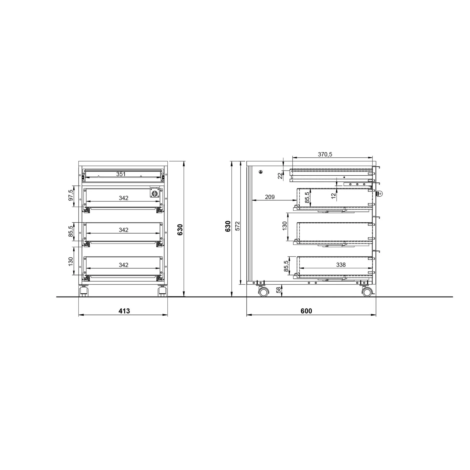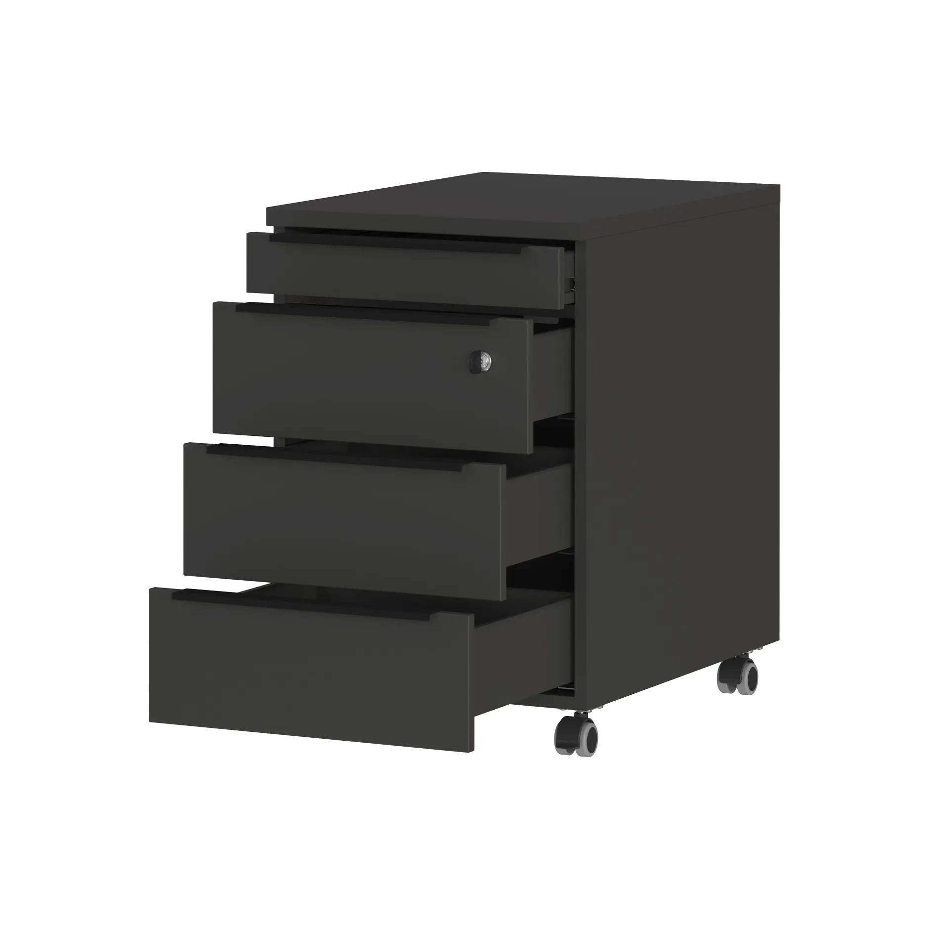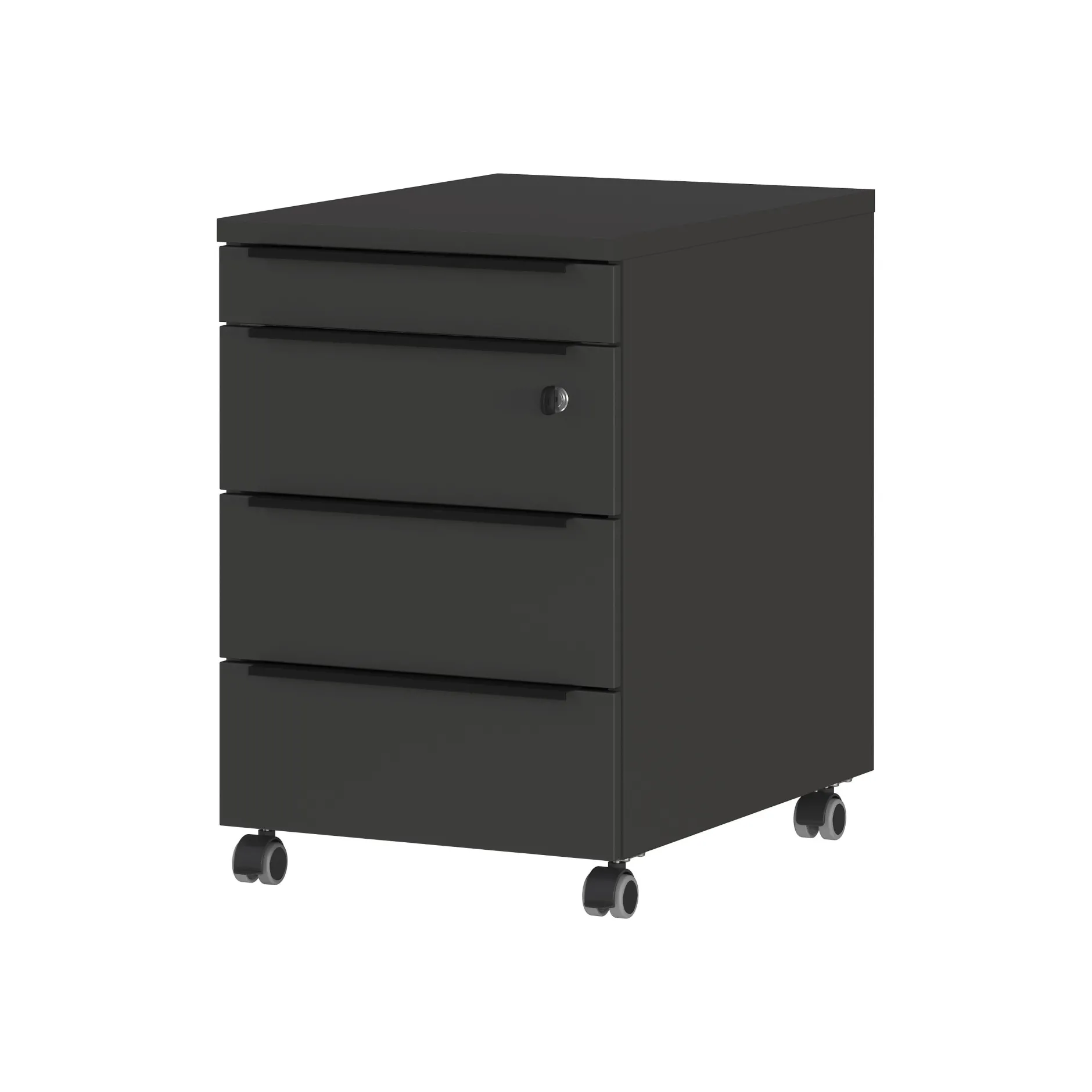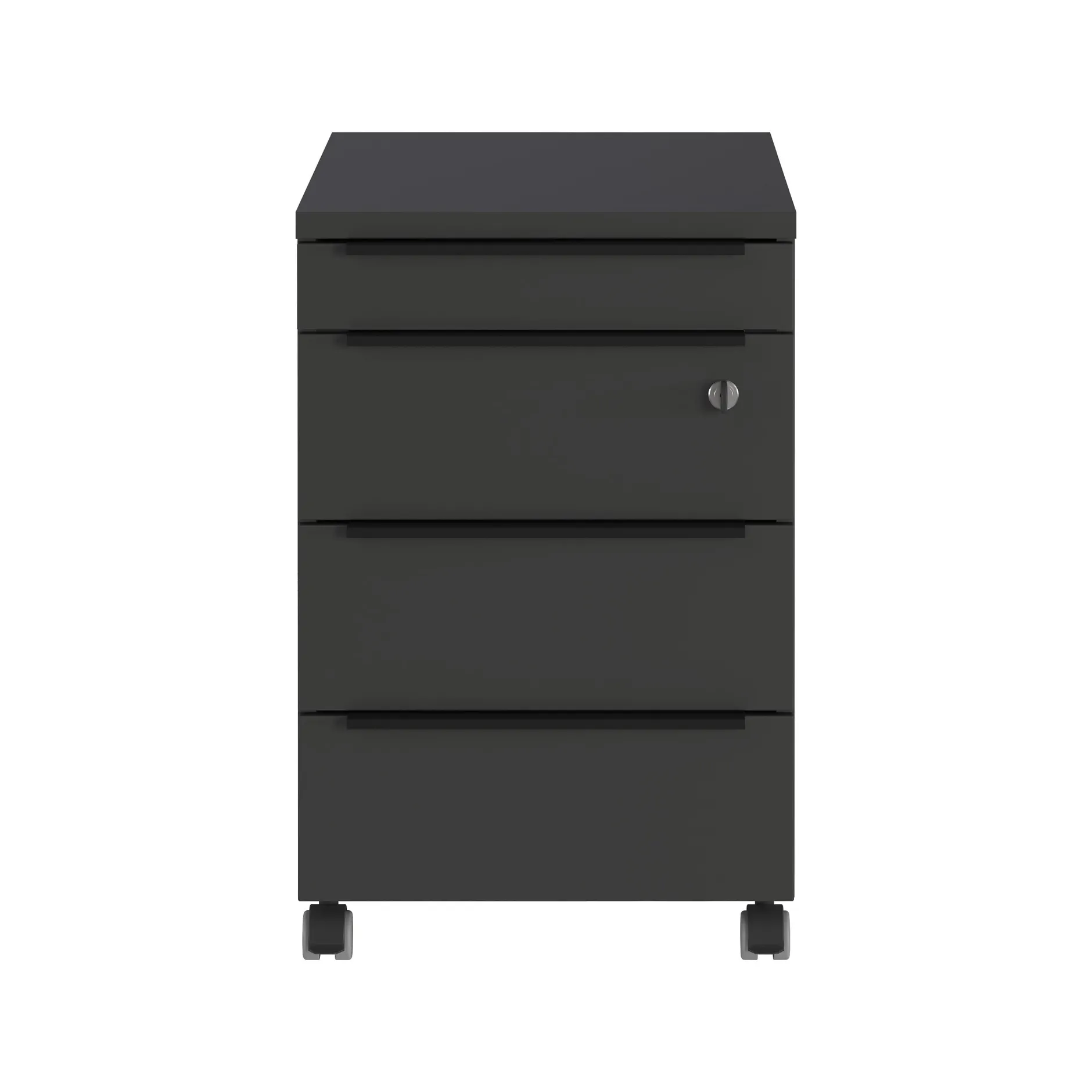Dit ladeblok is uitgevoerd in de kleur grafiet en heeft vier zwarte handgrepen van poeder gecoat metaal. Dankzij de vier rubberen zwenkwielen, waarvan er twee vergrendelbaar zijn, is dit ladeblok gemakkelijk te verplaatsen en te vergrendelen.