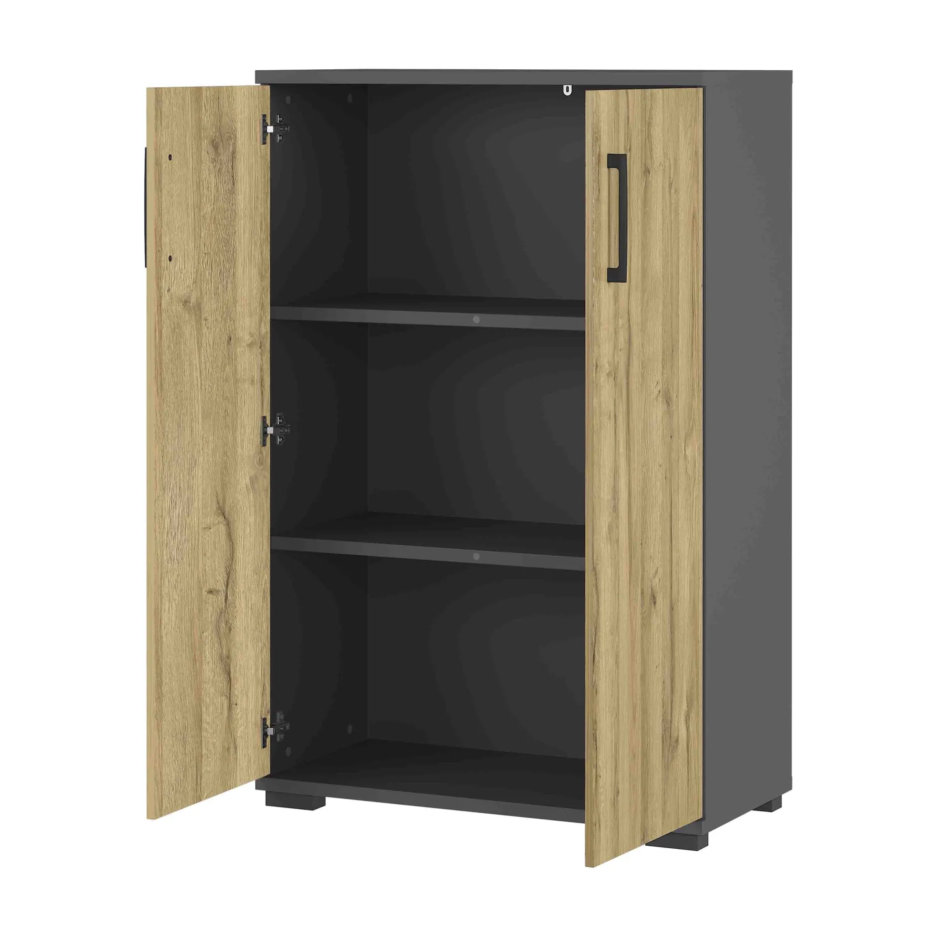 Deze lage dichte kantoorkast is 80cm breed, 123cm hoog en 40cm diep en heeft achter de twee openslaande deuren twee legplanken. Deze kast is uitermate geschikt voor het opbergen van ordners, mappen of boeken en biedt veel opbergruimte voor al uw andere (kantoor)spullen.