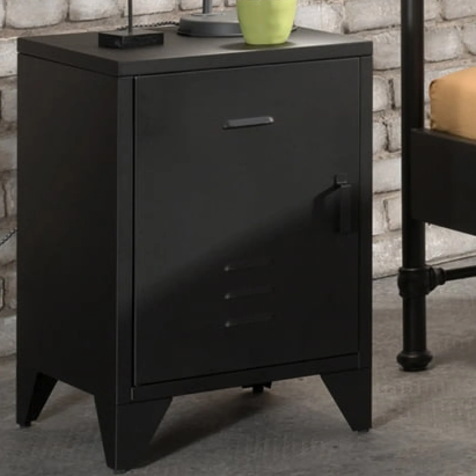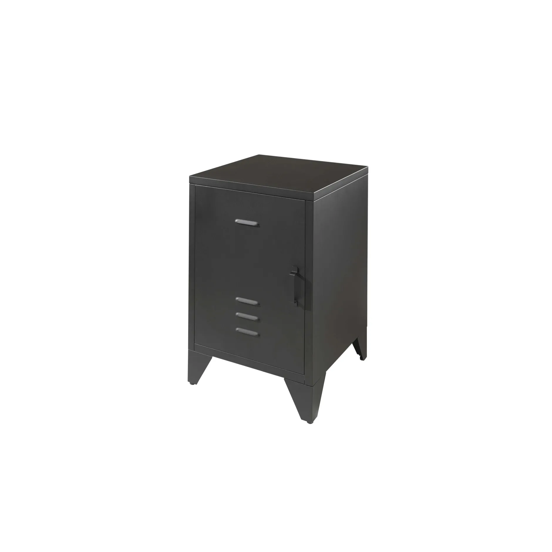 Dit metalen industriële nachtkastje is afgewerkt met een mat zwarte poederlak. Achter het deurtje bevindt zich 1 legplank om al je spullen in kwijt te kunnen. Verkrijgbaar in verschillende kleuren en goed te combineren met de rest van deze serie.