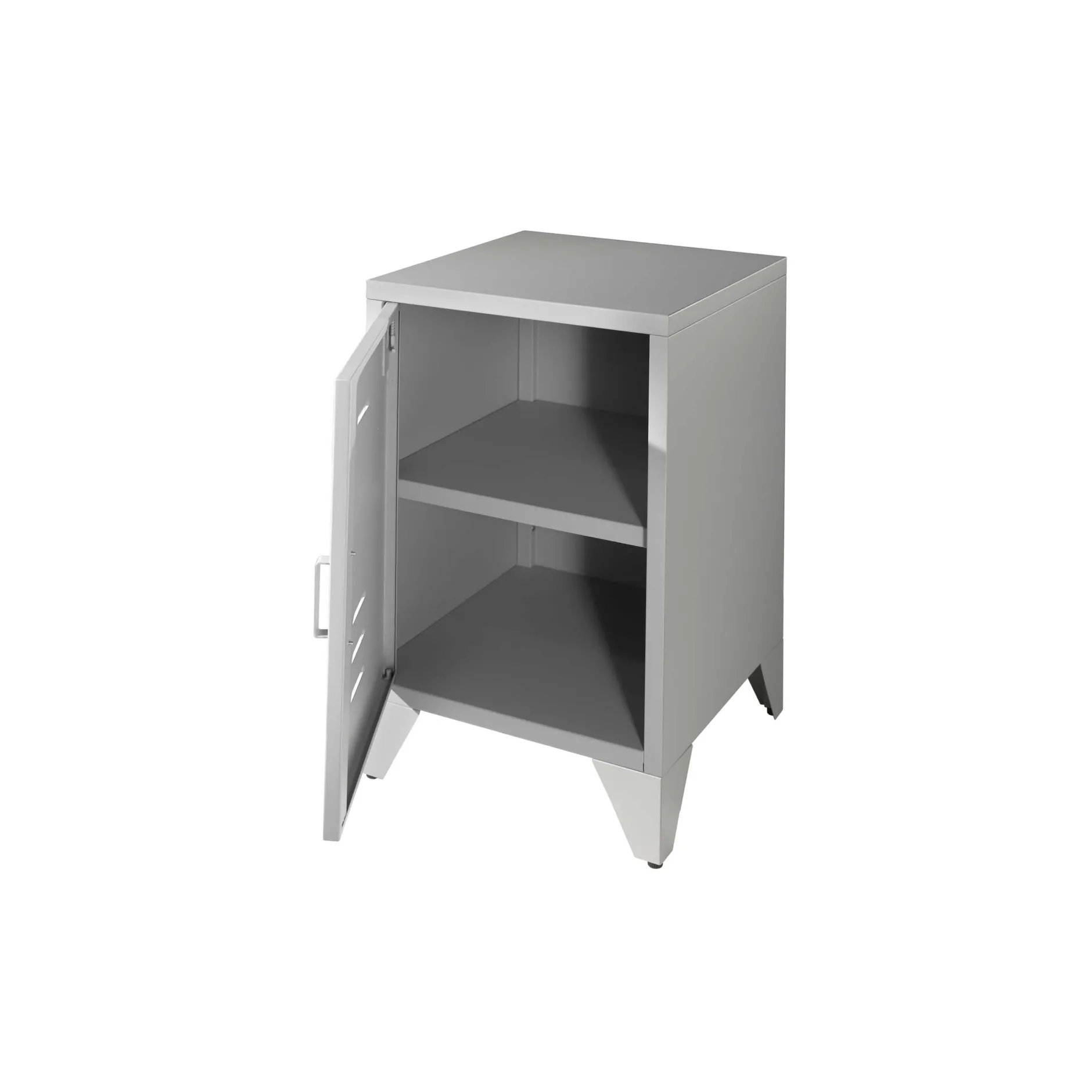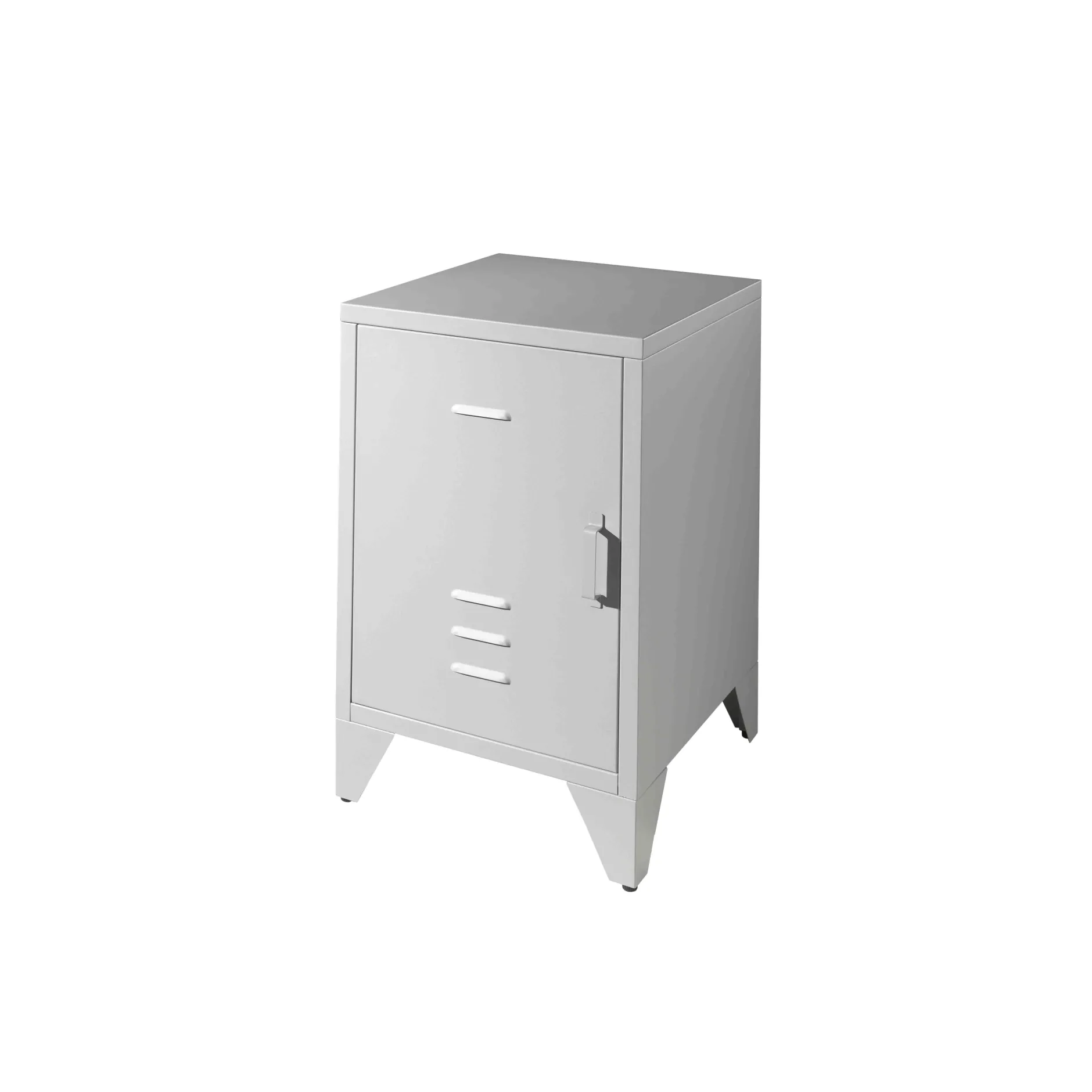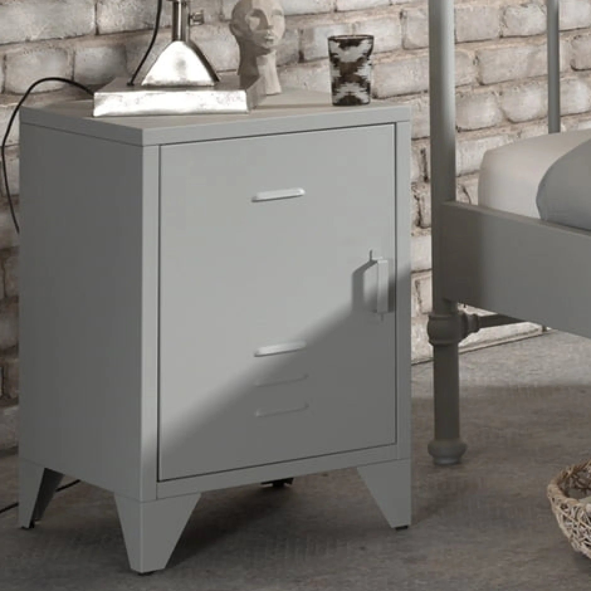 Dit metalen industriële nachtkastje is afgewerkt met een mat grijze poederlak. Achter het deurtje bevindt zich 1 legplank om al je spullen in kwijt te kunnen. Verkrijgbaar in verschillende kleuren en goed te combineren met de rest van deze serie.
